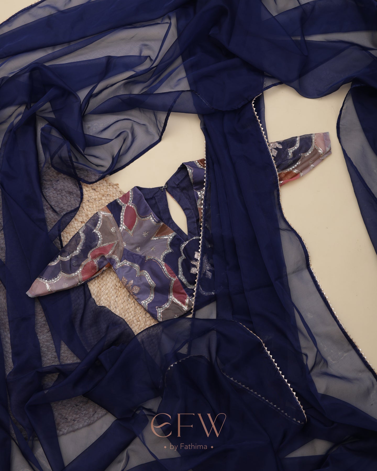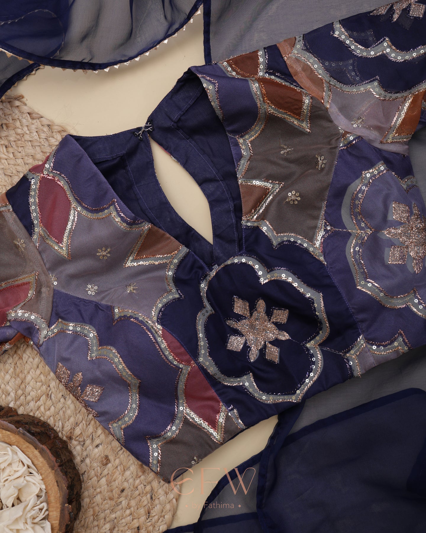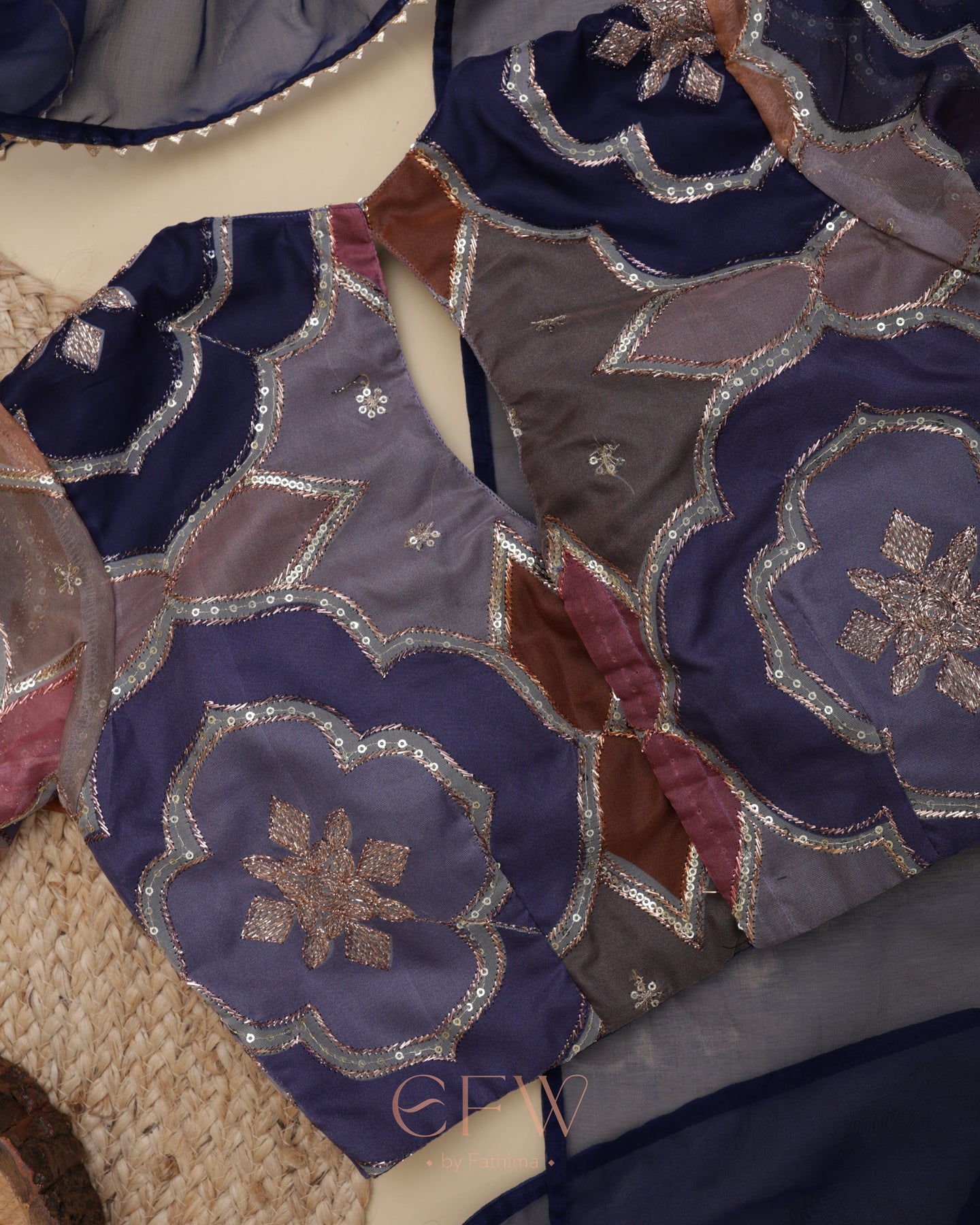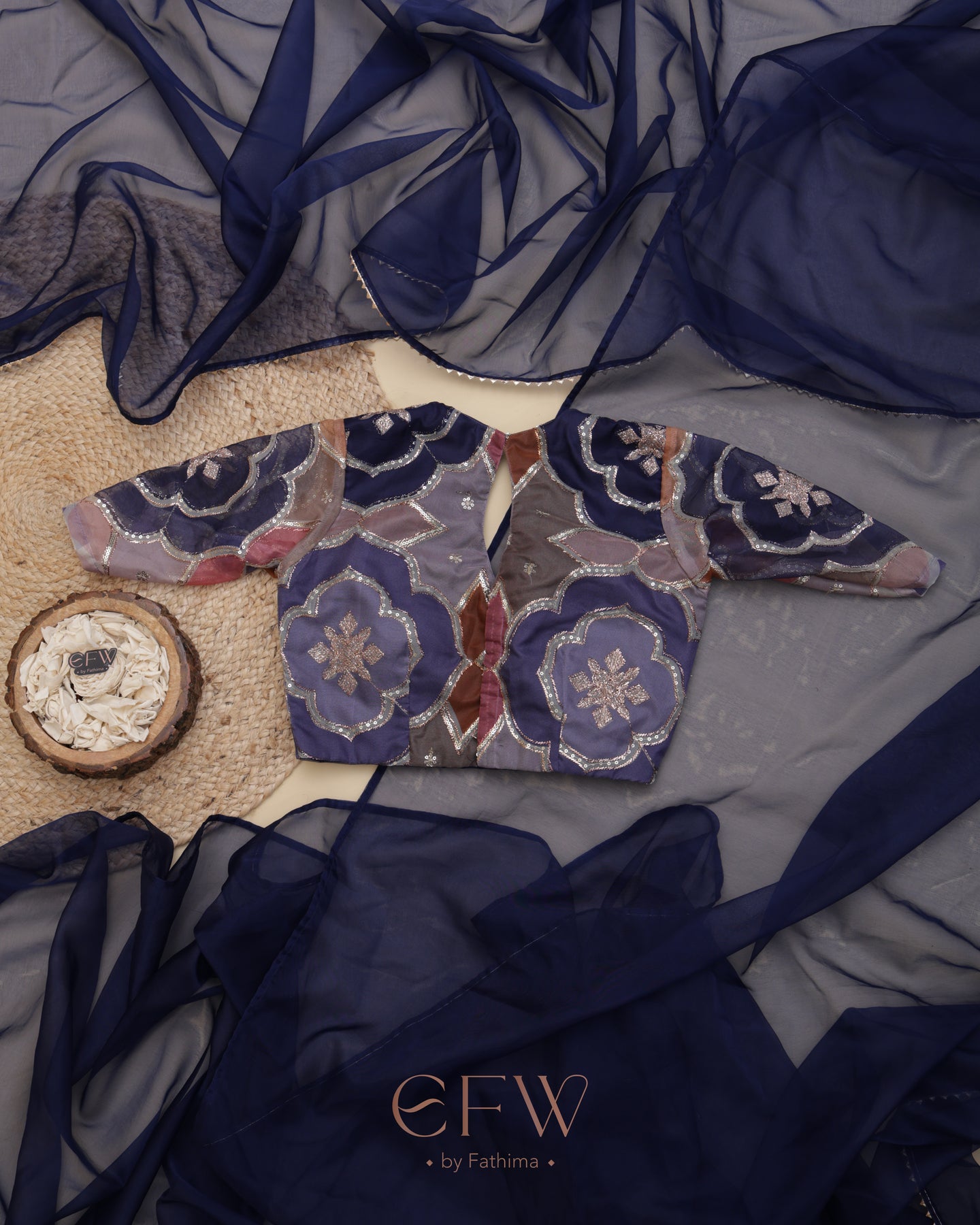 Step into the festival of lights with the Deepotsav Neel Jharokha Saree Set. The saree is a sheer midnight-blue with a soft glow and crisp fall, finished with a delicate gold gota edging that twinkles like rows of diyas. The statement blouse features jharokha-style panels in jewel tones—lilac, rose, copper and plum—outlined with sequins and metallic trims, plus tiny starbursts that echo rangoli sparkle. Elegant, modern, and made for Diwali evenings.
