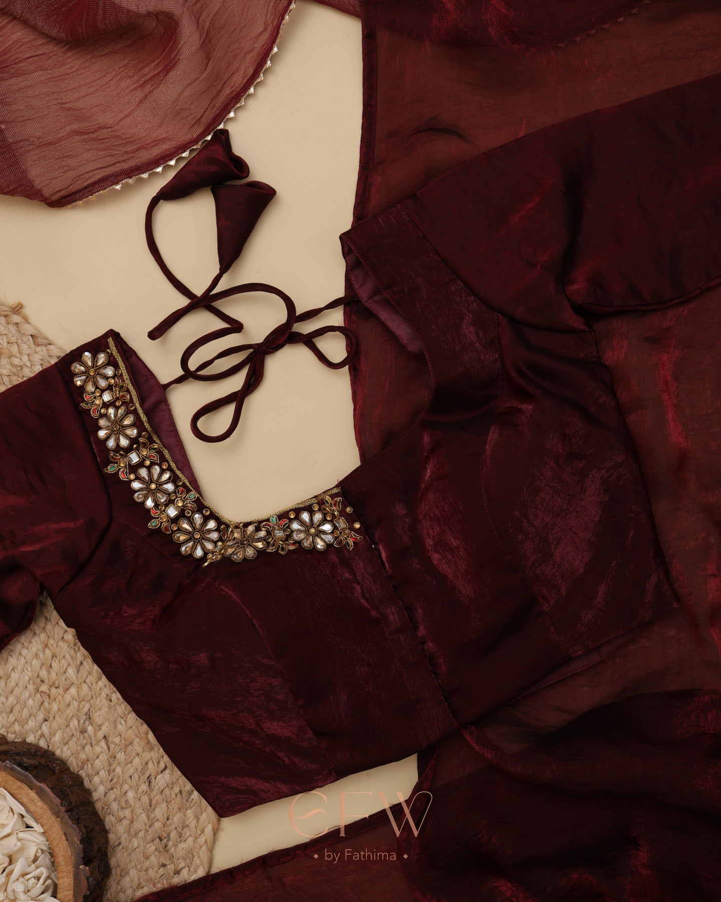 Maroon shimmer saree with scallop edge & a jewel-floral neckline blouse