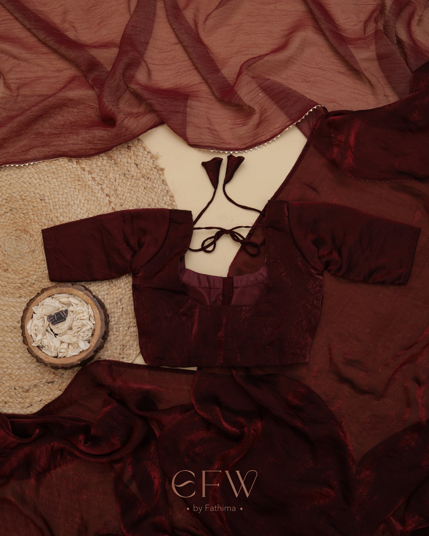 Saree: Maroon drape with subtle shimmer and scallop edging