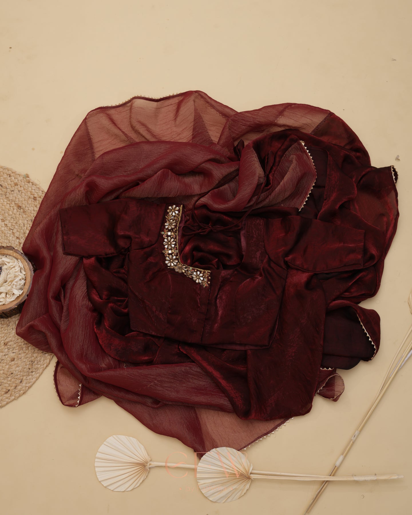 Illuminate your festivities in the Garnet Diya Blossom Saree Set. The saree flows in a rich wine/burgundy with a soft metallic sheen and a delicate gota edging—elegant, minimal, and radiant under diya light. The blouse is the show-stopper: deep garnet with a hand-worked floral border along the U-neck, accented with mirror/sequence and metallic zari highlights, evoking Diwali pushp (flowers) and rows of lamps.