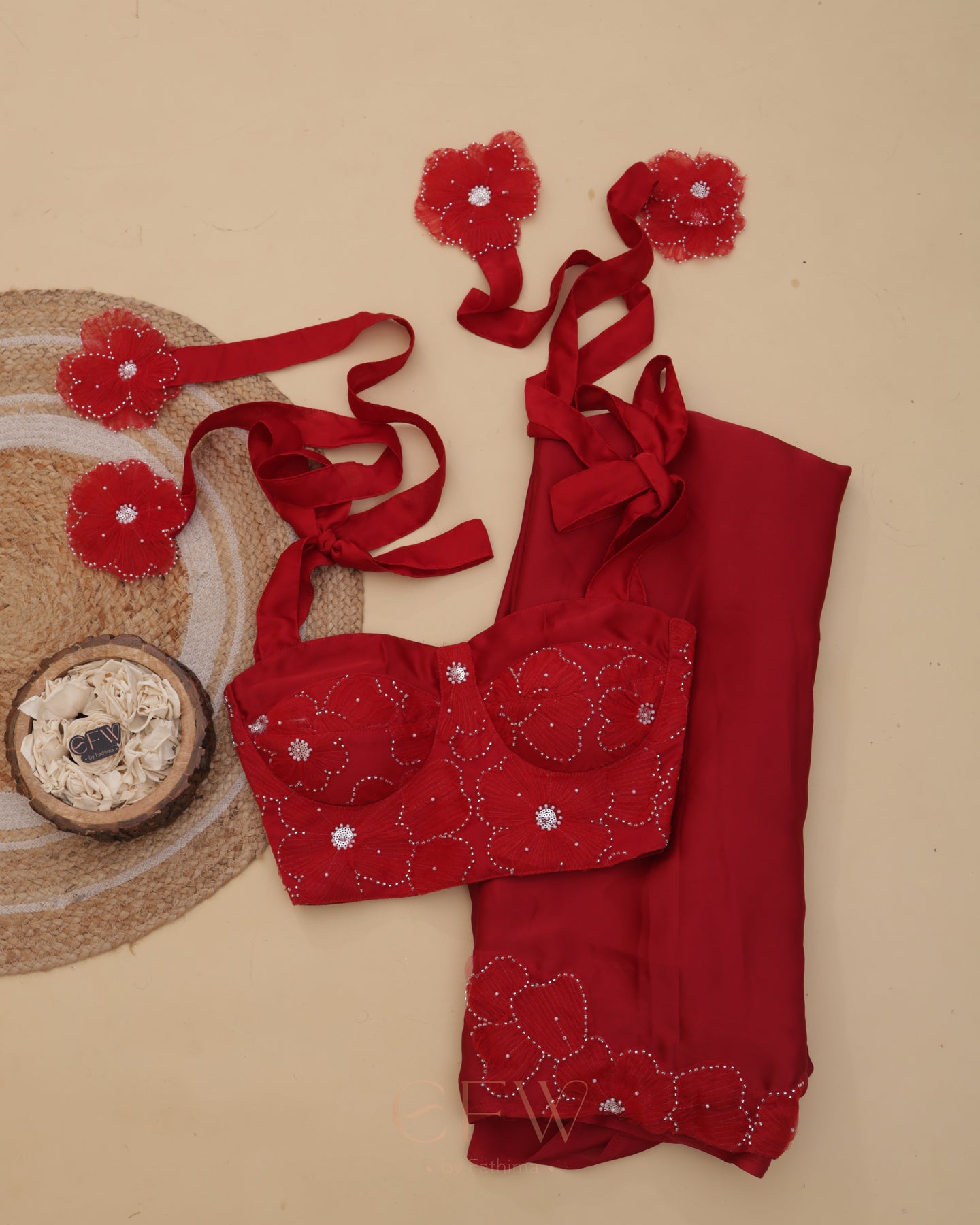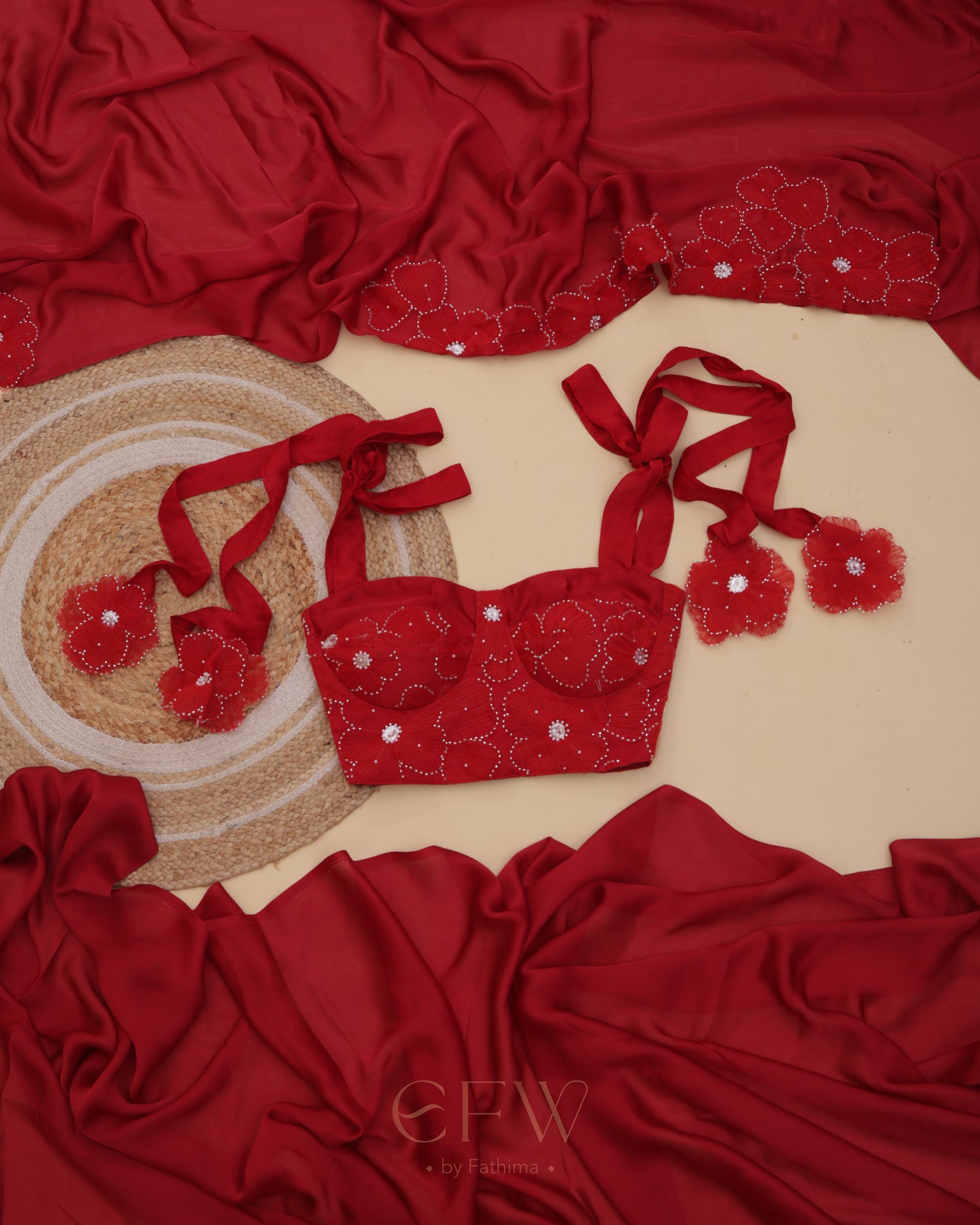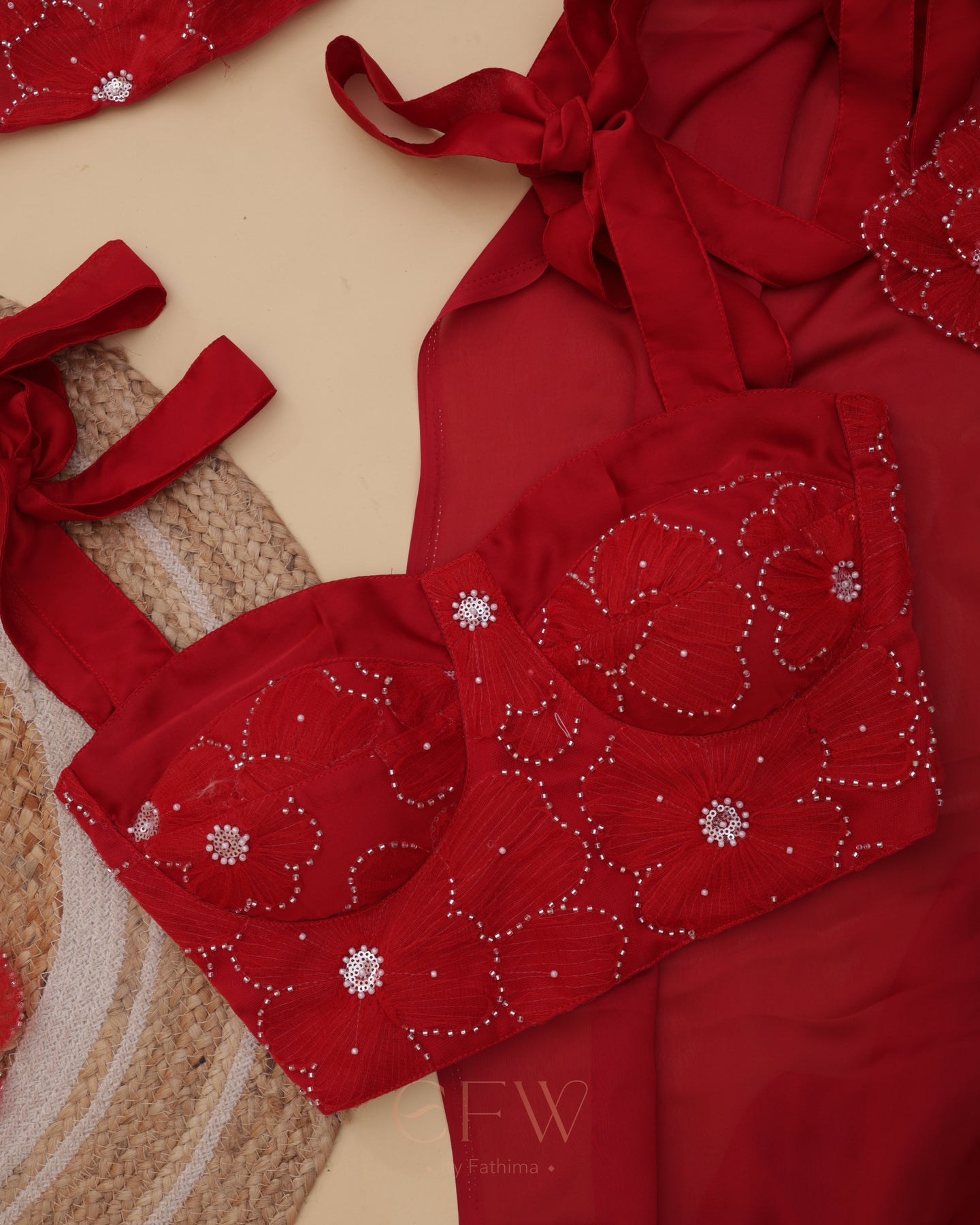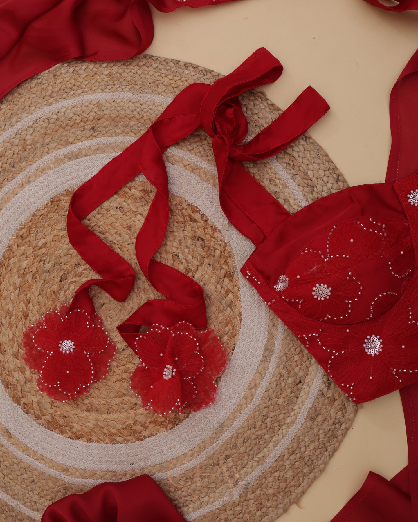 The blouse is richly adorned with hand-appliqued floral motifs in delicate organza petals, each centered with shimmering beadwork that catches the light beautifully. Intricate pearl and sequin embellishments trace the contours of the blossoms, lending an opulent sparkle to every movement. The structured cups and tailored fit provide flattering support, while the tie-back design offers a customizable fit and a touch of playful allure.