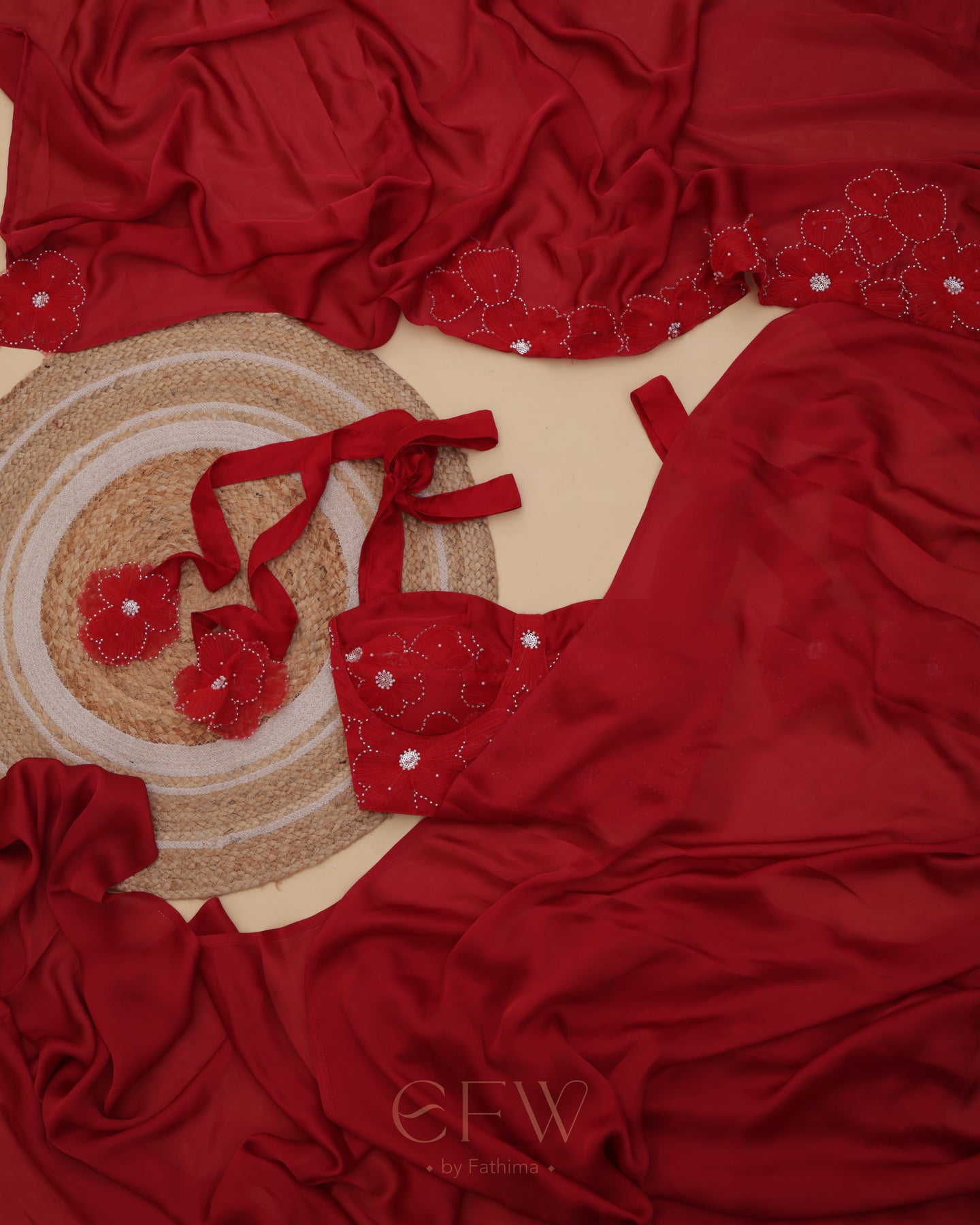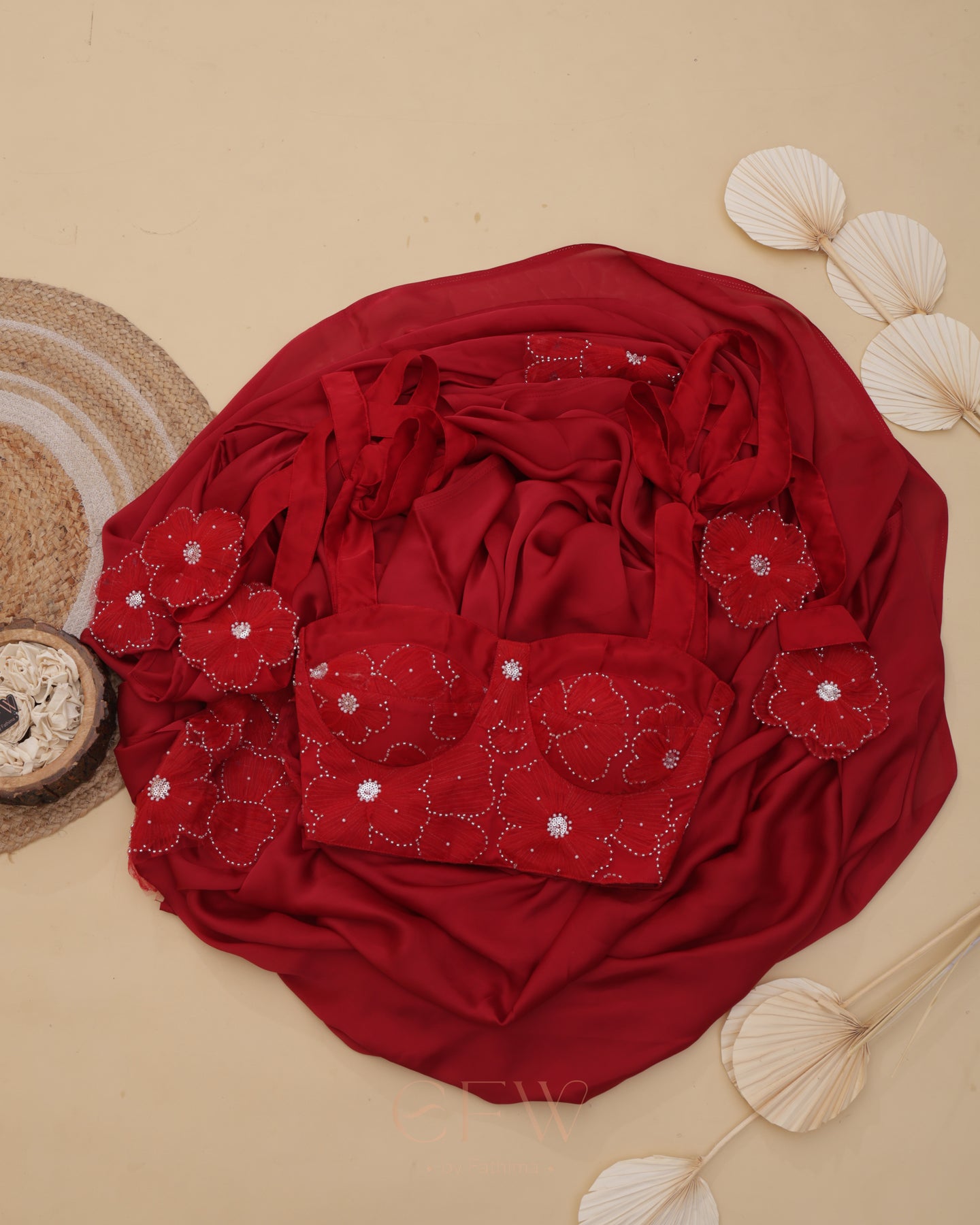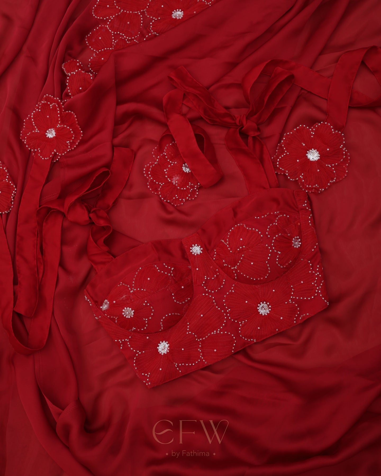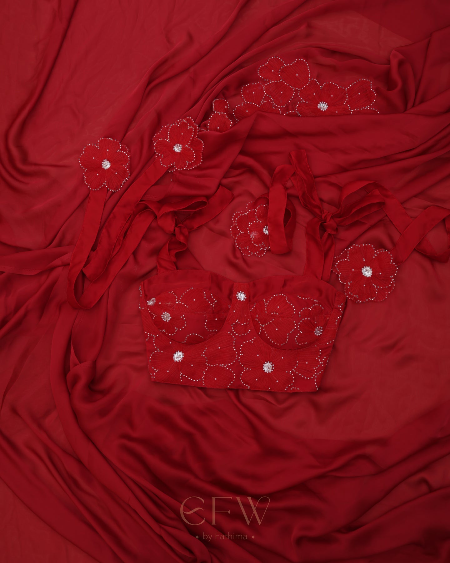 Elevate your festive elegance with Ishara, a stunning ensemble that radiates passion and poise. Crafted in a deep, luxurious red, this saree and blouse set captures the essence of celebration.