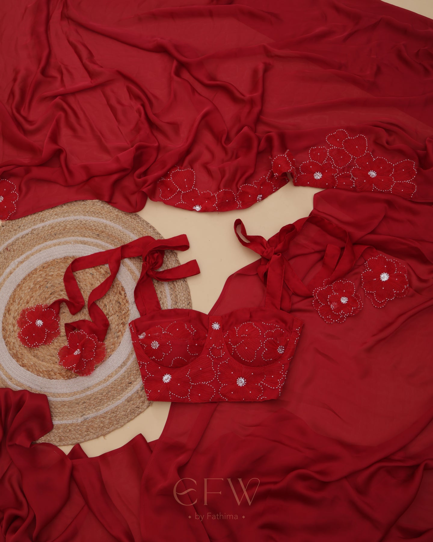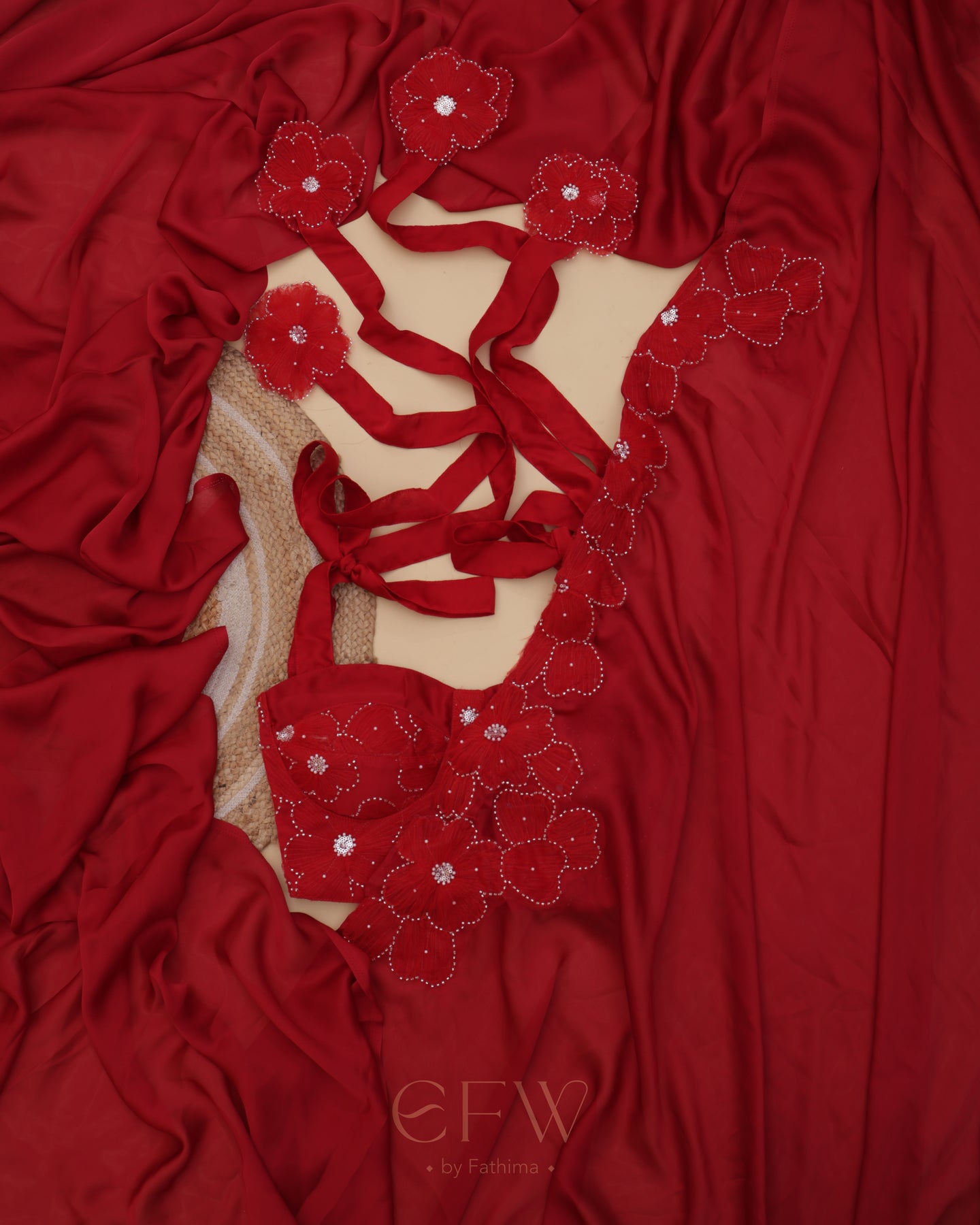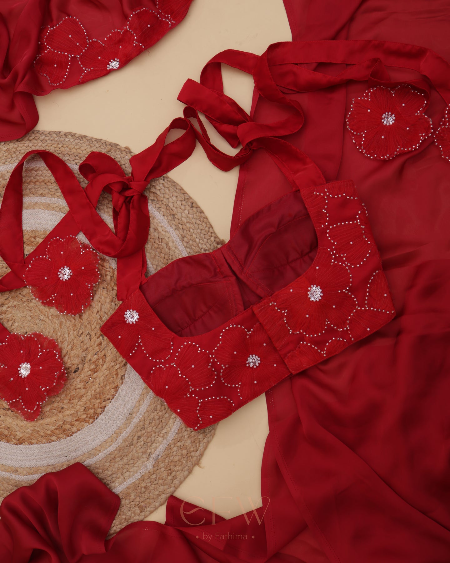 Elevate your festive elegance with Ishara, a stunning ensemble that radiates passion and poise. Crafted in a deep, luxurious red, this saree and blouse set captures the essence of celebration.