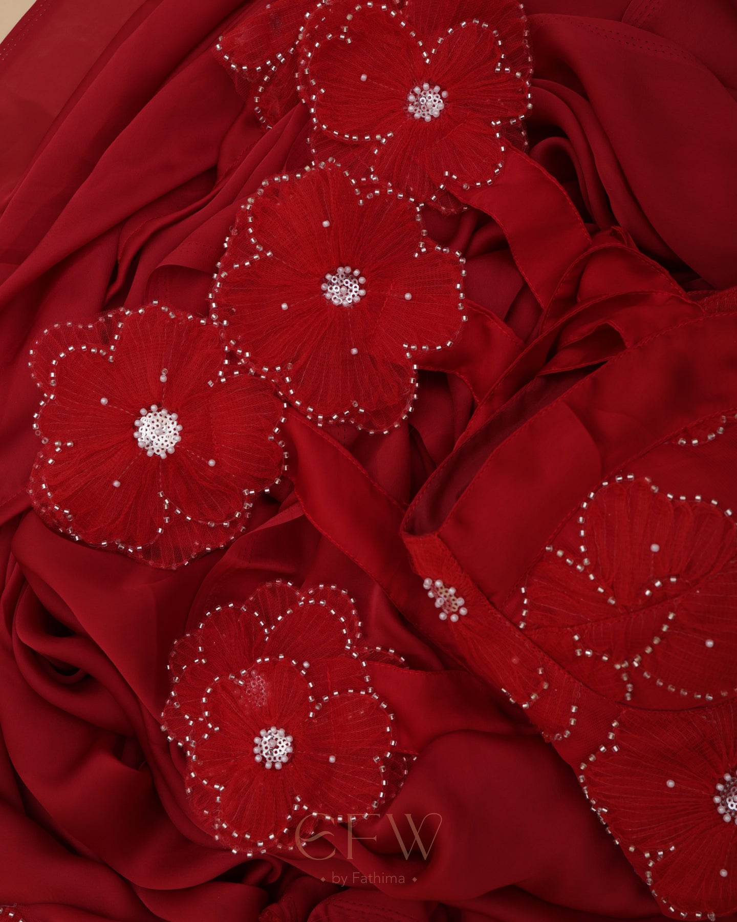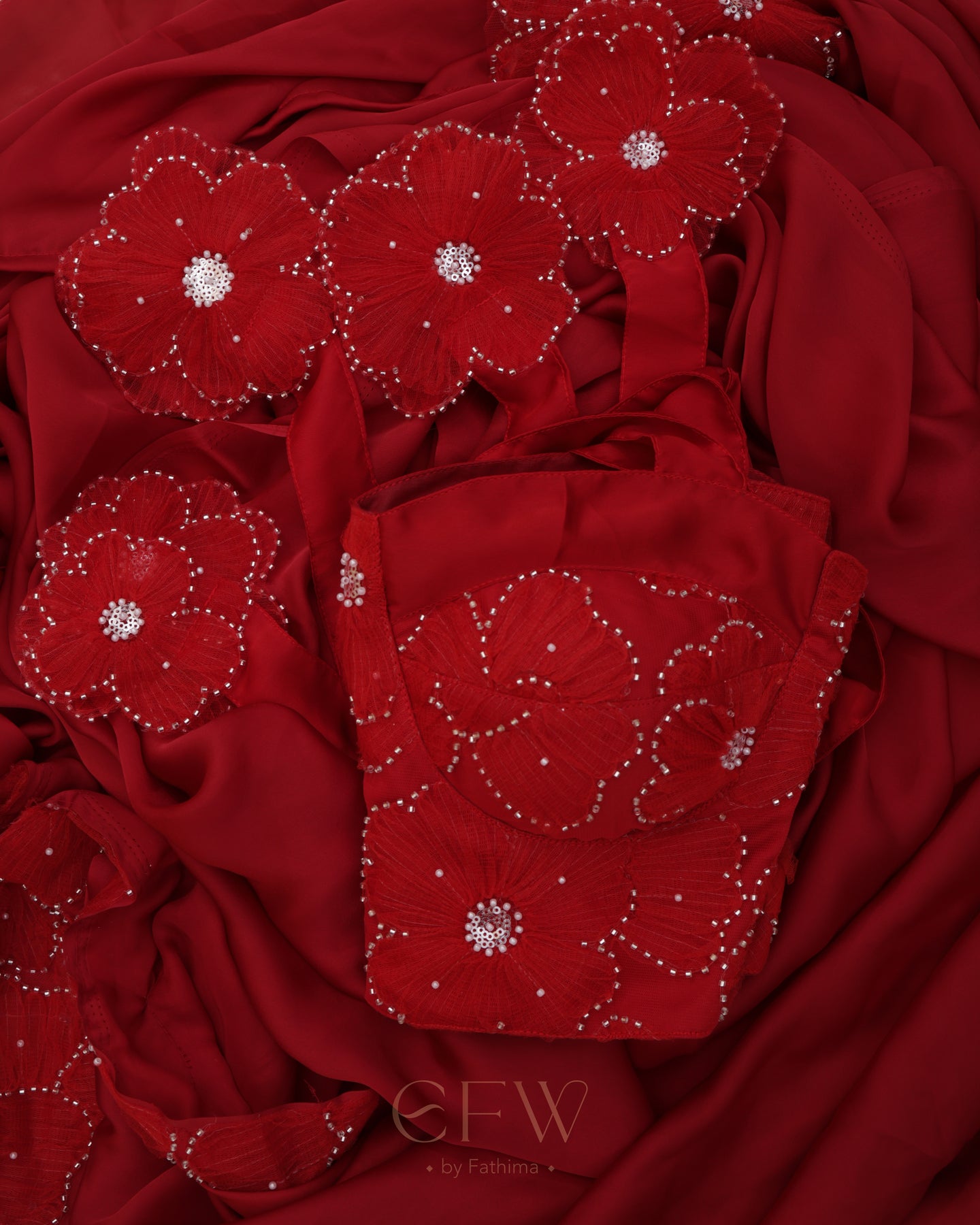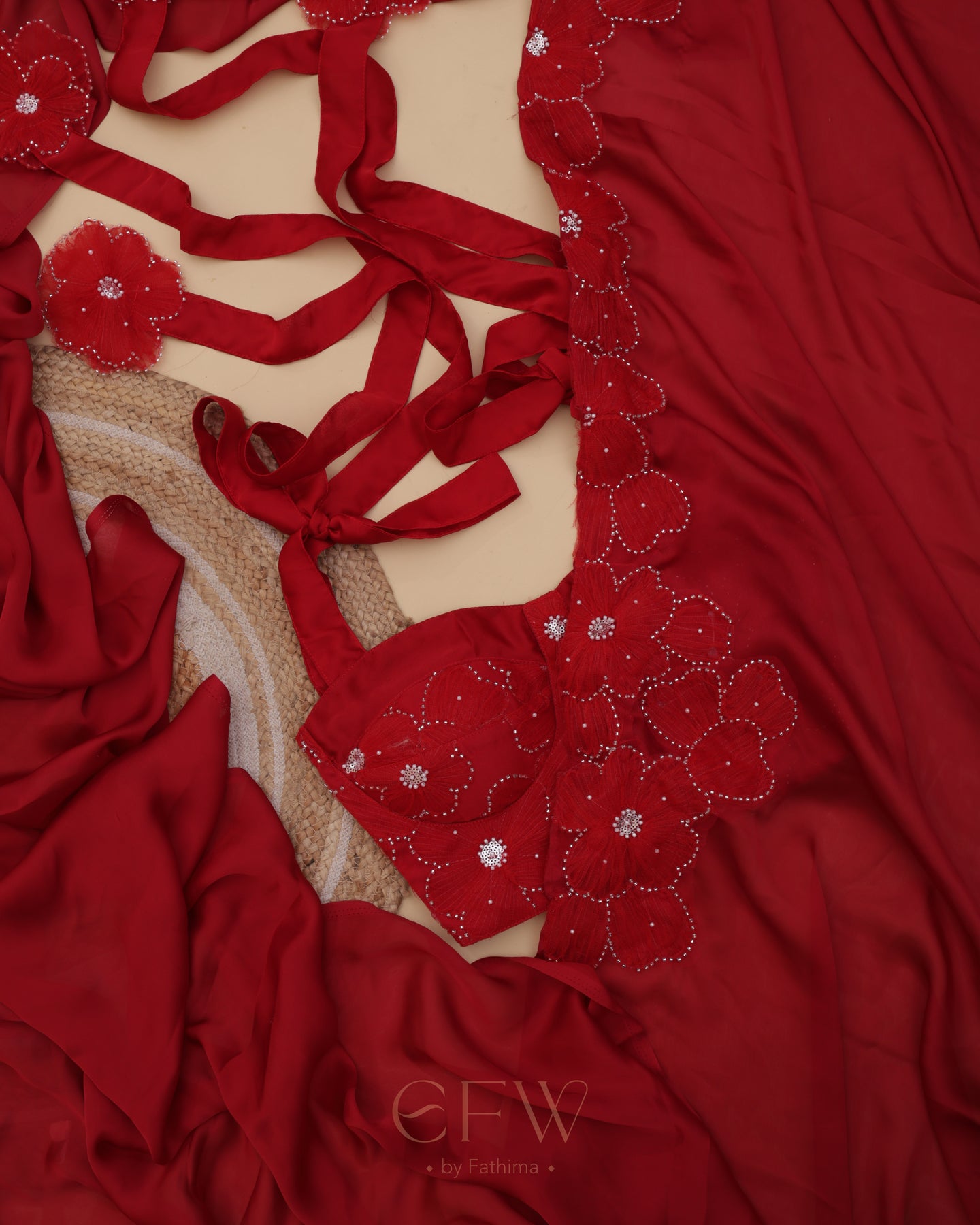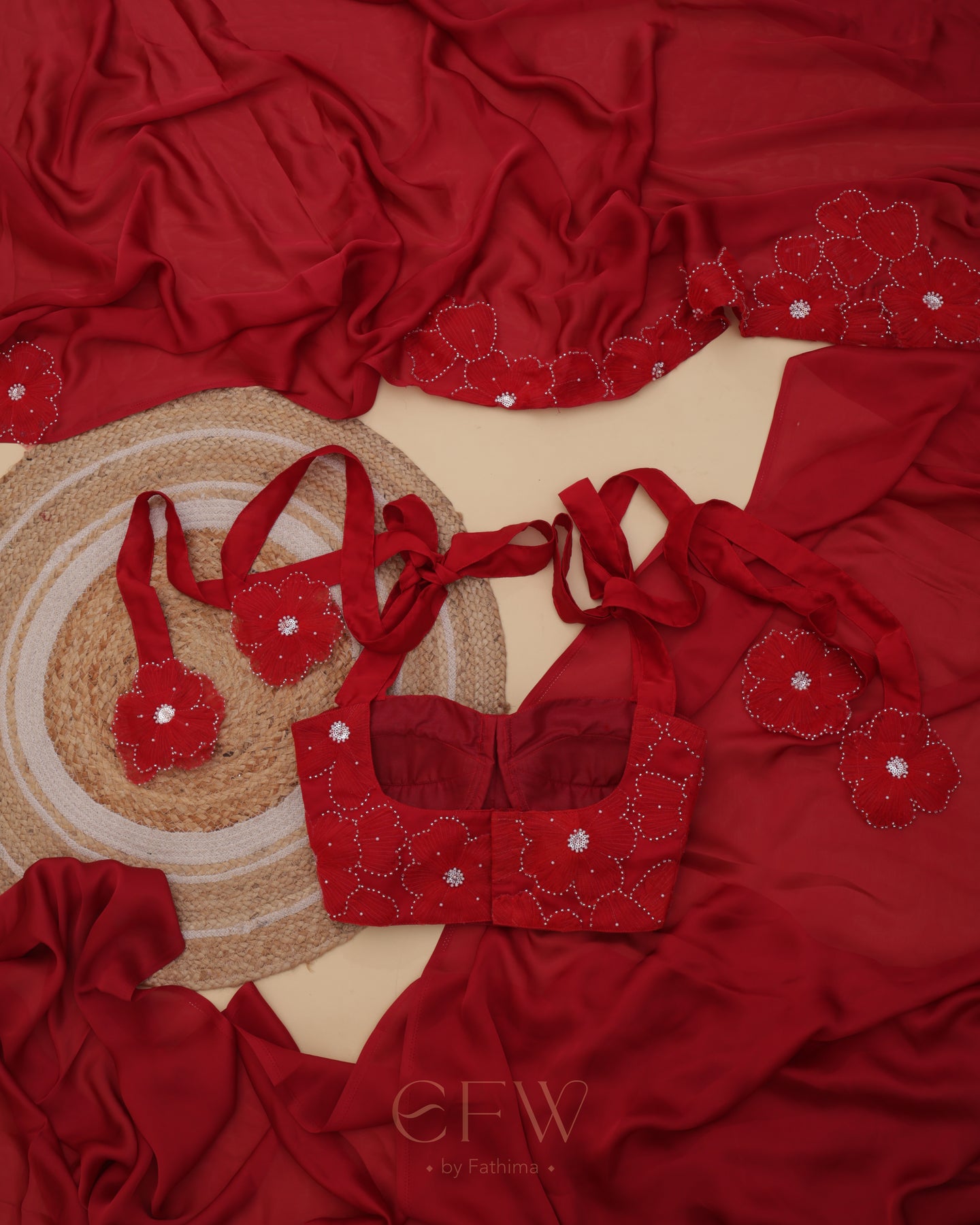 Elevate your festive elegance with Ishara, a stunning ensemble that radiates passion and poise. Crafted in a deep, luxurious red, this saree and blouse set captures the essence of celebration.