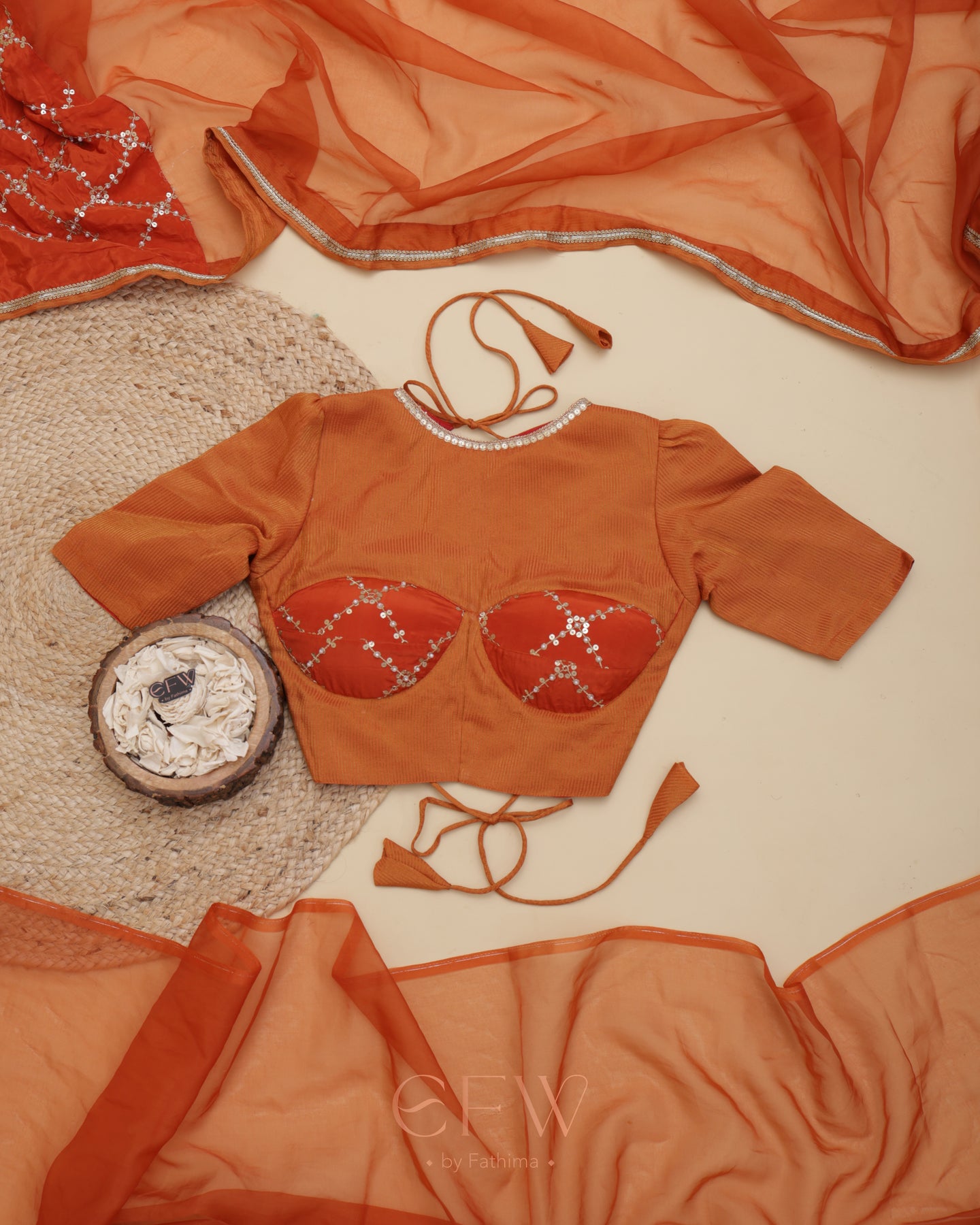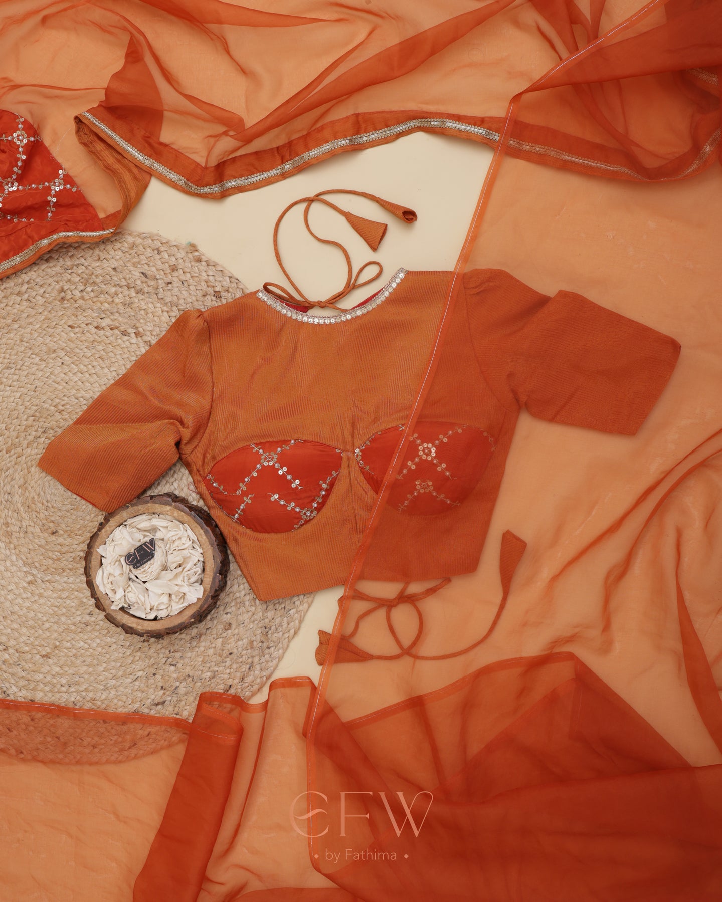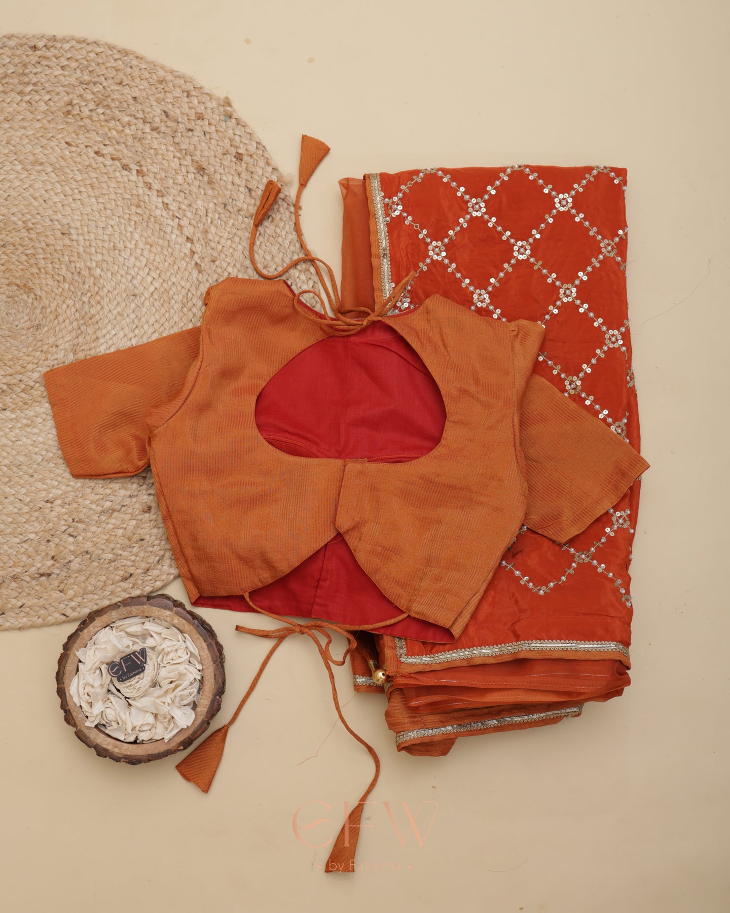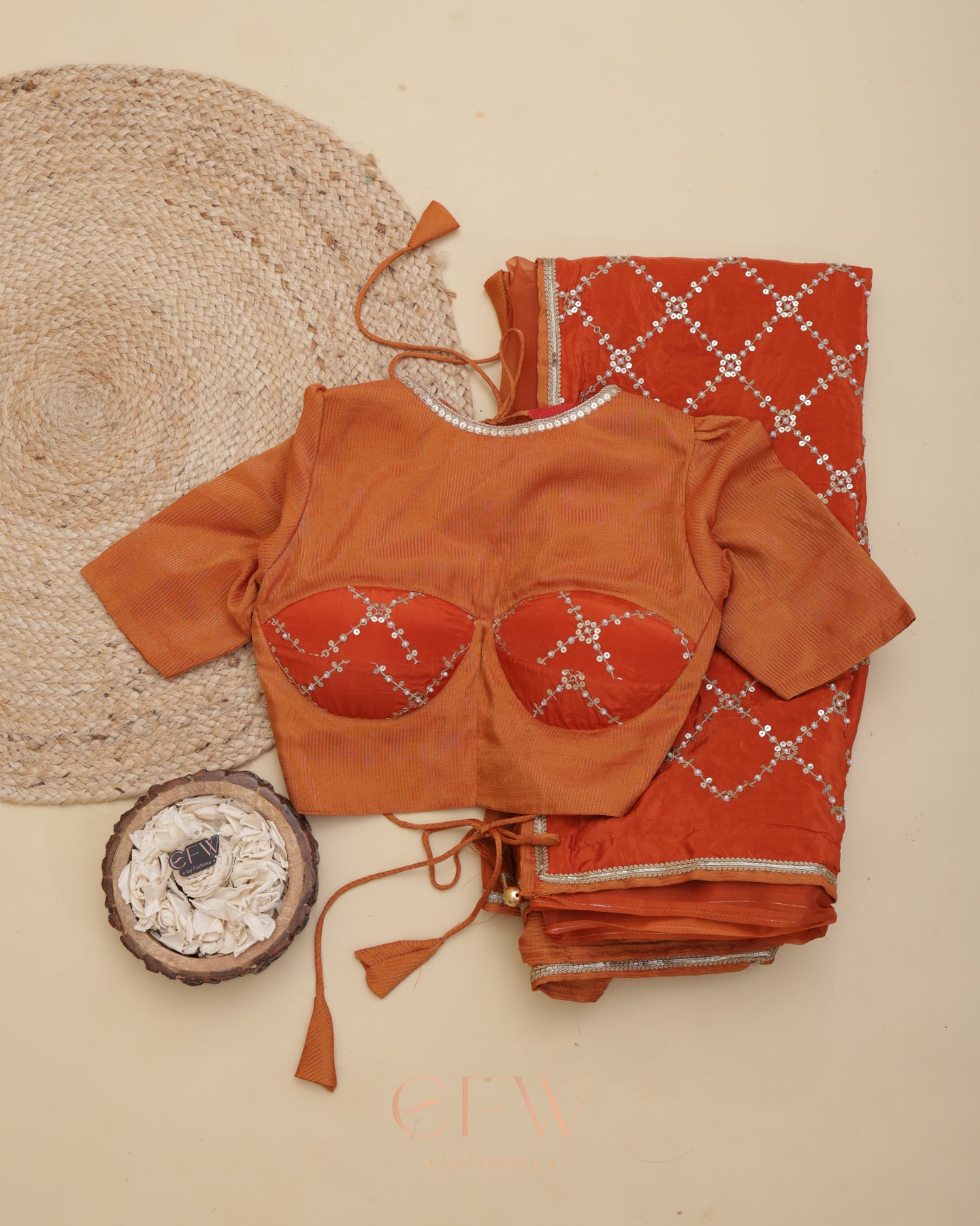 Celebrate the season of lights in the Kesar Deepam Glow Saree Set. The saree comes in a luminous kesar/saffron orange with airy organza that catch the light beautifully. The coordinating blouse is crafted in a rich burnt-orange pure tissue with subtle self-stripes; the neckline is finished with a delicate mirror/sequence trim, while padded cup features a pearl-and-sequin lattice—evoking rangoli stars and rows of diyas.
