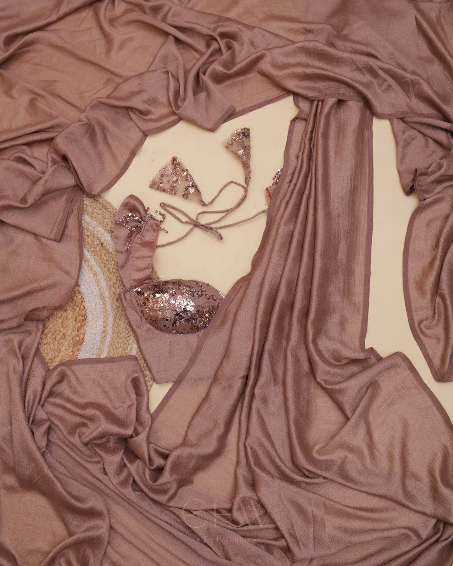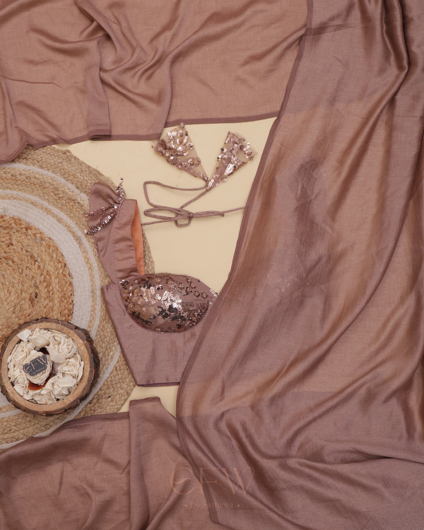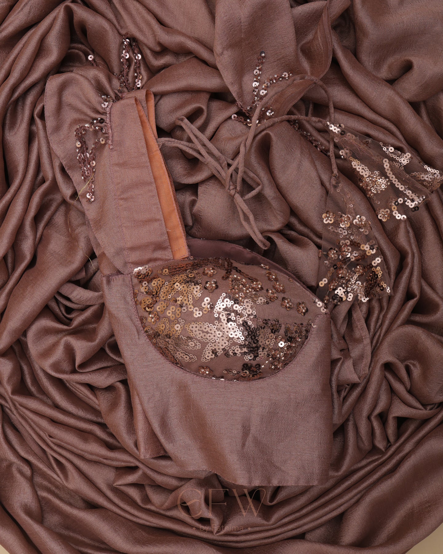 Mireya Mocha is a celebration of quiet luxury and sculpted grace. Rendered in a molten mocha tone, the saree carries a subtle sheen that catches light in all the right ways, cascading effortlessly with soft, fluid drapes.