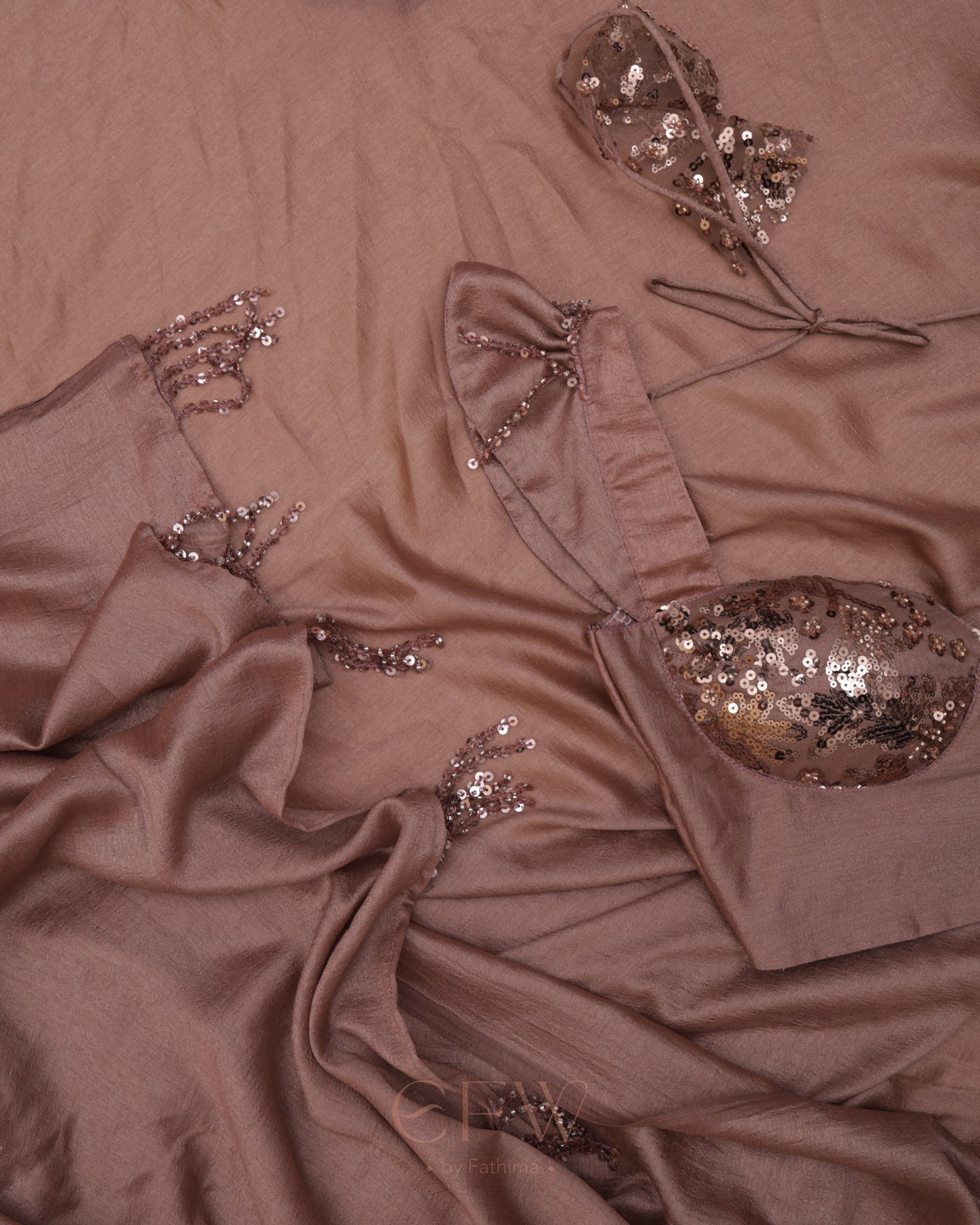 The blouse, a true statement piece, is structured with a sweetheart bustier silhouette and features intricate hand-embellished sequins in bronze and antique gold, creating a glimmering play of textures. Embellished shoulder fins and tasselled accents add a touch of drama, making Mireya Mocha perfect for evening soirées, engagement celebrations, or intimate cocktail affairs.