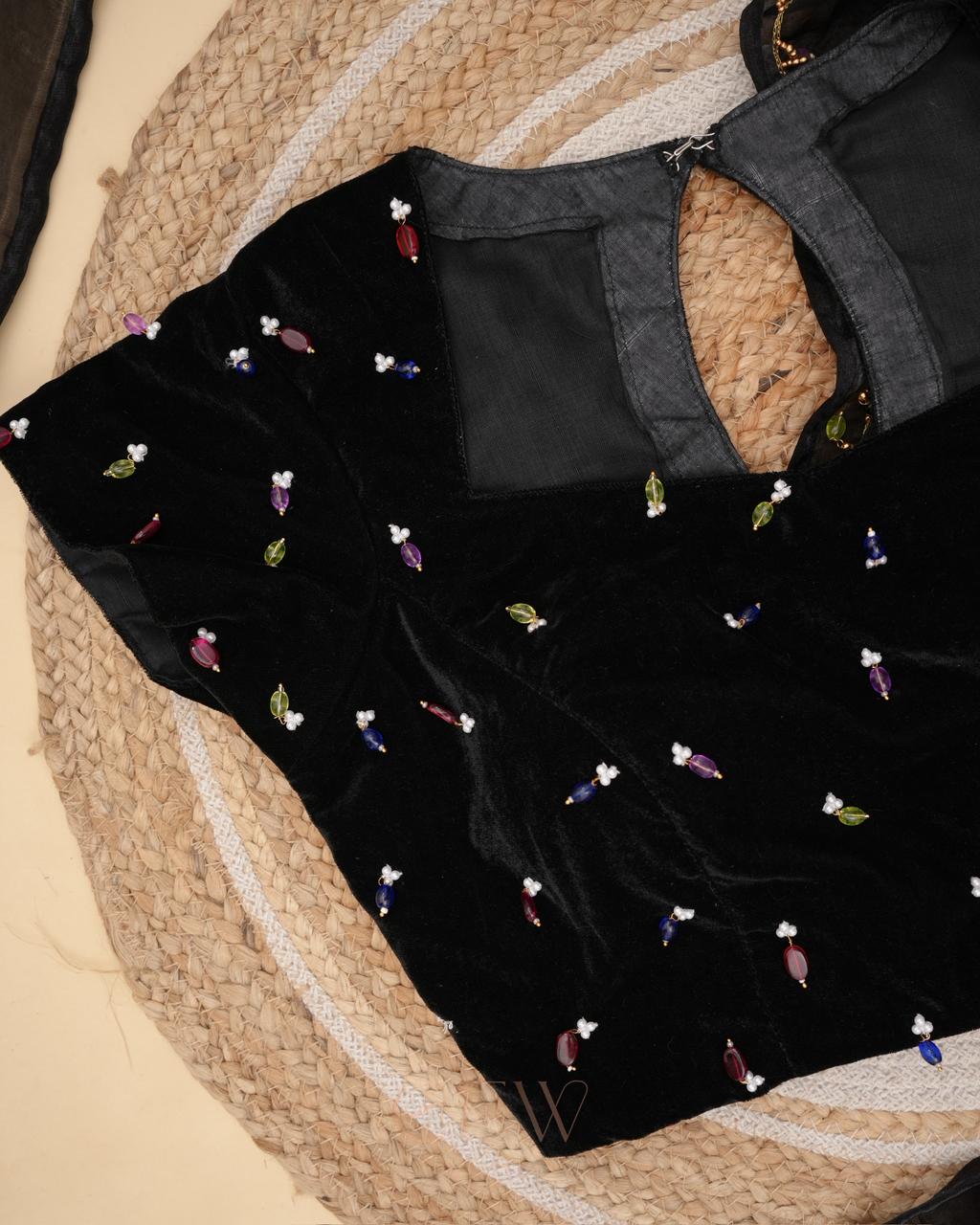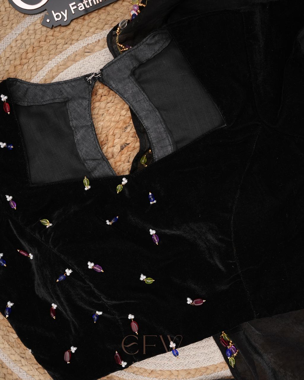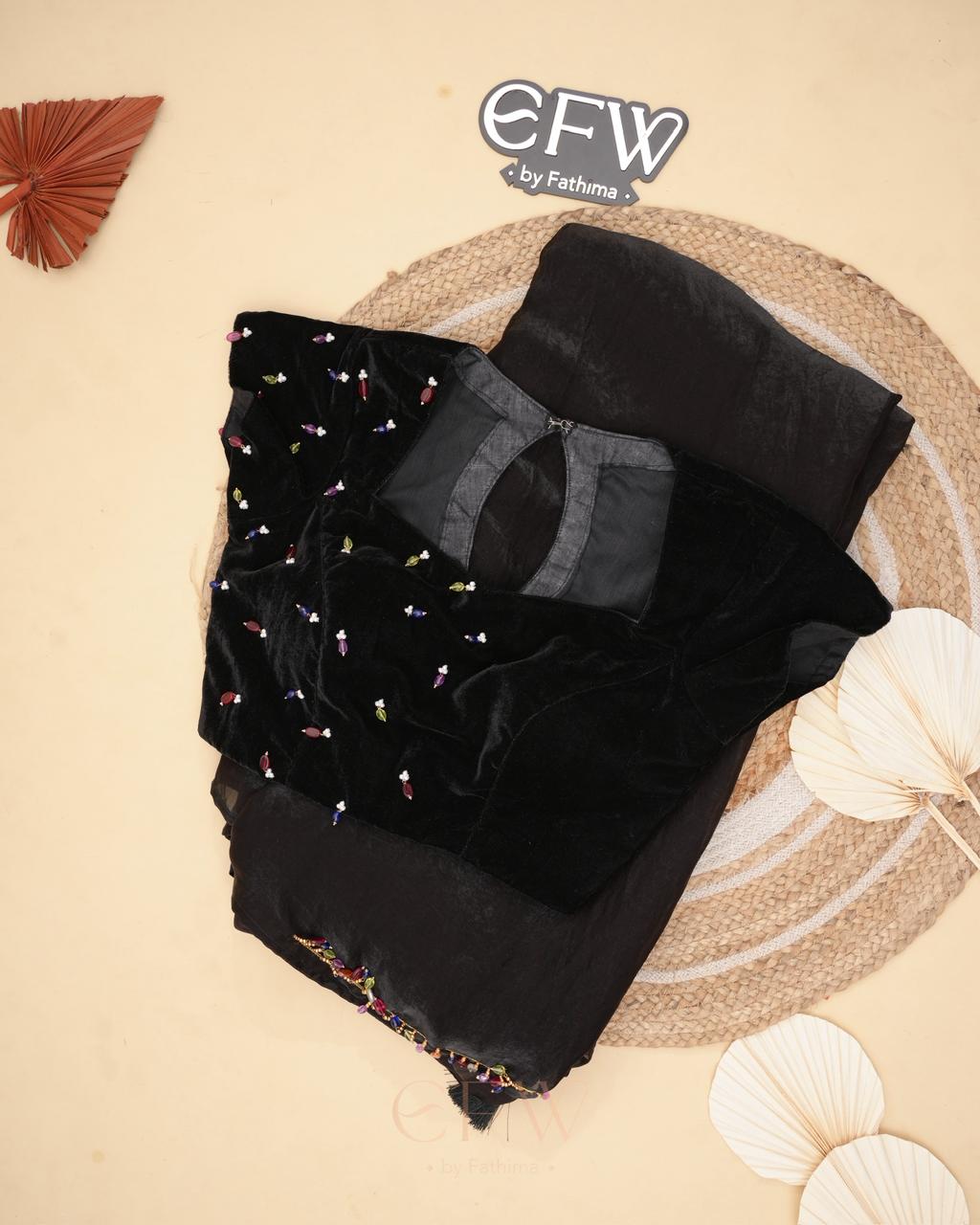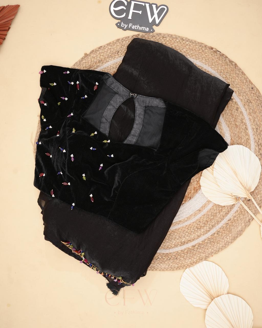 The border is finished with tiny multicolour bead embellishments, adding a playful yet refined detail that glimmers gently with movement. Paired with a black velvet blouse adorned with scattered jewel-toned bead accents, the blouse brings depth and charm to the look while complementing the saree’s understated sophistication.