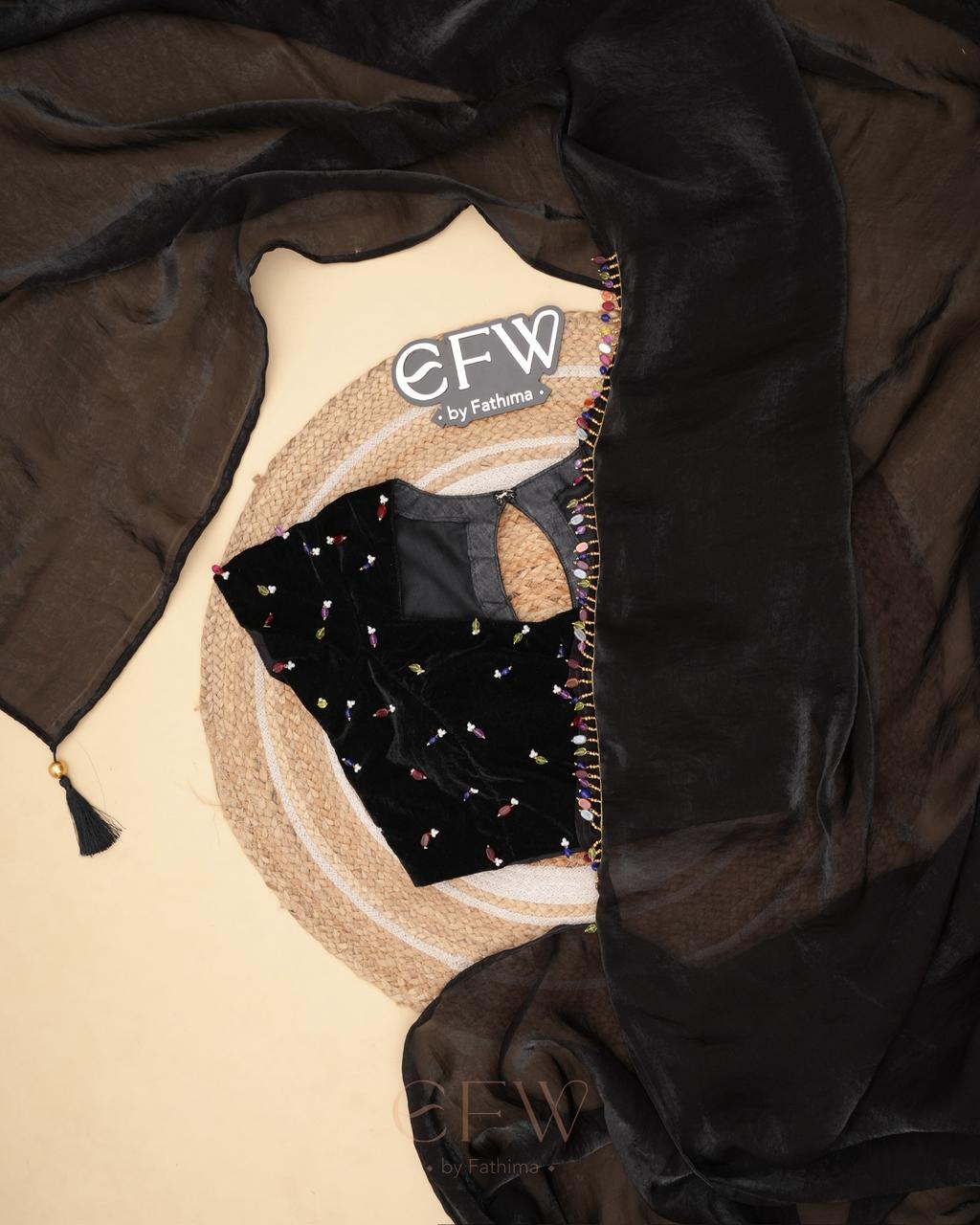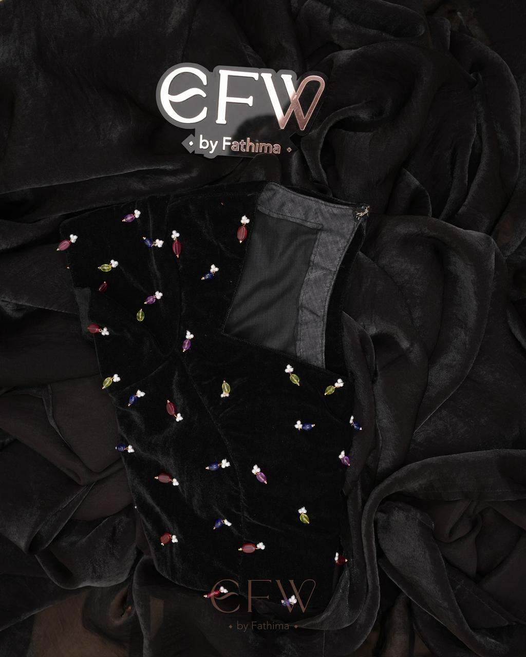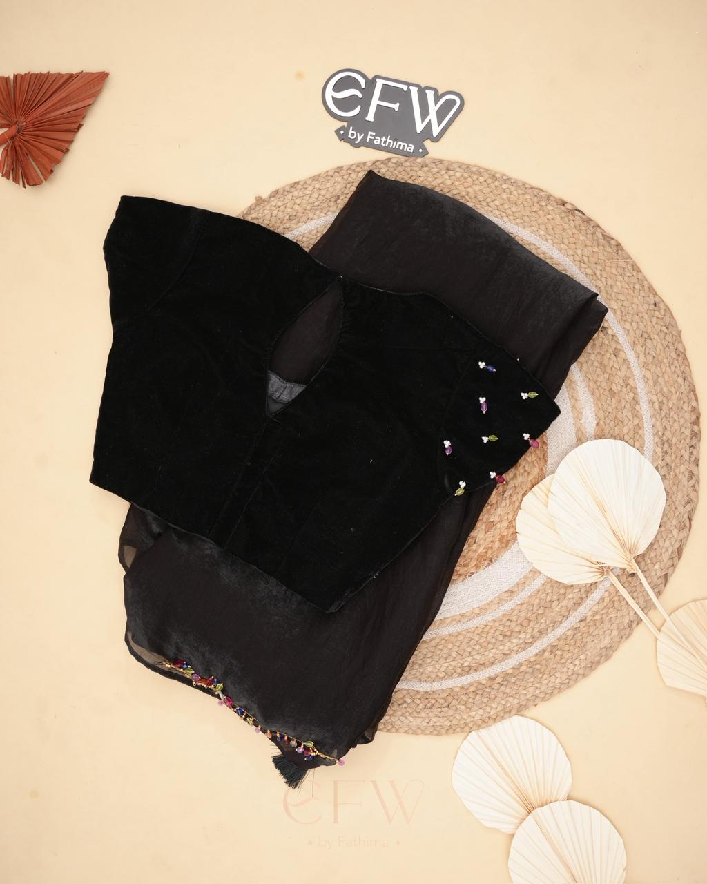The border is finished with tiny multicolour bead embellishments, adding a playful yet refined detail that glimmers gently with movement. Paired with a black velvet blouse adorned with scattered jewel-toned bead accents, the blouse brings depth and charm to the look while complementing the saree’s understated sophistication.