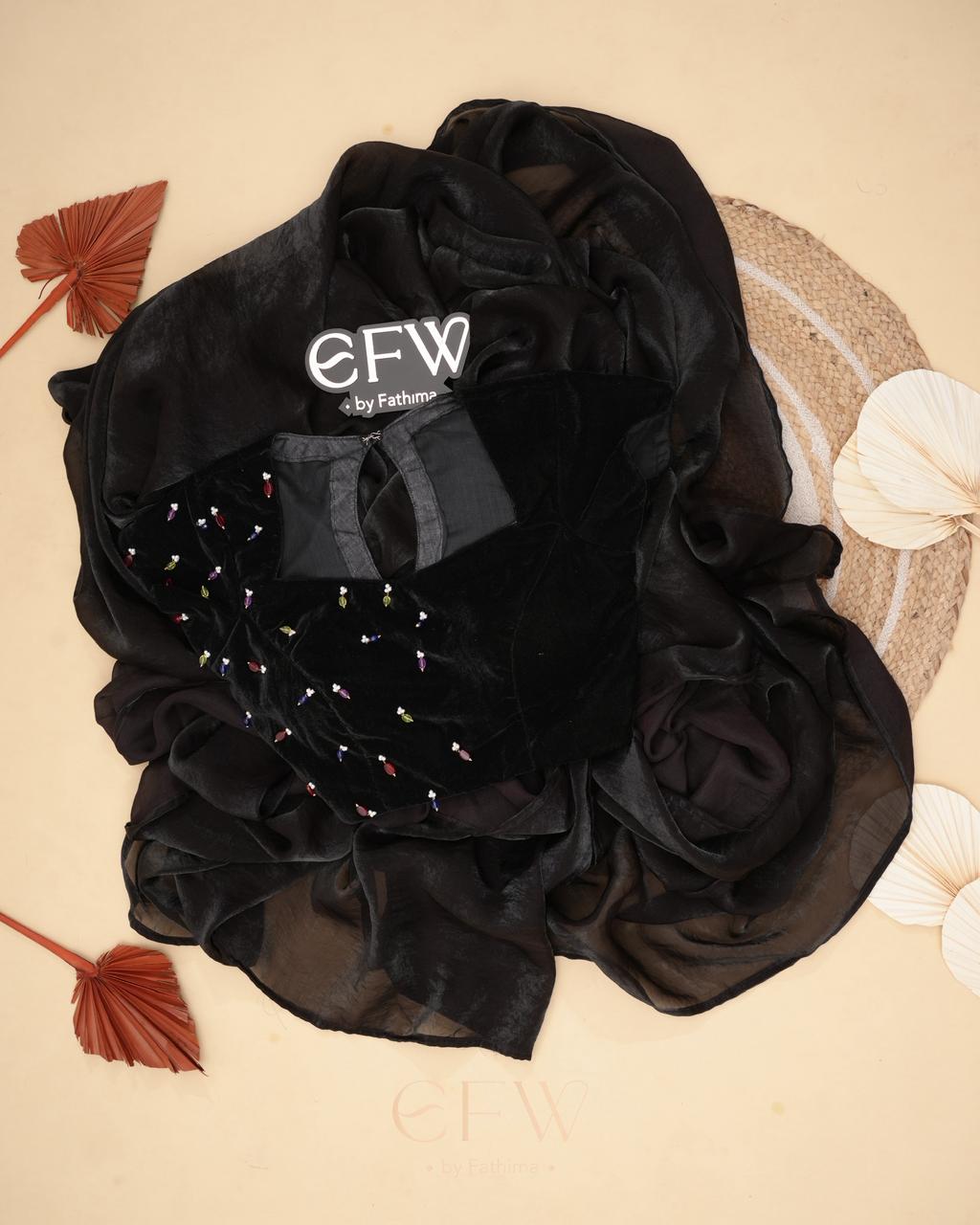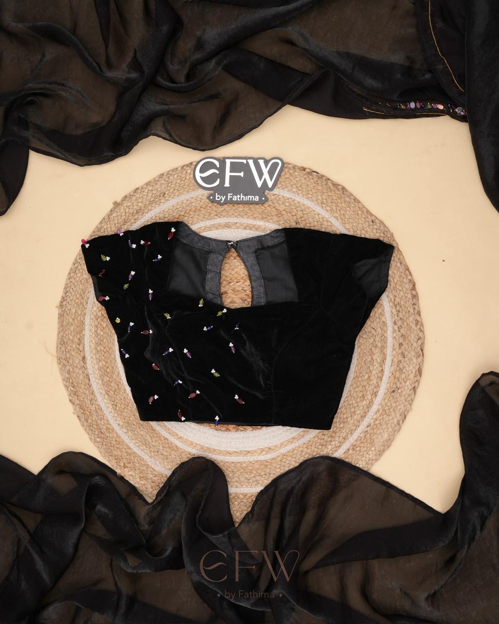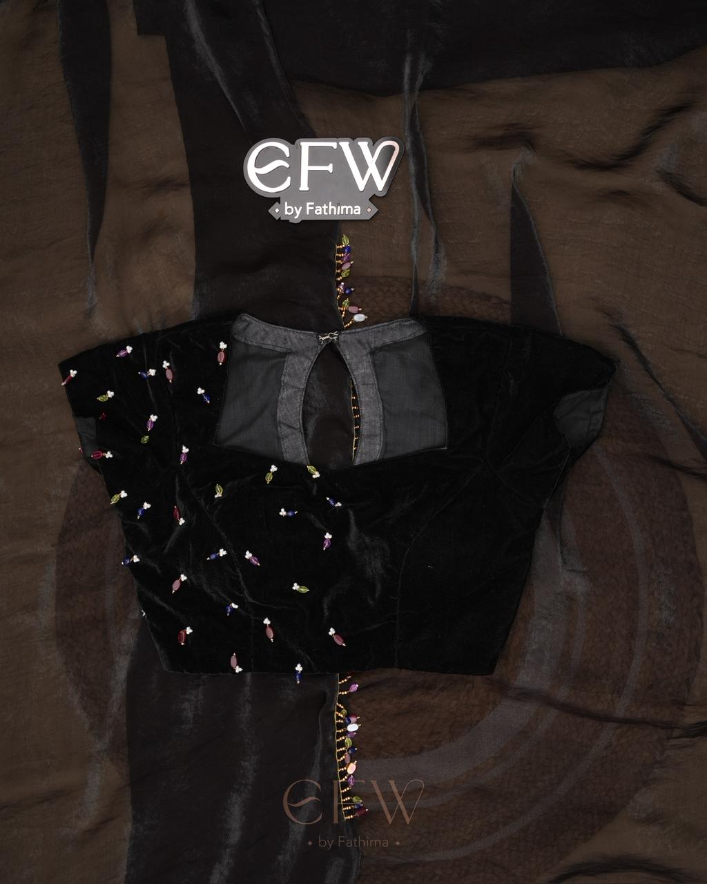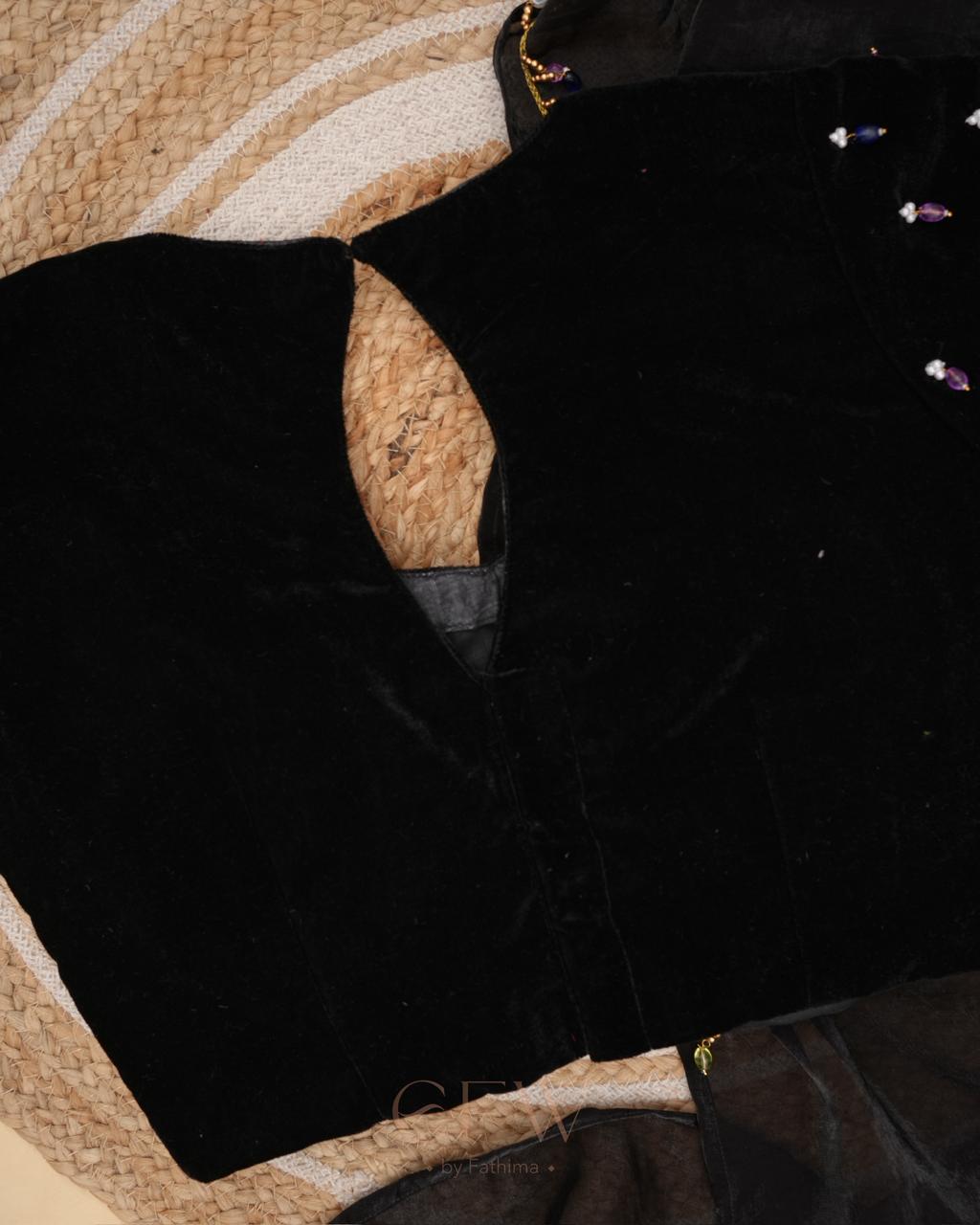 The border is finished with tiny multicolour bead embellishments, adding a playful yet refined detail that glimmers gently with movement. Paired with a black velvet blouse adorned with scattered jewel-toned bead accents, the blouse brings depth and charm to the look while complementing the saree’s understated sophistication.