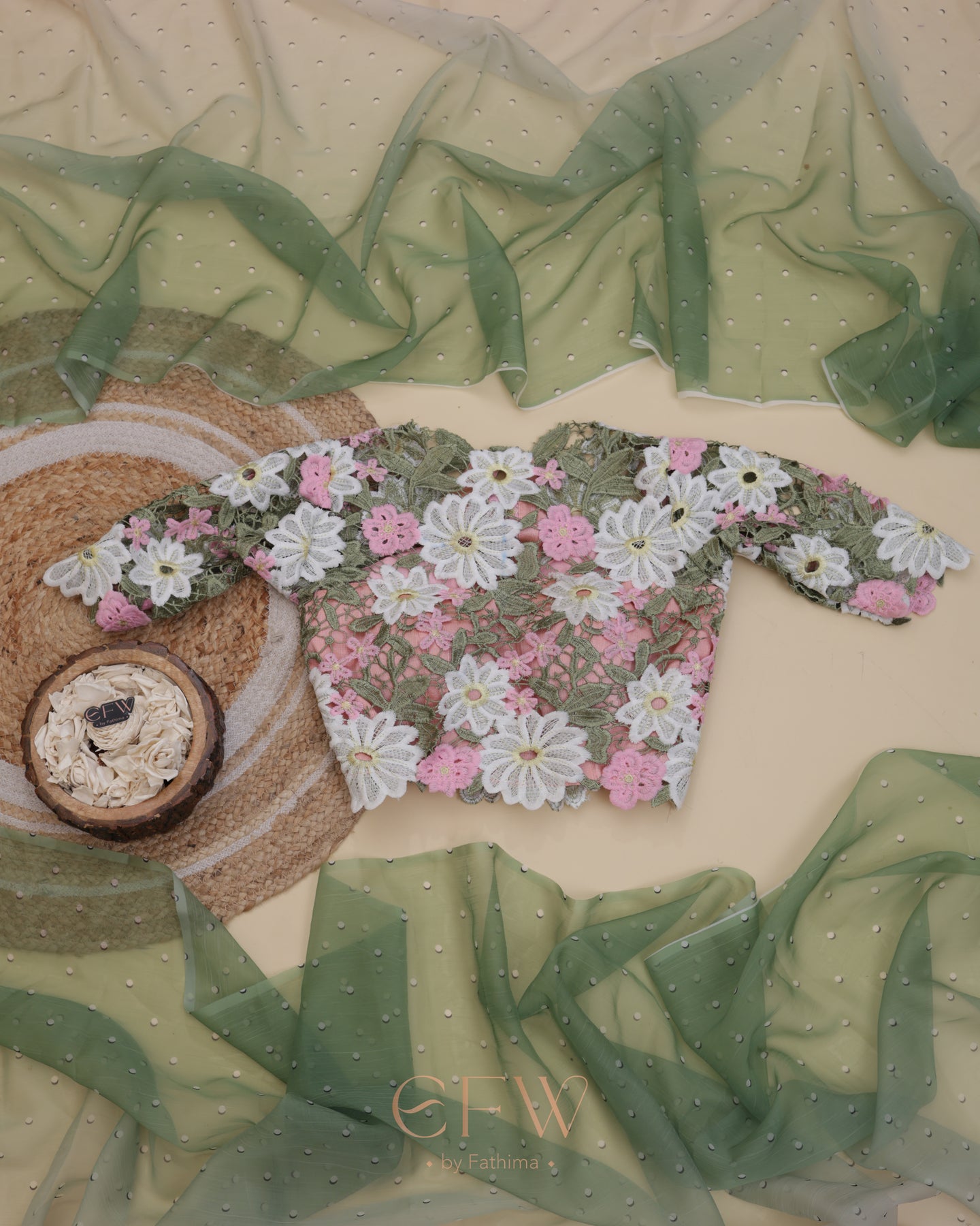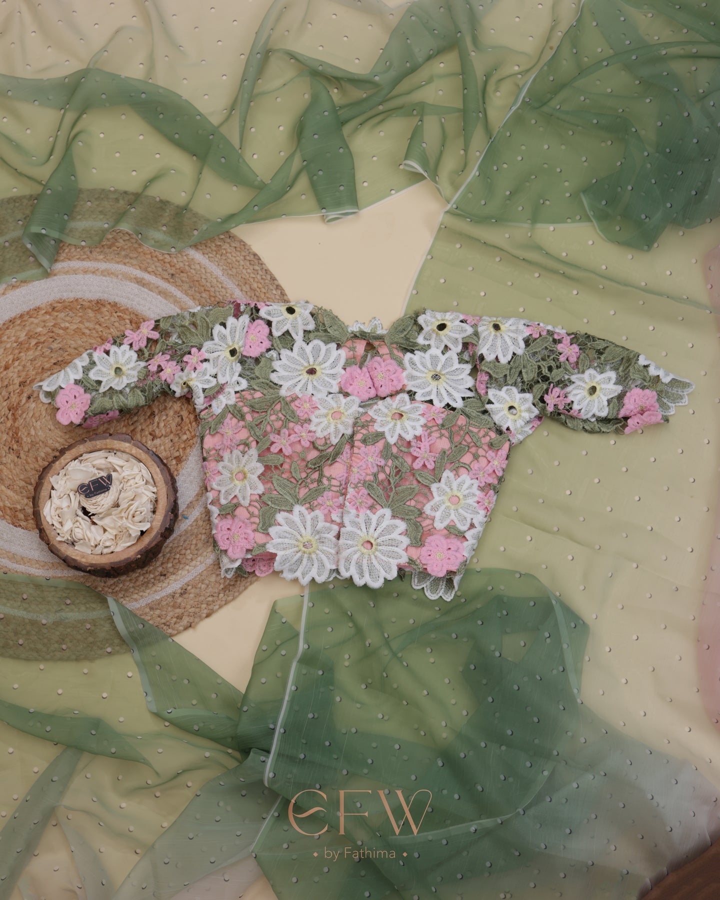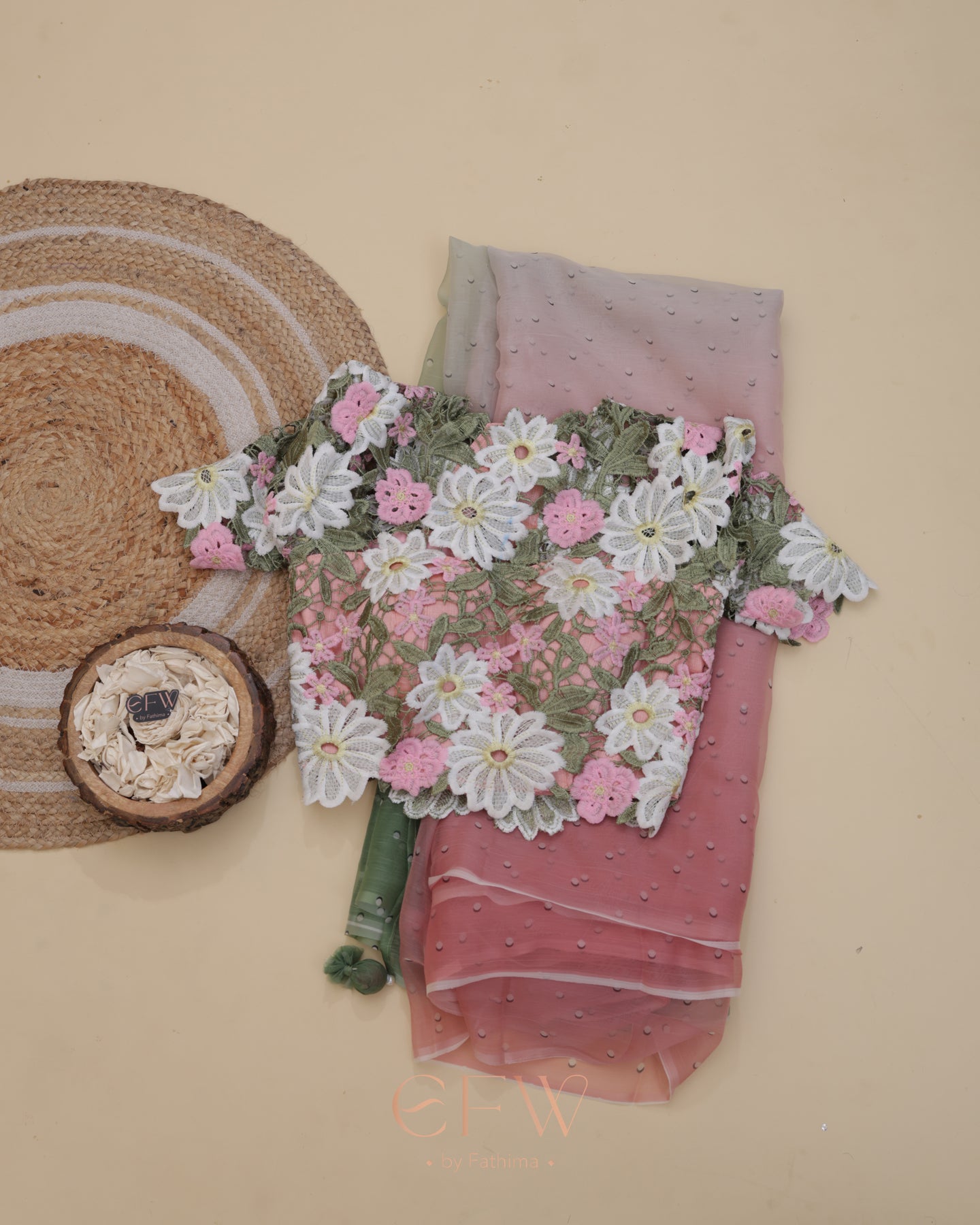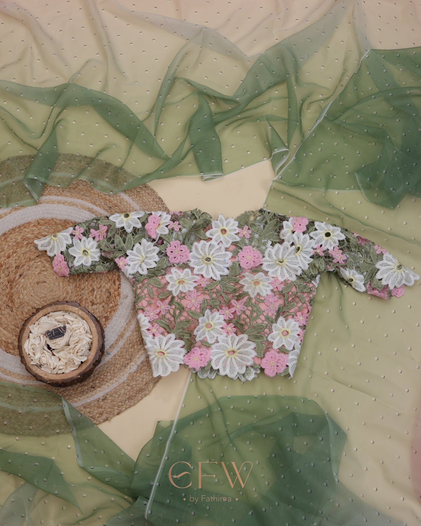 Paired with a pastel floral blouse in gentle shades, the look is complete without needing any extra effort. The blouse itself is a piece of art — romantic, versatile, and timeless.