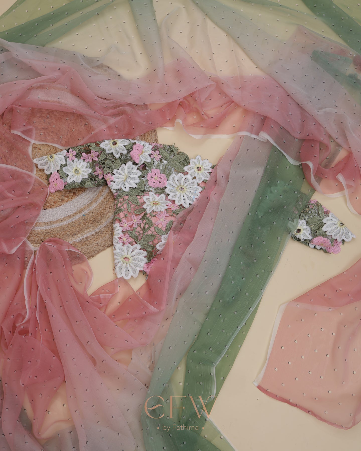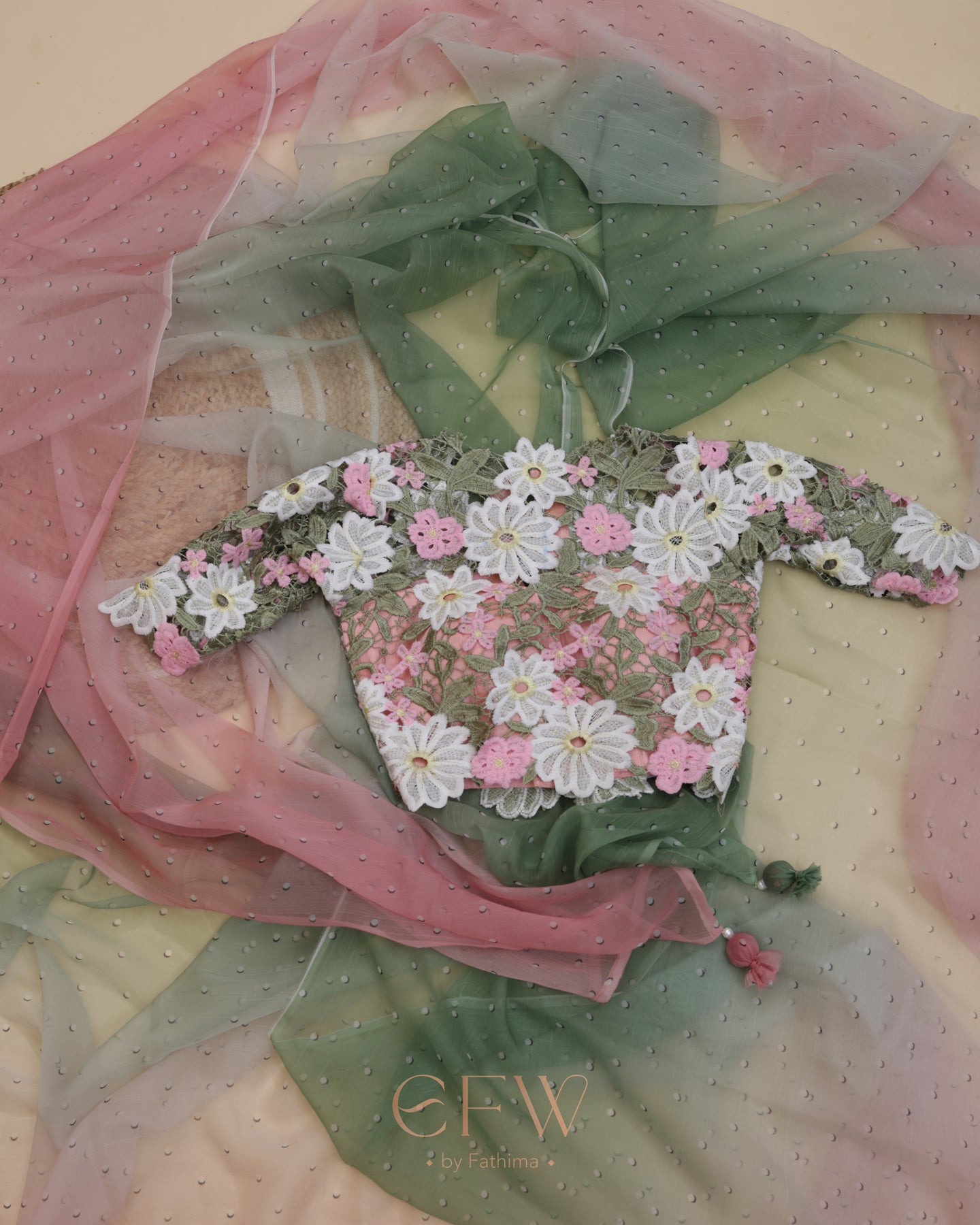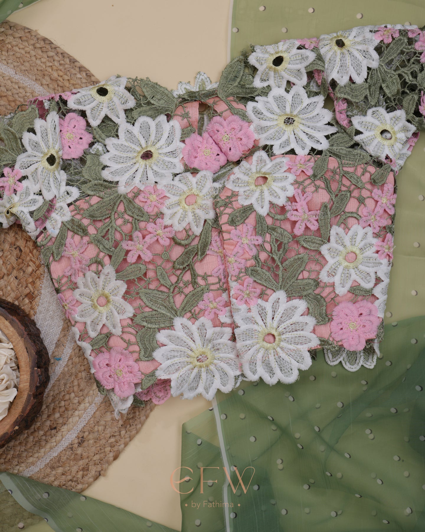 Paired with a pastel floral blouse in gentle shades, the look is complete without needing any extra effort. The blouse itself is a piece of art — romantic, versatile, and timeless.