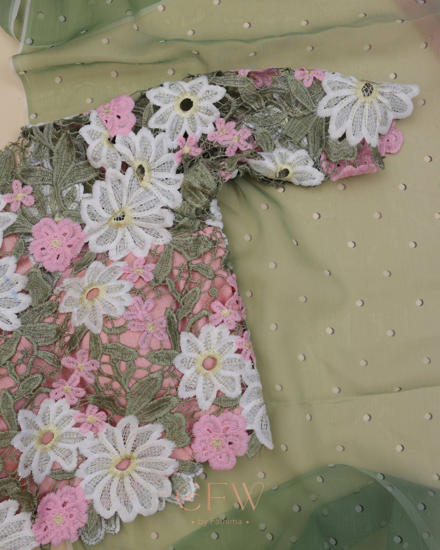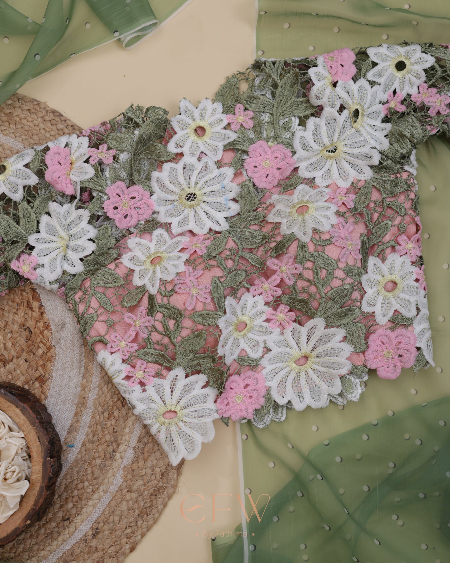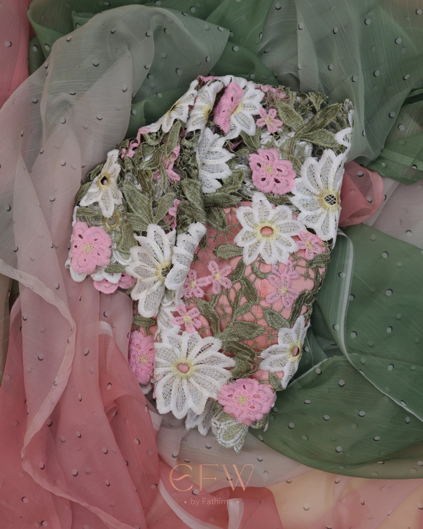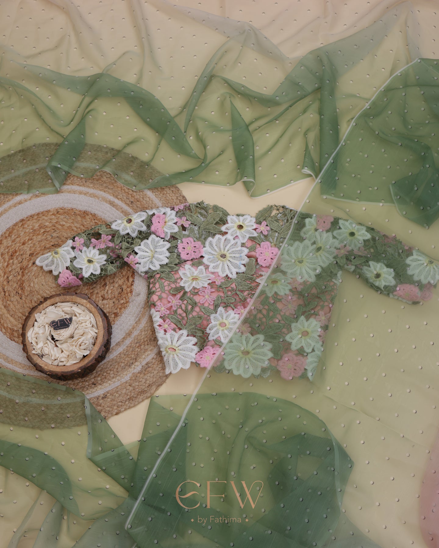 Paired with a pastel floral blouse in gentle shades, the look is complete without needing any extra effort. The blouse itself is a piece of art — romantic, versatile, and timeless.