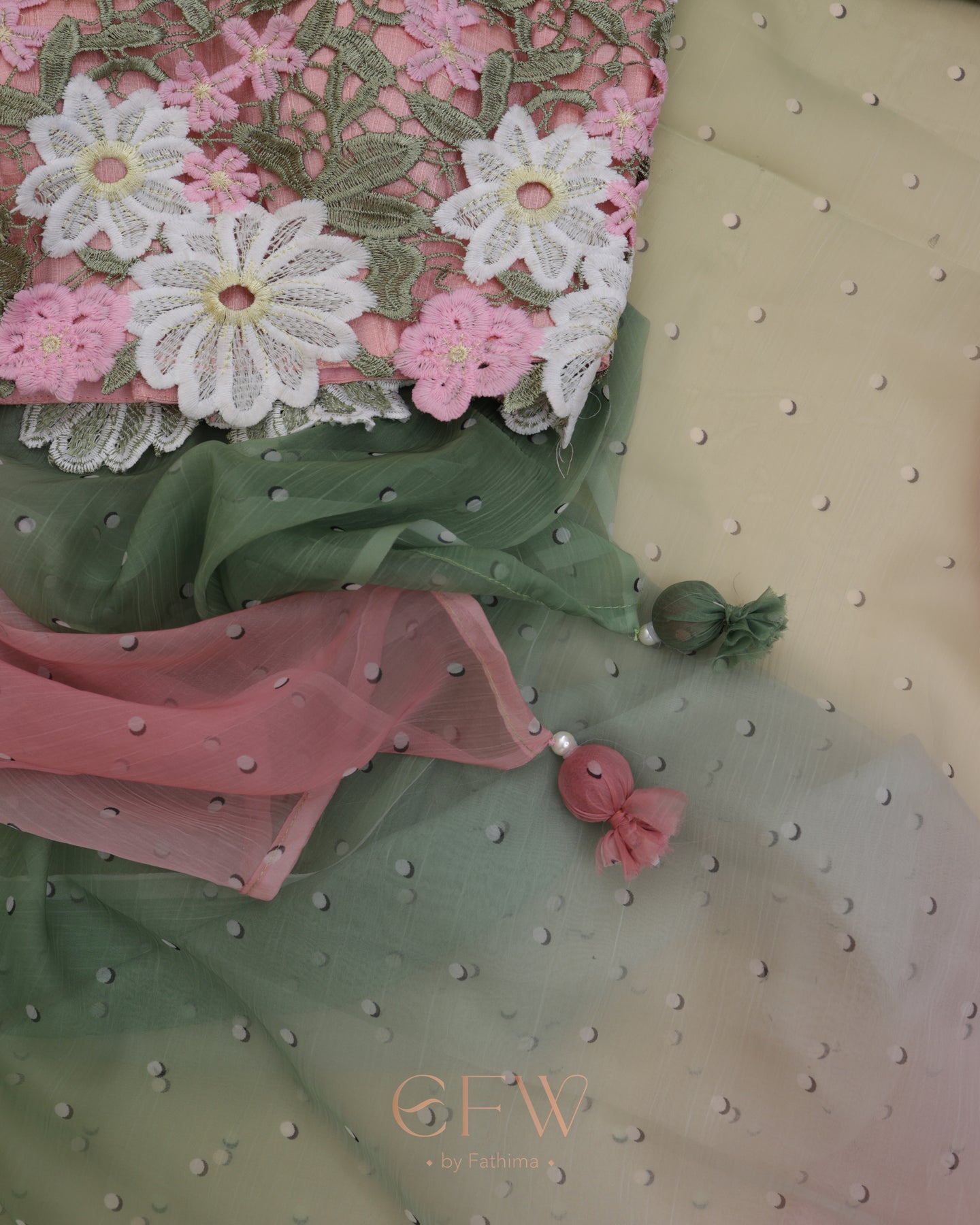 The fabric is soft organza with delicate dotted detailing, adding a playful texture while keeping the saree light as air. It’s the ultimate “one-minute drape” saree — weightless, flowy, and so easy to carry that you’ll forget you’re even wearing it.
