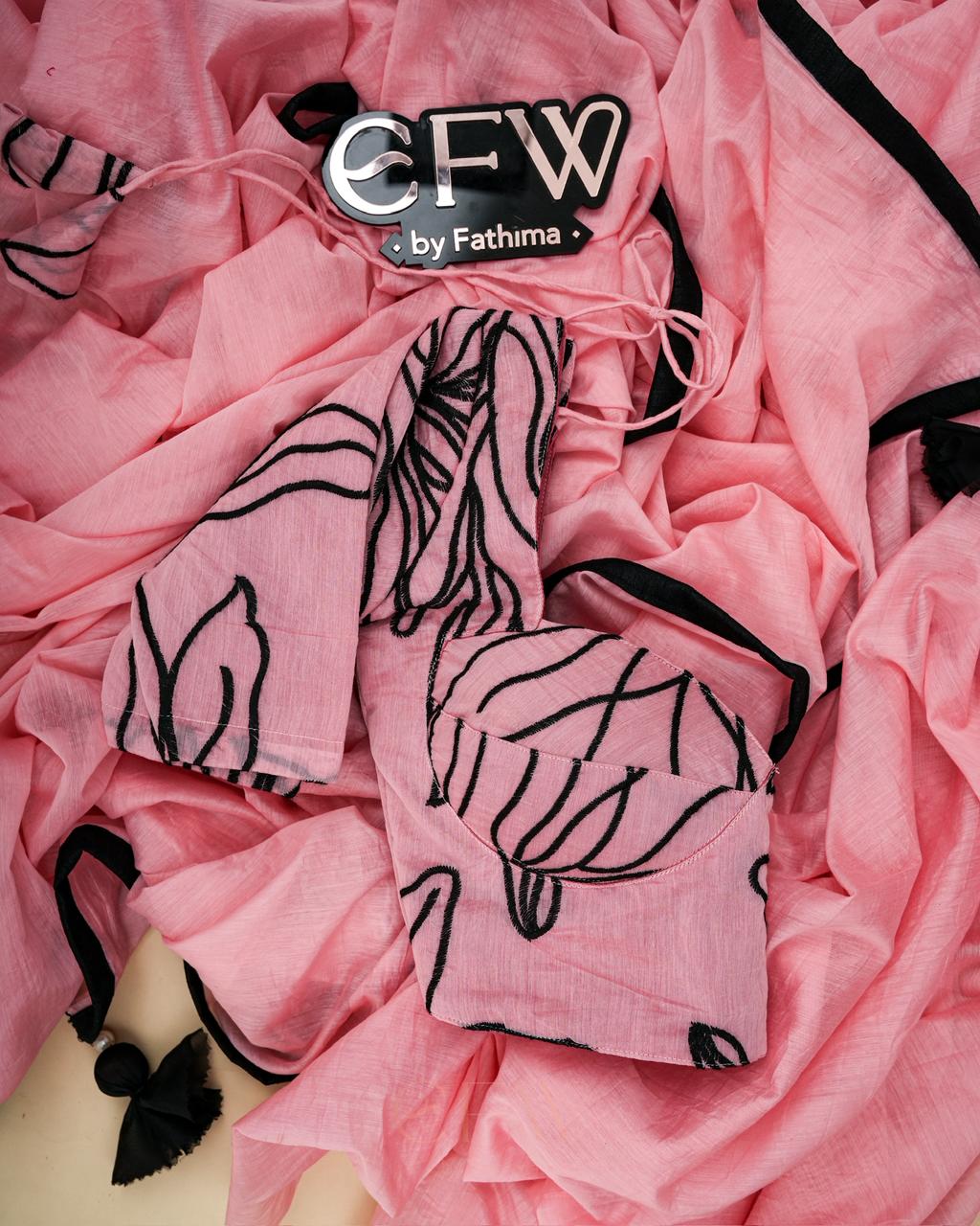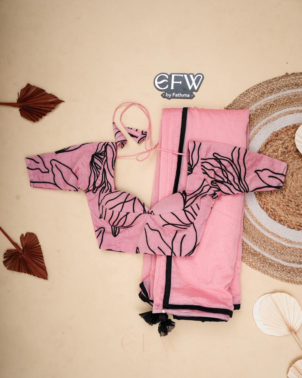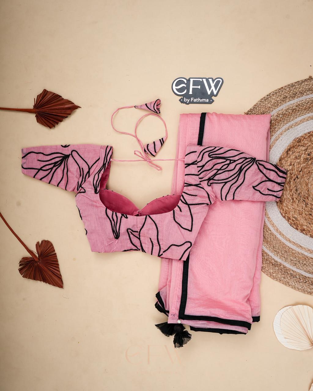 The saree flows in an airy pastel pink drape, light as a whisper and effortlessly graceful. Framed with a sharp black border, the softness of the chanderi fabric is beautifully defined, creating a clean, sculpted silhouette. The contrast edging gives the saree a refined, modern finish while keeping it delicately feminine.