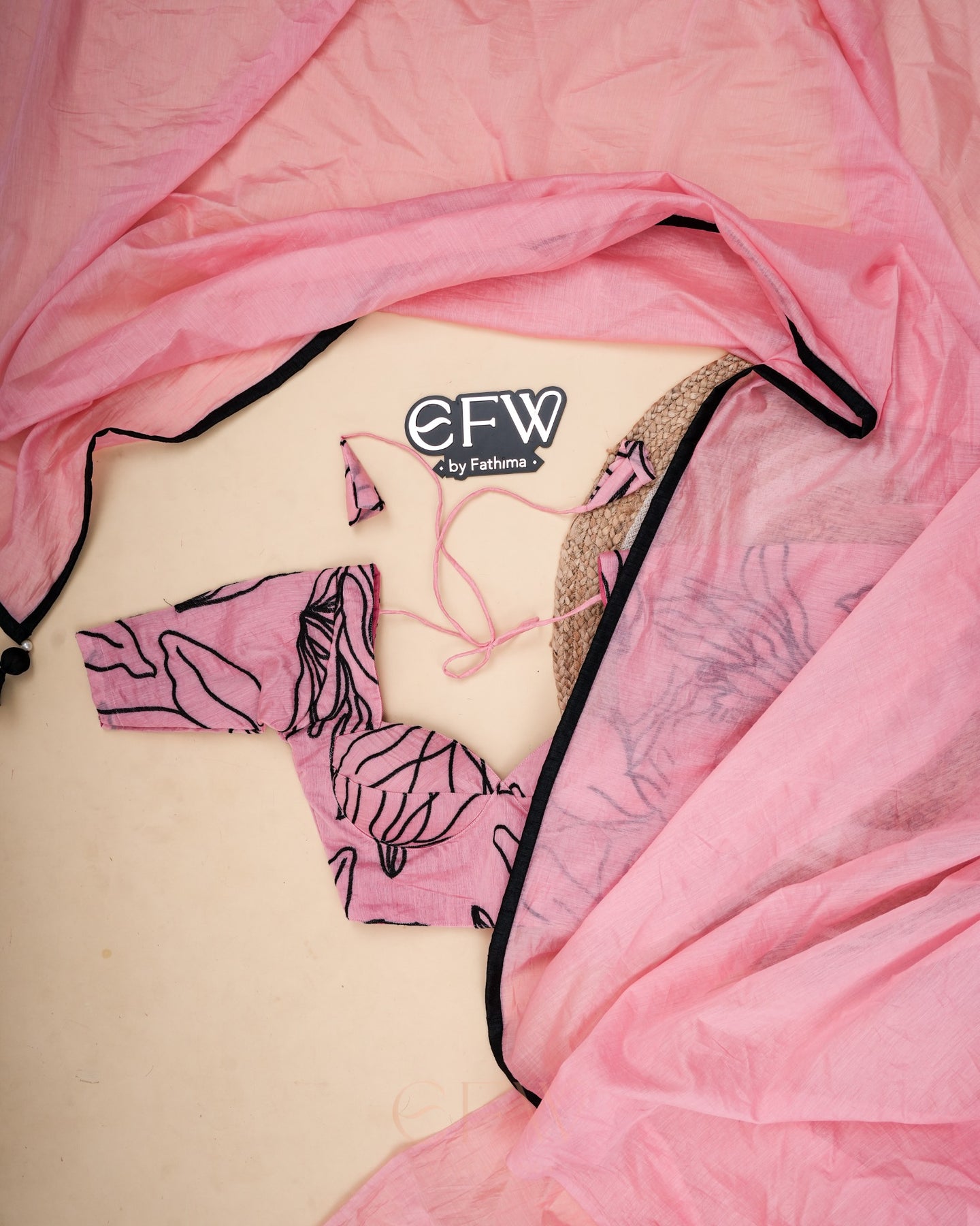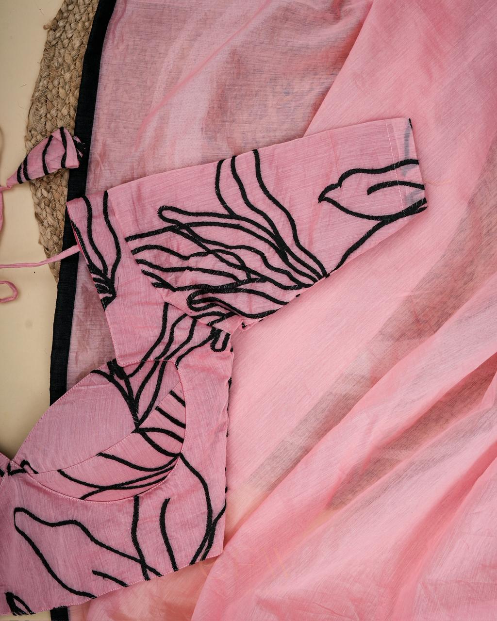 The blouse introduces an artistic edge with abstract black line motifs sketched across the pink chanderi base — almost like ink on canvas. The structured fit and tie-back detailing add definition, while the minimal yet expressive design makes it perfect for women who love subtle statement pieces.