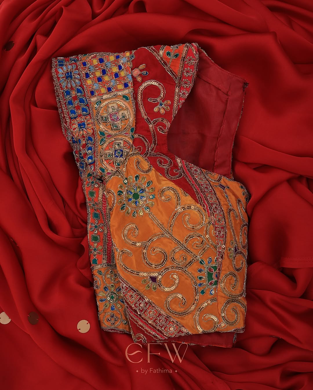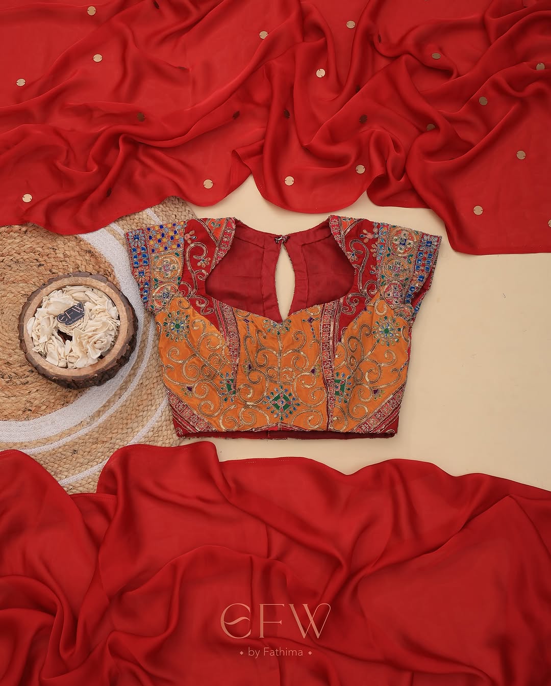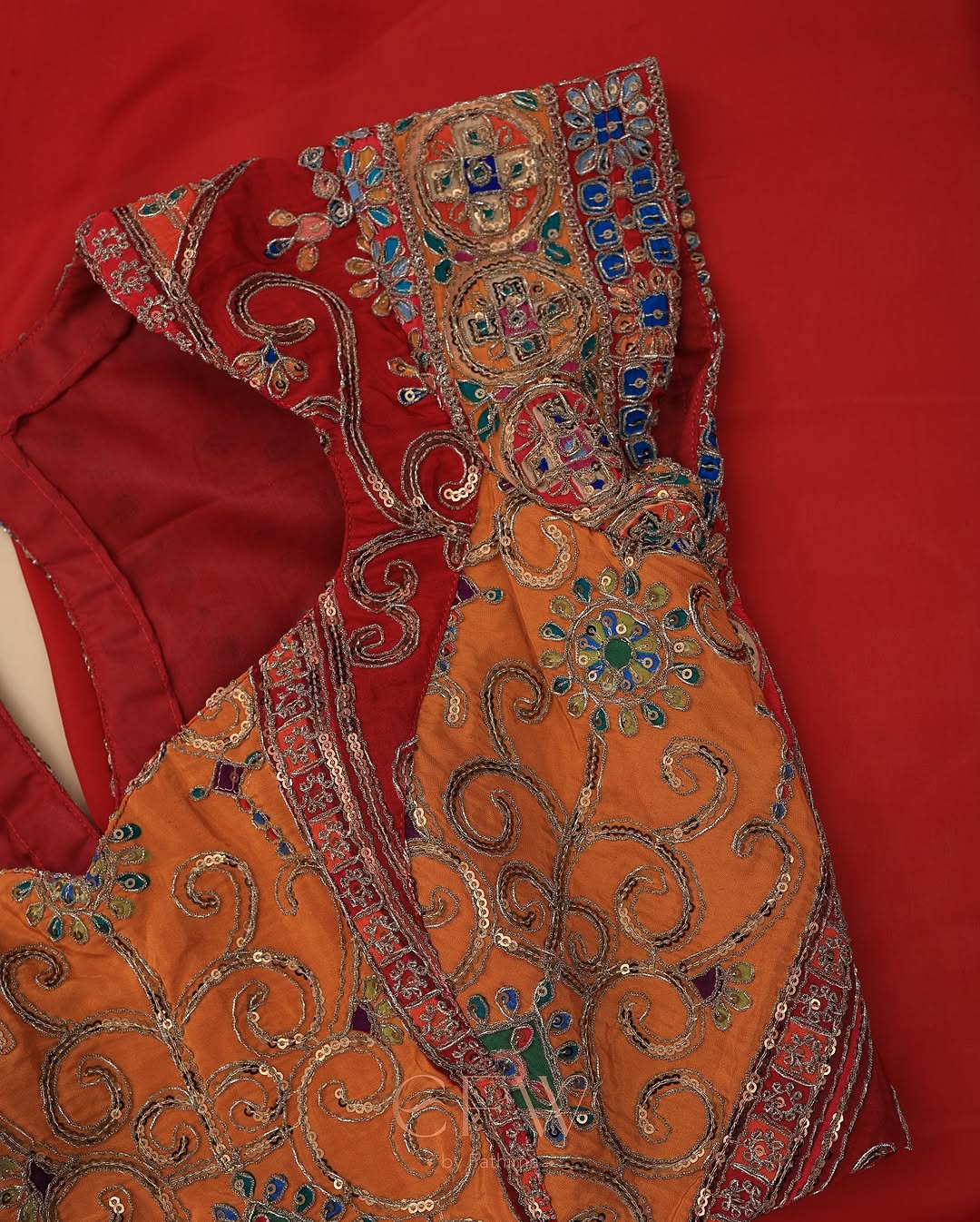 The highlight of the ensemble is its vibrant hand-embroidered blouse — a striking combination of deep vermillion and warm turmeric orange. Intricate mirror work, thread embroidery, and delicate zari detailing form elaborate floral and vine motifs, creating a masterpiece of artisanal craftsmanship. The blouse features a stylish back slit with a secure hook closure, balancing traditional elegance with contemporary flair.
