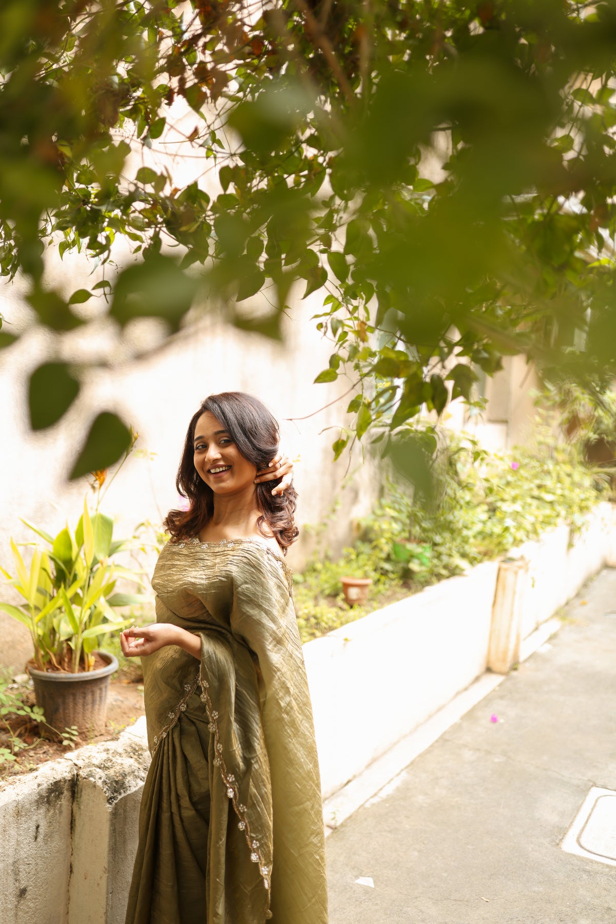 A stunning braso tissue two toned silk saree that’s like a canvas painted with the most enchanting shades serene green. It’s the kind of saree that makes you stop and stare, each hue blending into the next like a beautiful watercolor masterpiece.