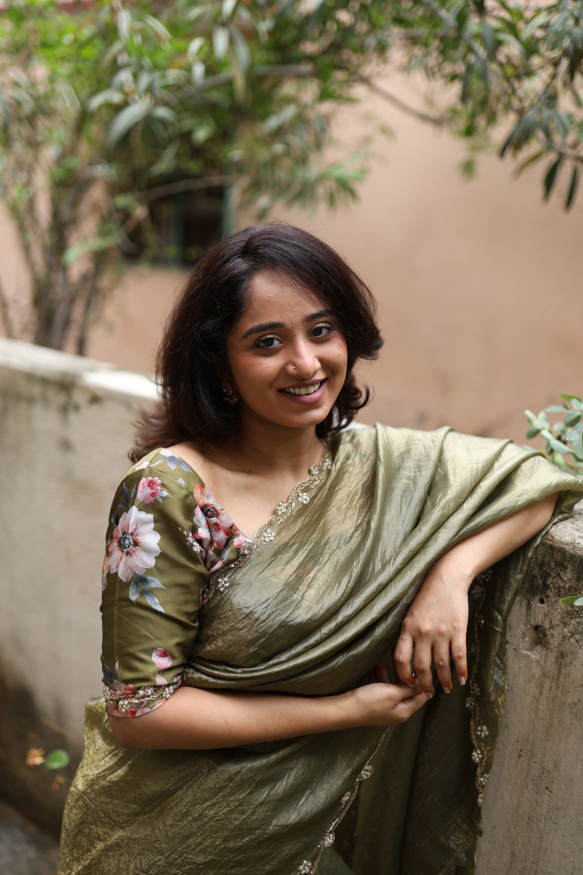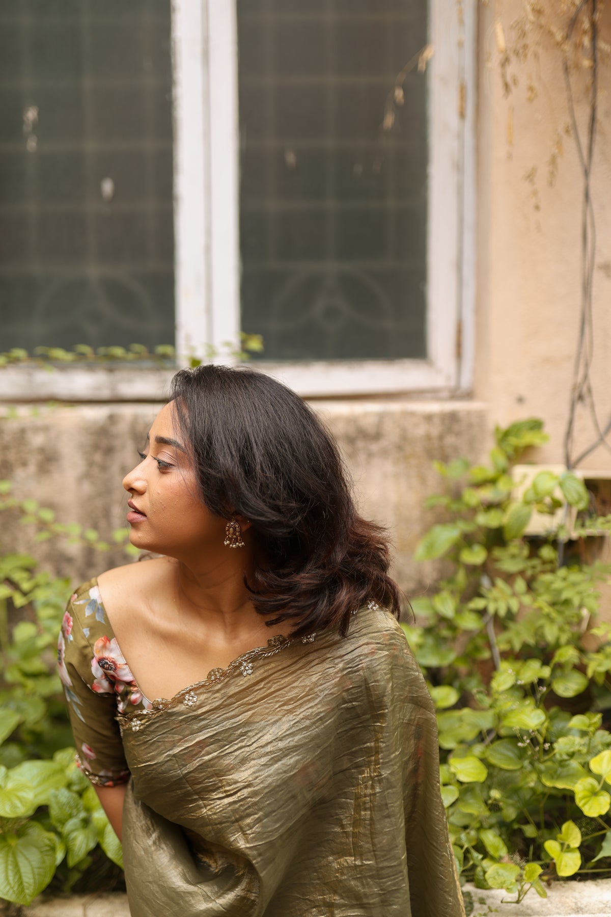 Fabric : Braso tissue two tone silk sare | Floral digital printed silk blouse with khatli floral work | Golden sequins