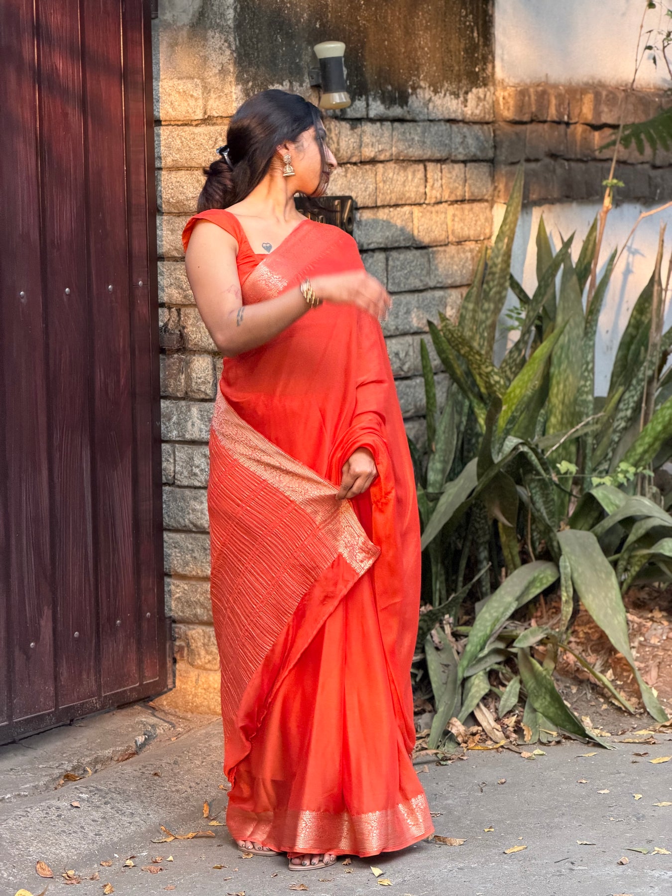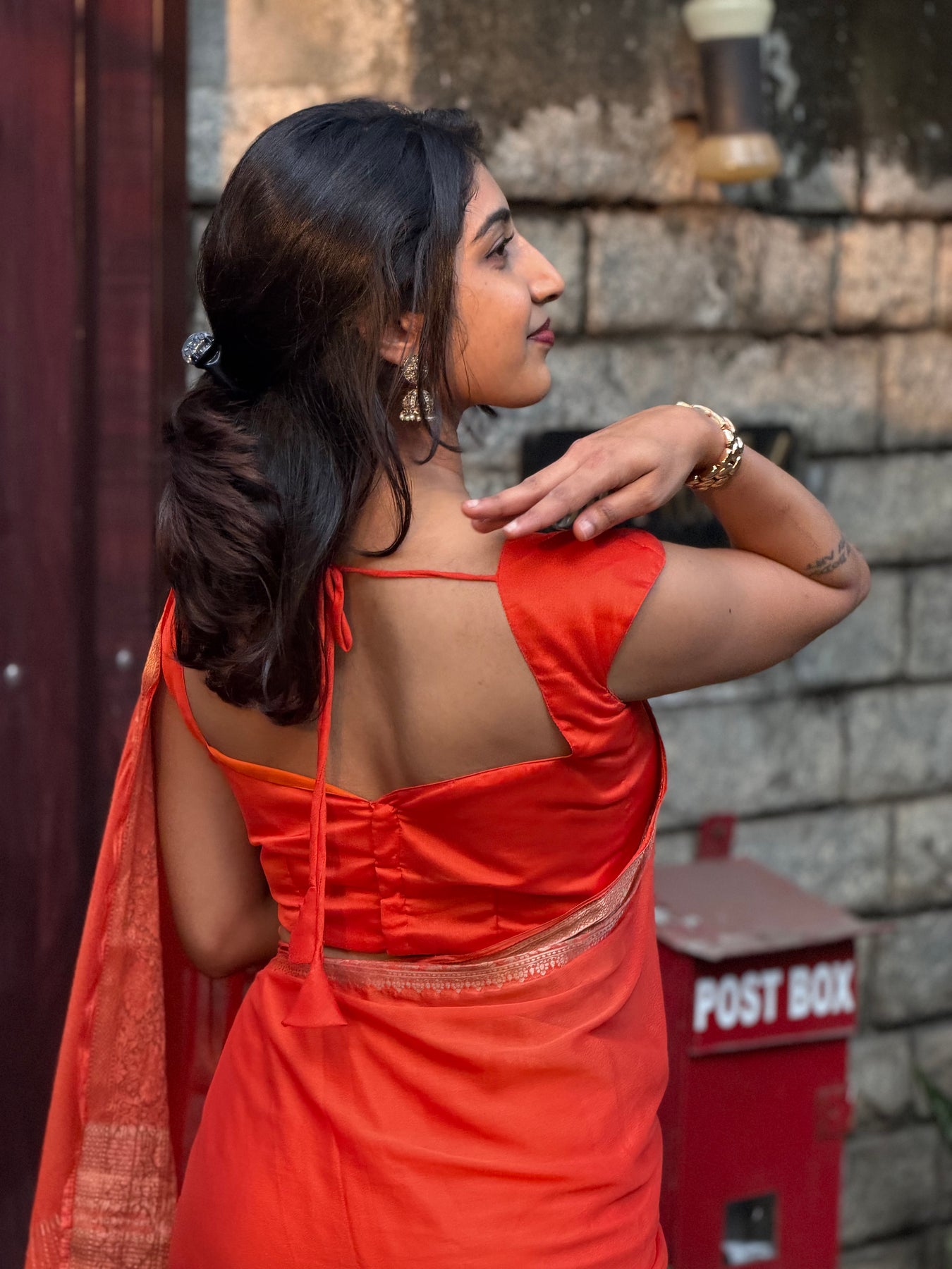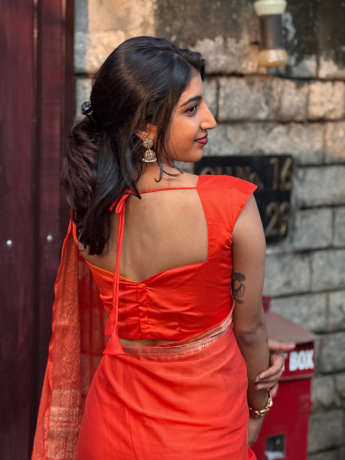 Warning: Prepare for endless stares and compliments in this dreamy burnt orange saree! Soft chinon silk that feels like a whisper and drapes like a dream, complete with a gorgeous border and a Banarasi silk blouse for that extra touch of elegance.