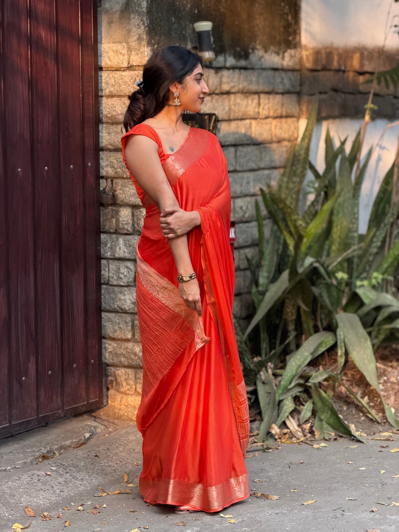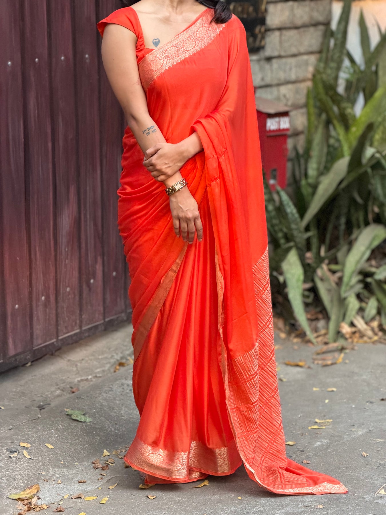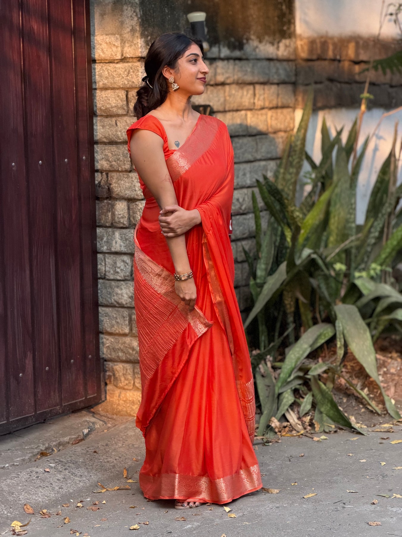 Warning: Prepare for endless stares and compliments in this dreamy burnt orange saree! Soft chinon silk that feels like a whisper and drapes like a dream, complete with a gorgeous border and a Banarasi silk blouse for that extra touch of elegance.
