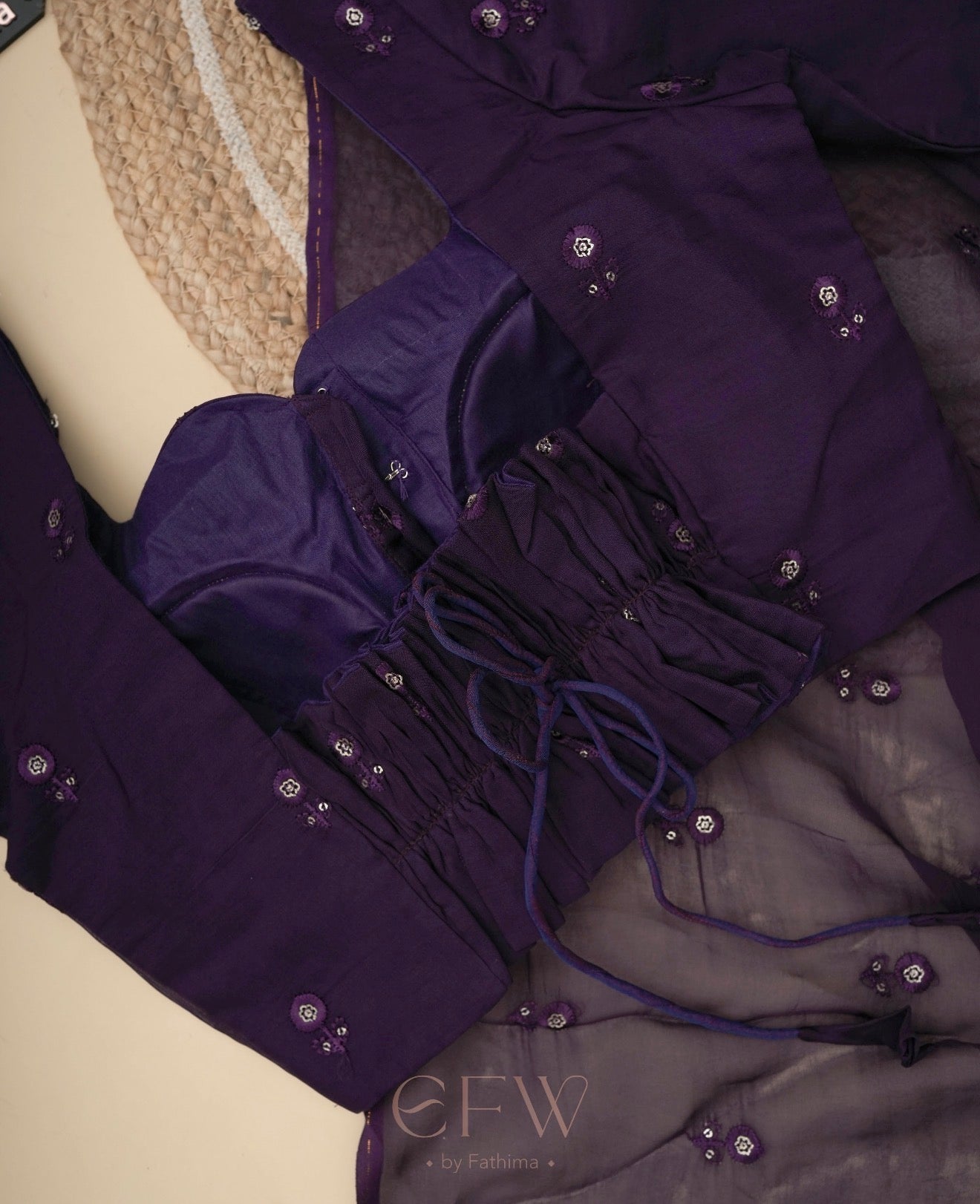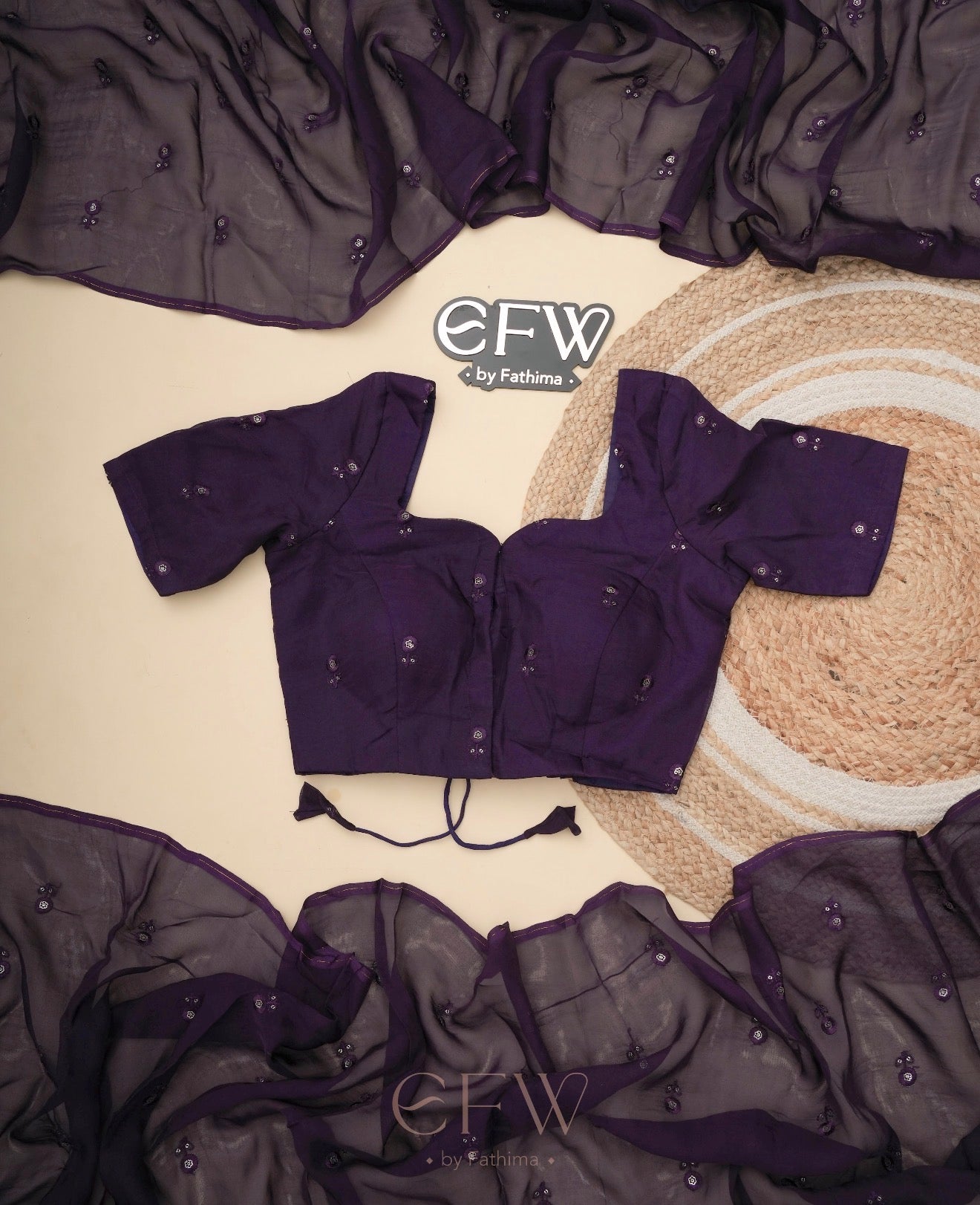 Paired with a customised blouse, thoughtfully designed to complement the saree's fluid texture and elevate the overall look. A timeless combination made for intimate celebrations, festive evenings, and refined occasions.