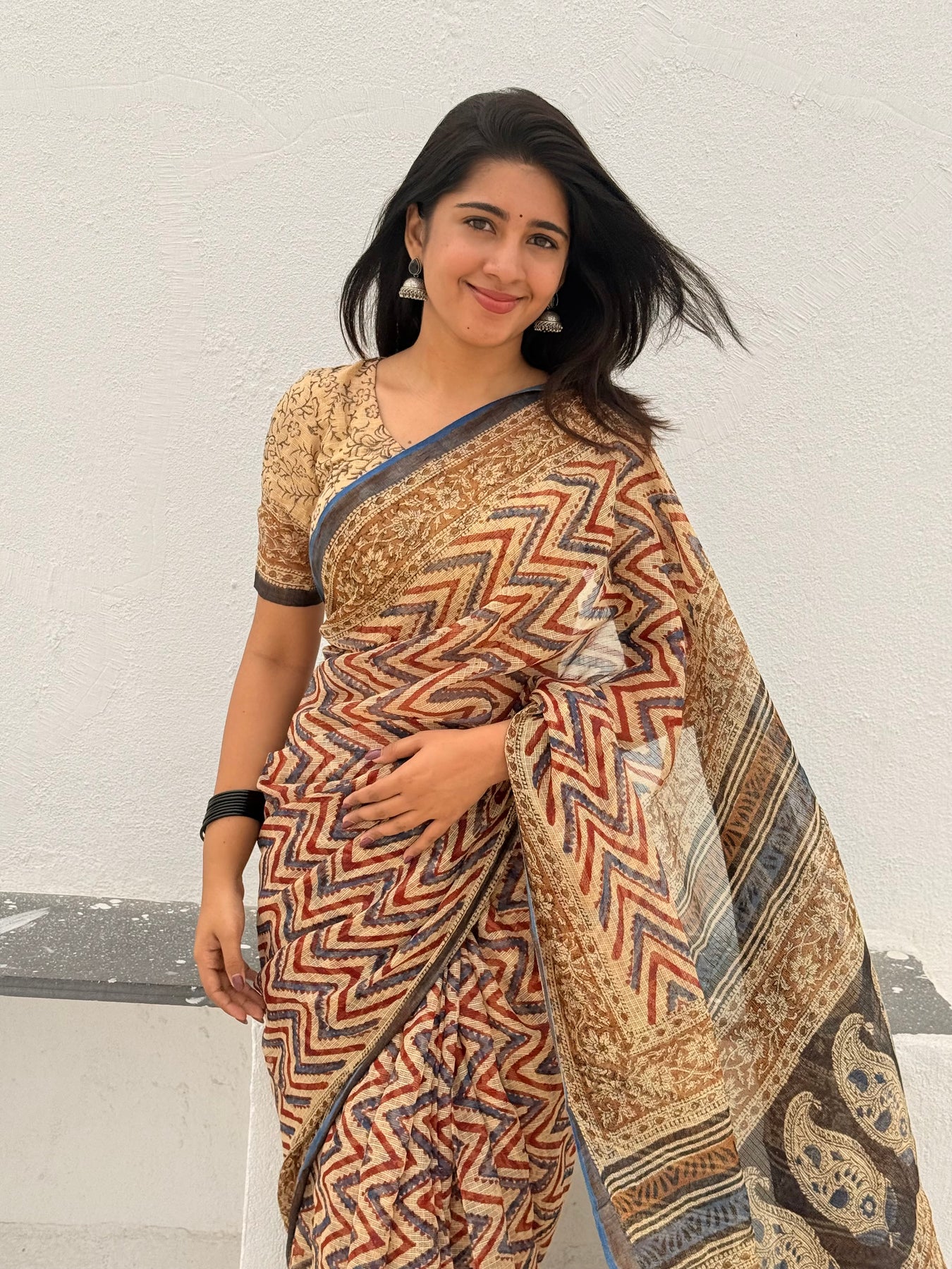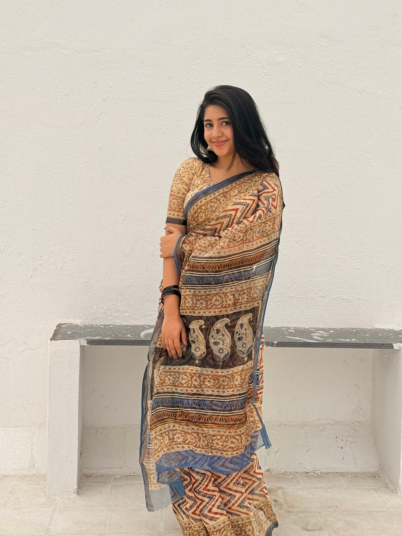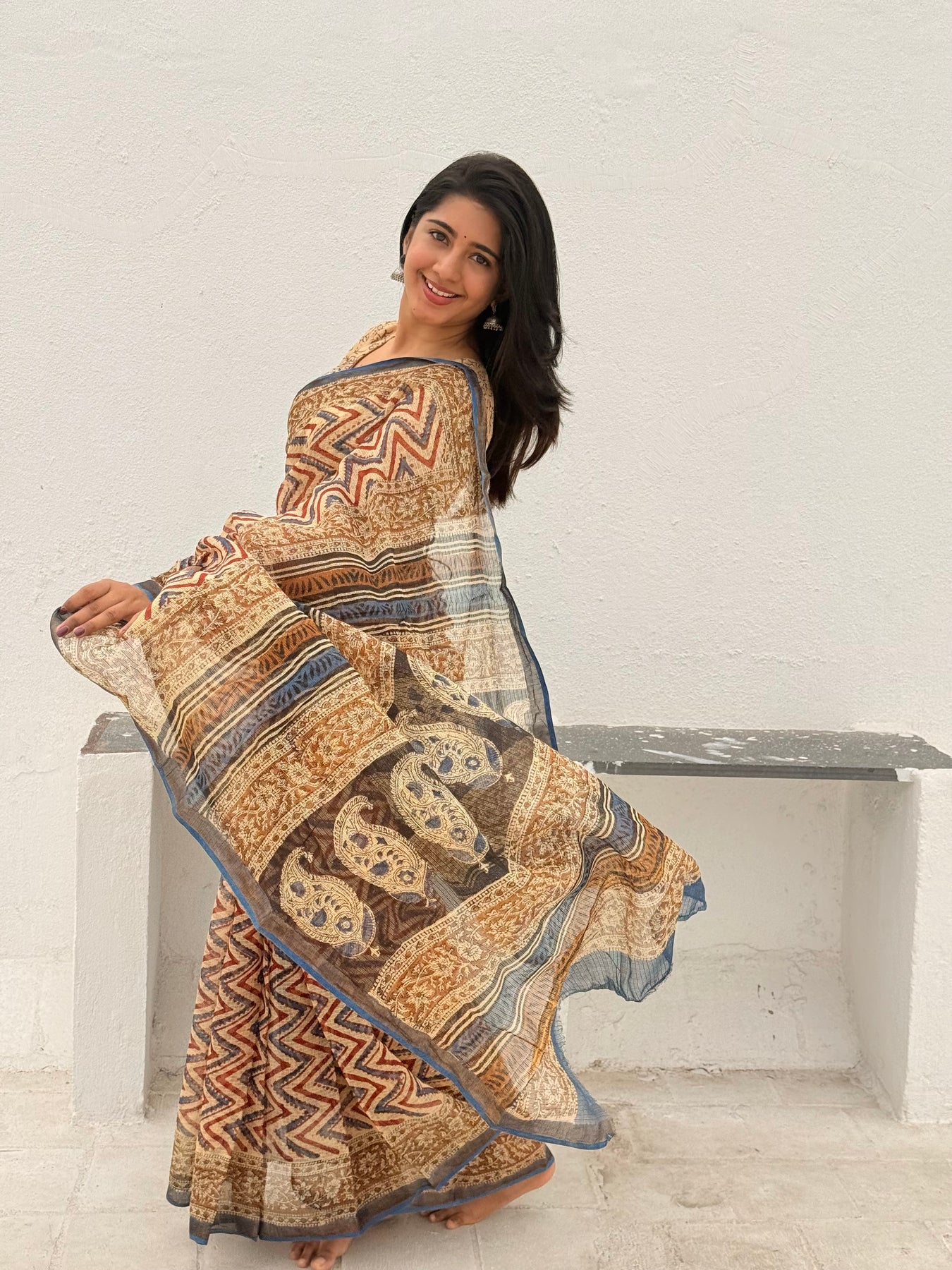 A beautiful soft cozy pure kota doriya saree with beautiful handblock bagru prints comes in shade of beige,maroon and black with golden border