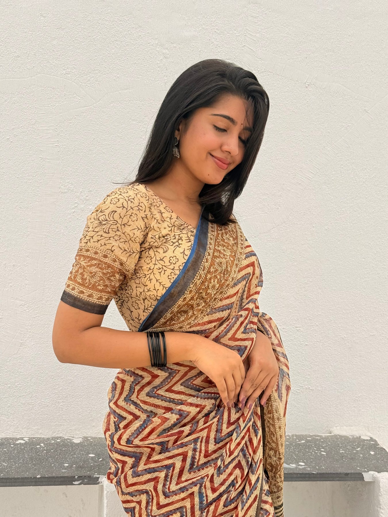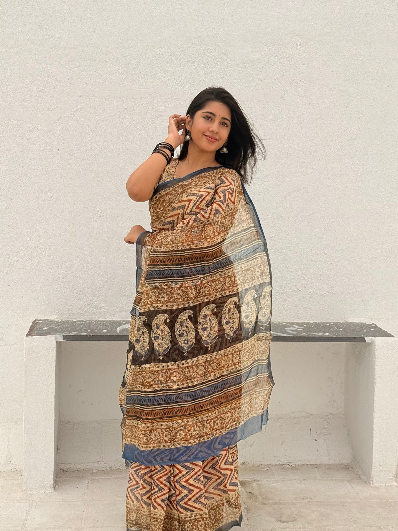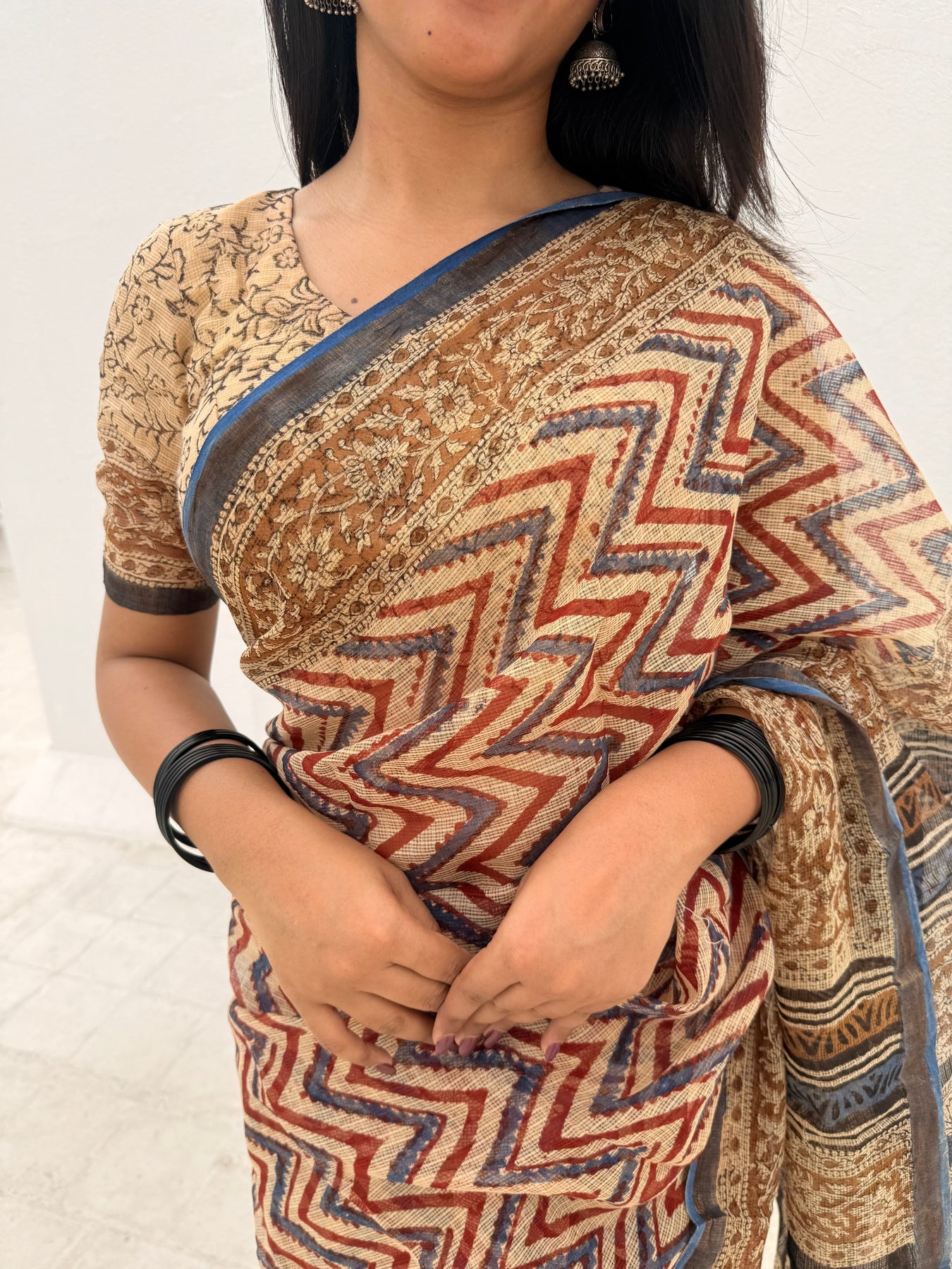 A beautiful soft cozy pure kota doriya saree with beautiful handblock bagru prints comes in shade of beige,maroon and black with golden border