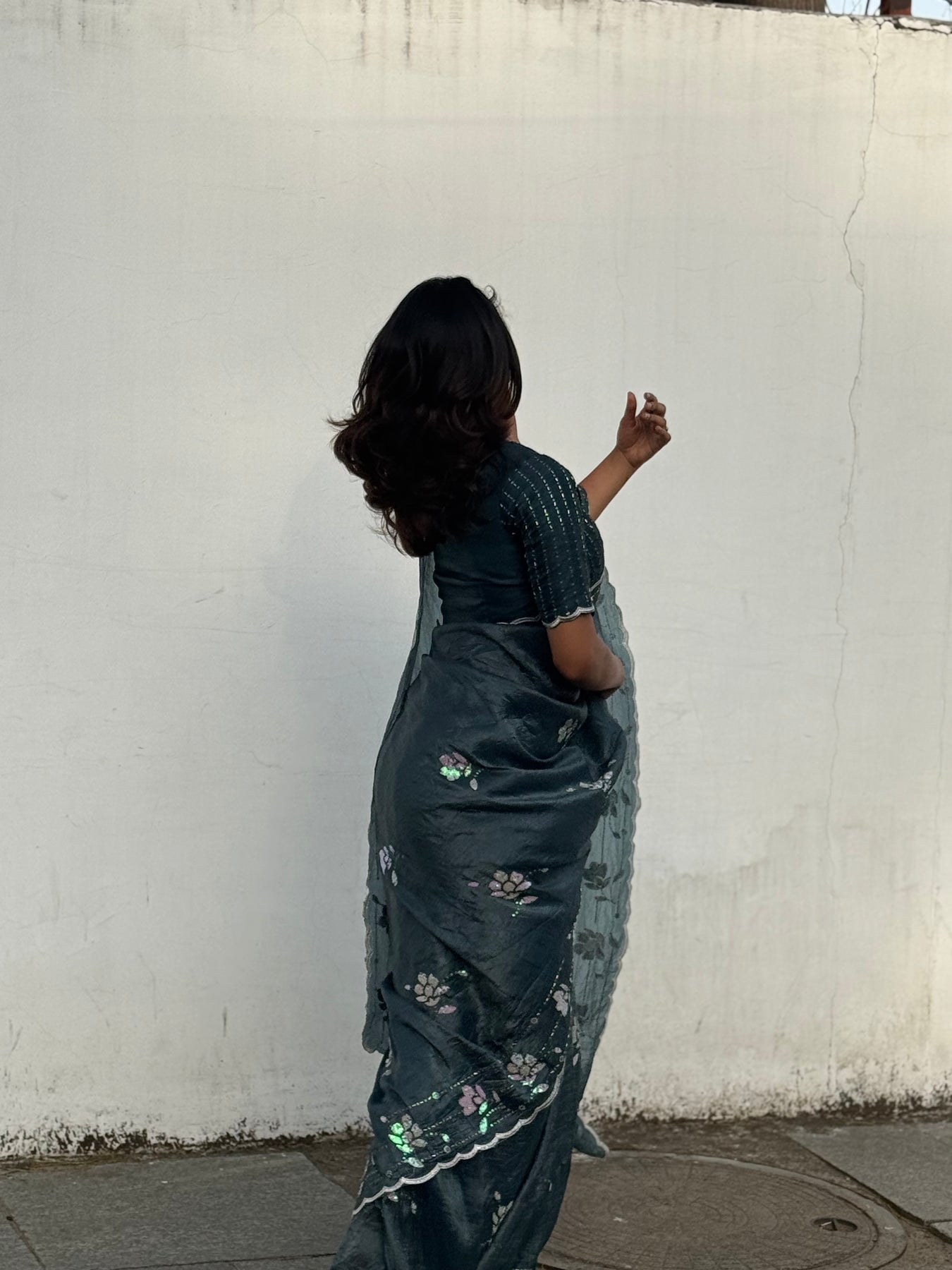Calling all soft saree lovers! Don't miss this chance to stand out! Our exquisite crushed silk saree with exquisite sequins embroidery work