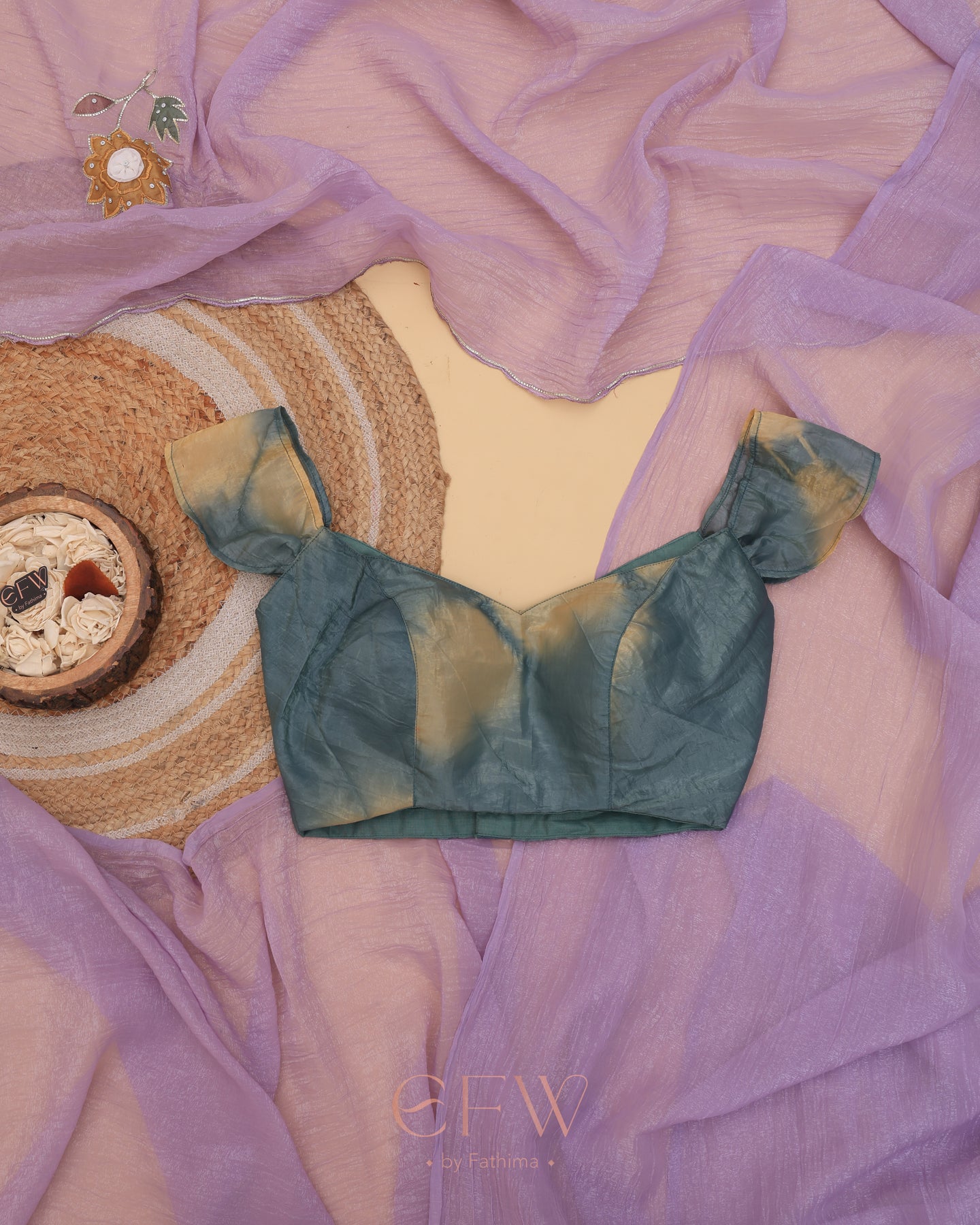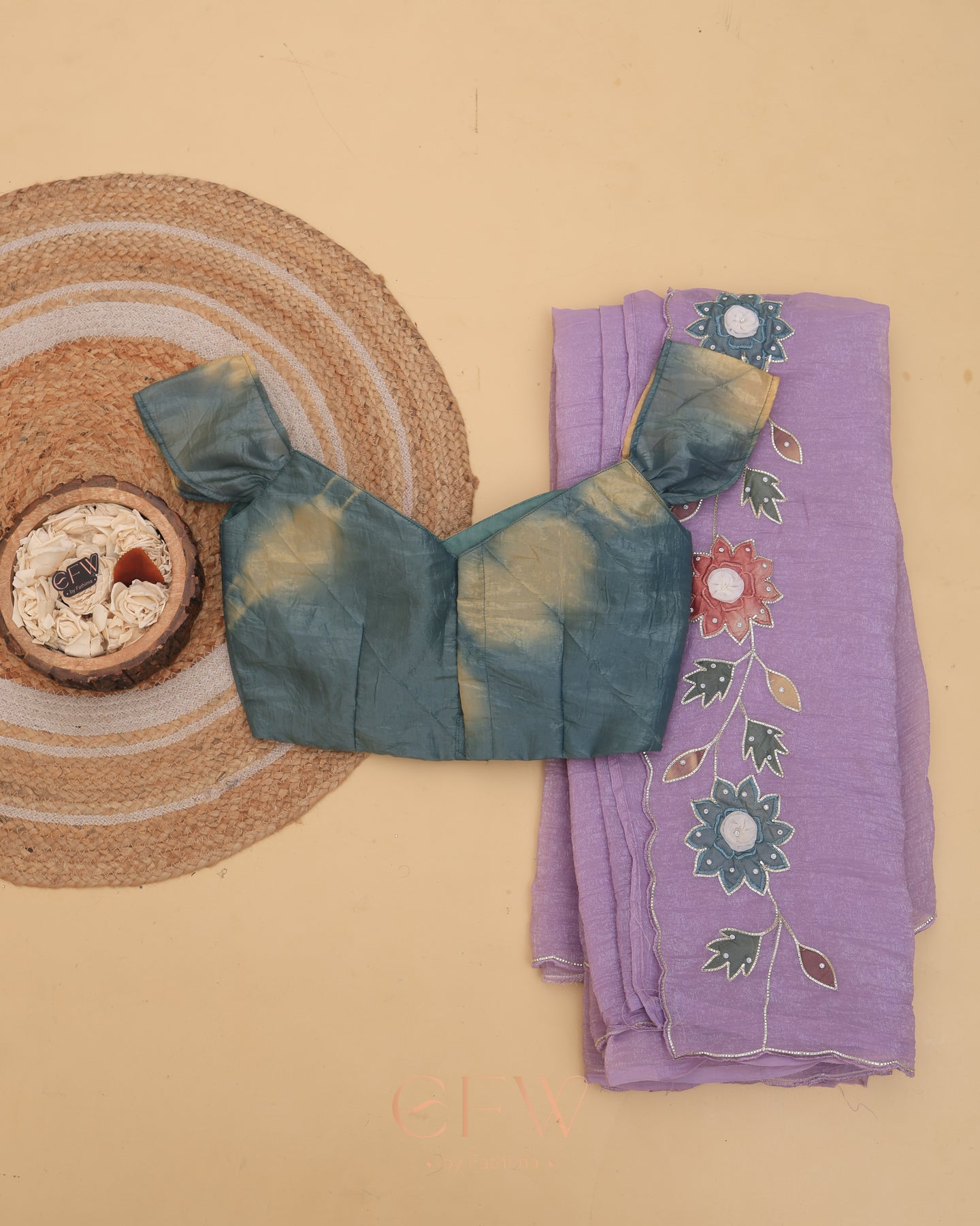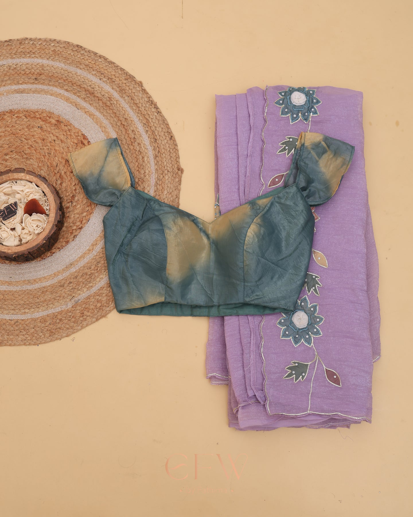 The saree is a light, tissue organza kind fabric with a subtle sheen, giving it a luxurious and airy feel. The fabric drapes beautifully, reflecting light to create an ethereal effect. The saree maintains a minimalist elegance, allowing the 3D Floral pattern and customised blouse to be the statement piece.