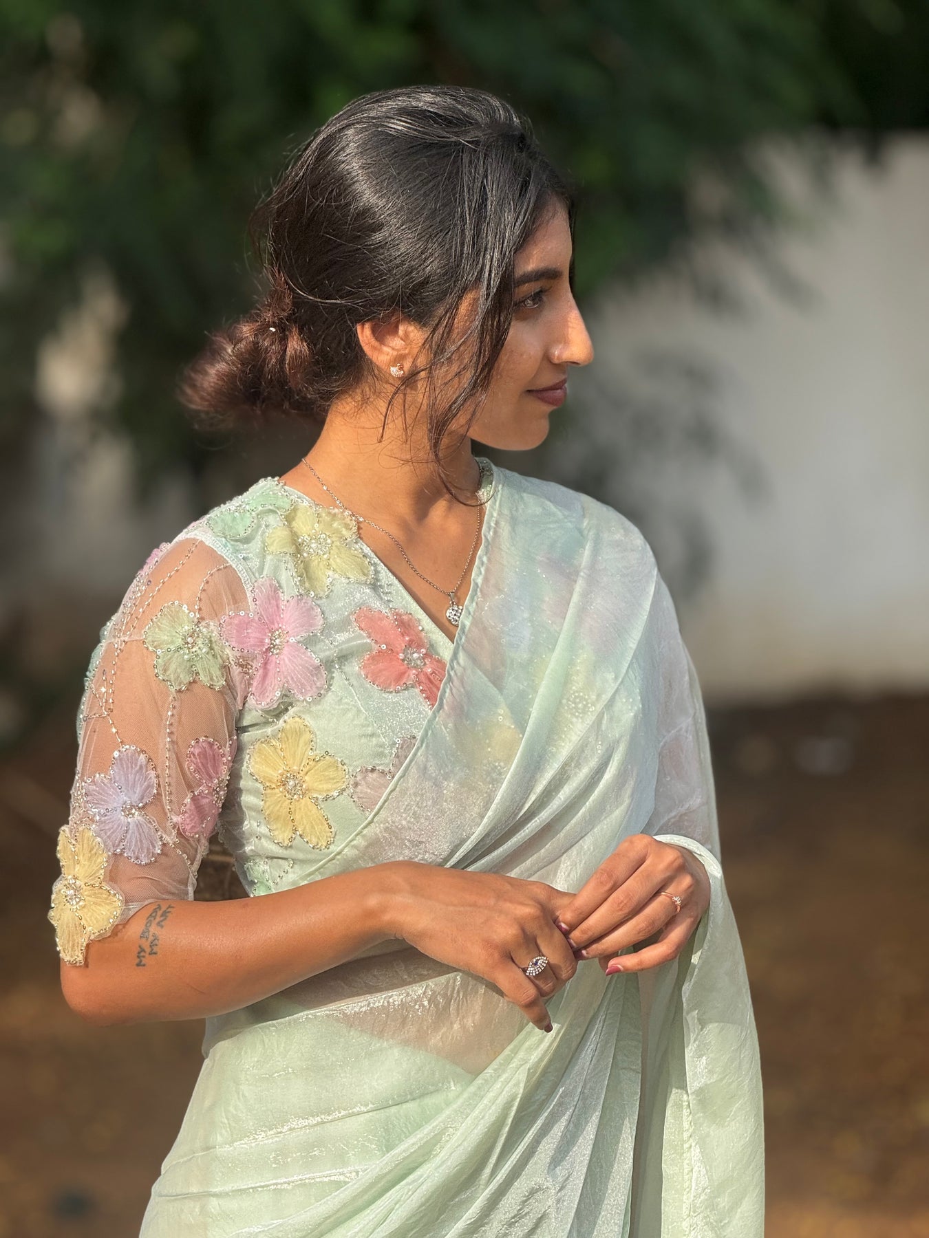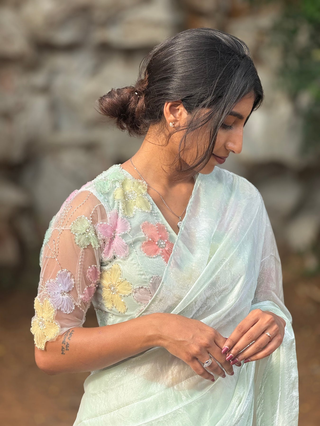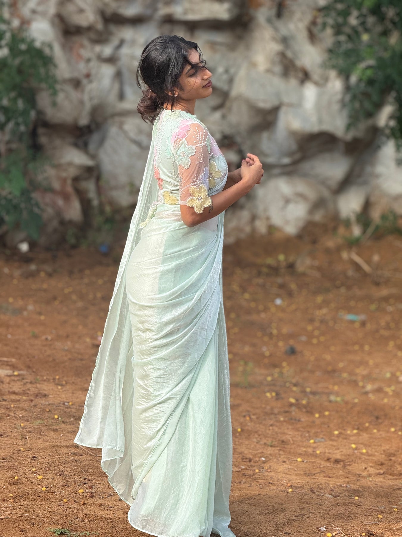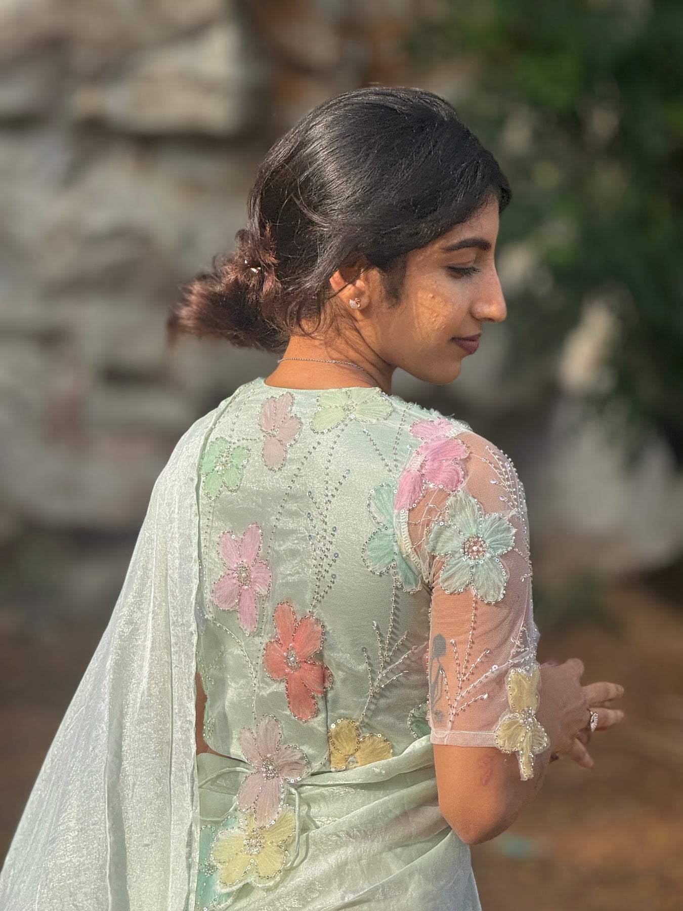 The statement blouse, a true masterpiece — adorned with hand-appliquéd 3D floral embroidery in delicate pastel shades. Each bloom is finished with tiny pearls and sequins, placed with care to highlight the bust and sleeves. The sheer sleeve detailing adds elegance, while the rounded neckline and back ties with floral tassels bring in charm and couture-level detail.
