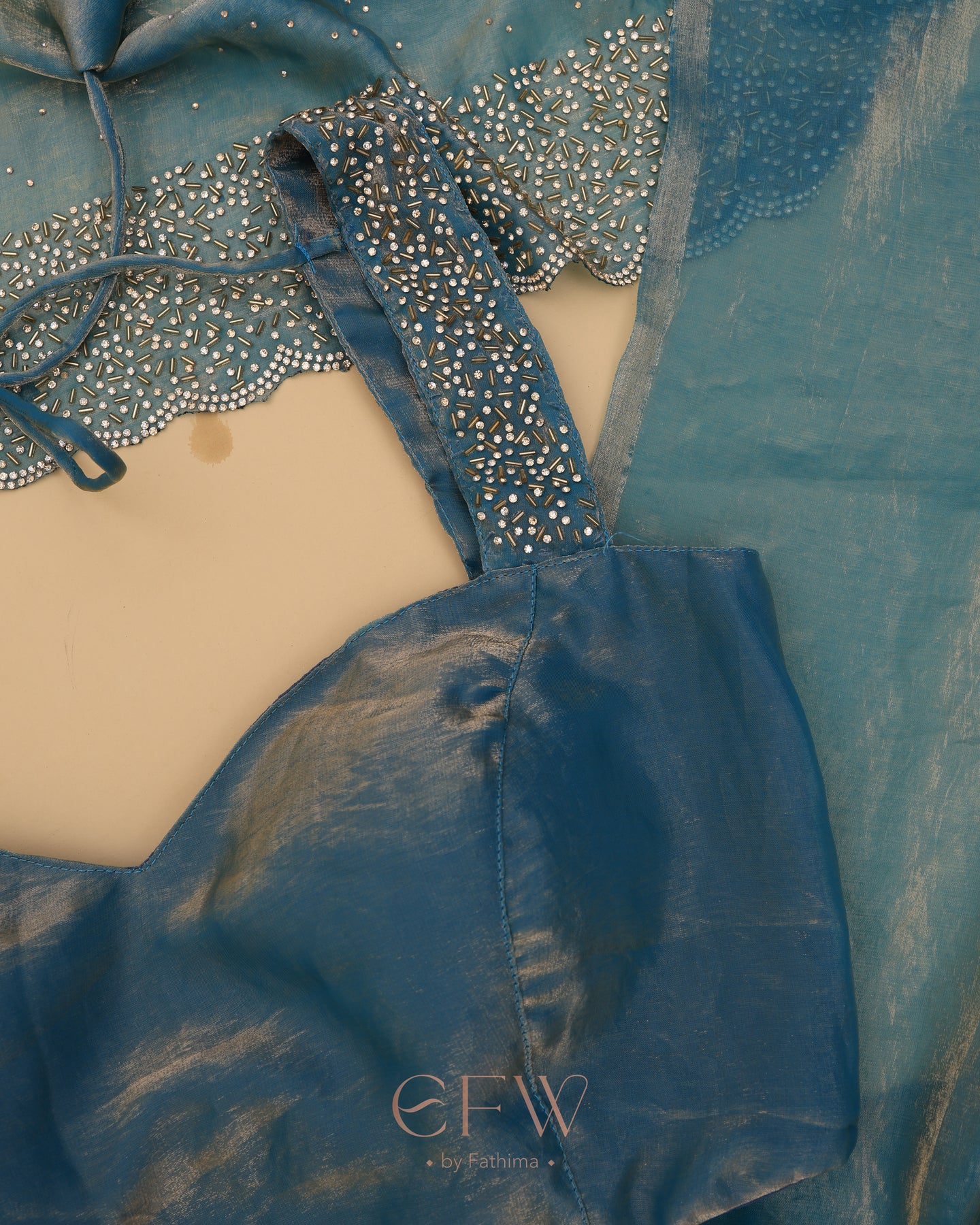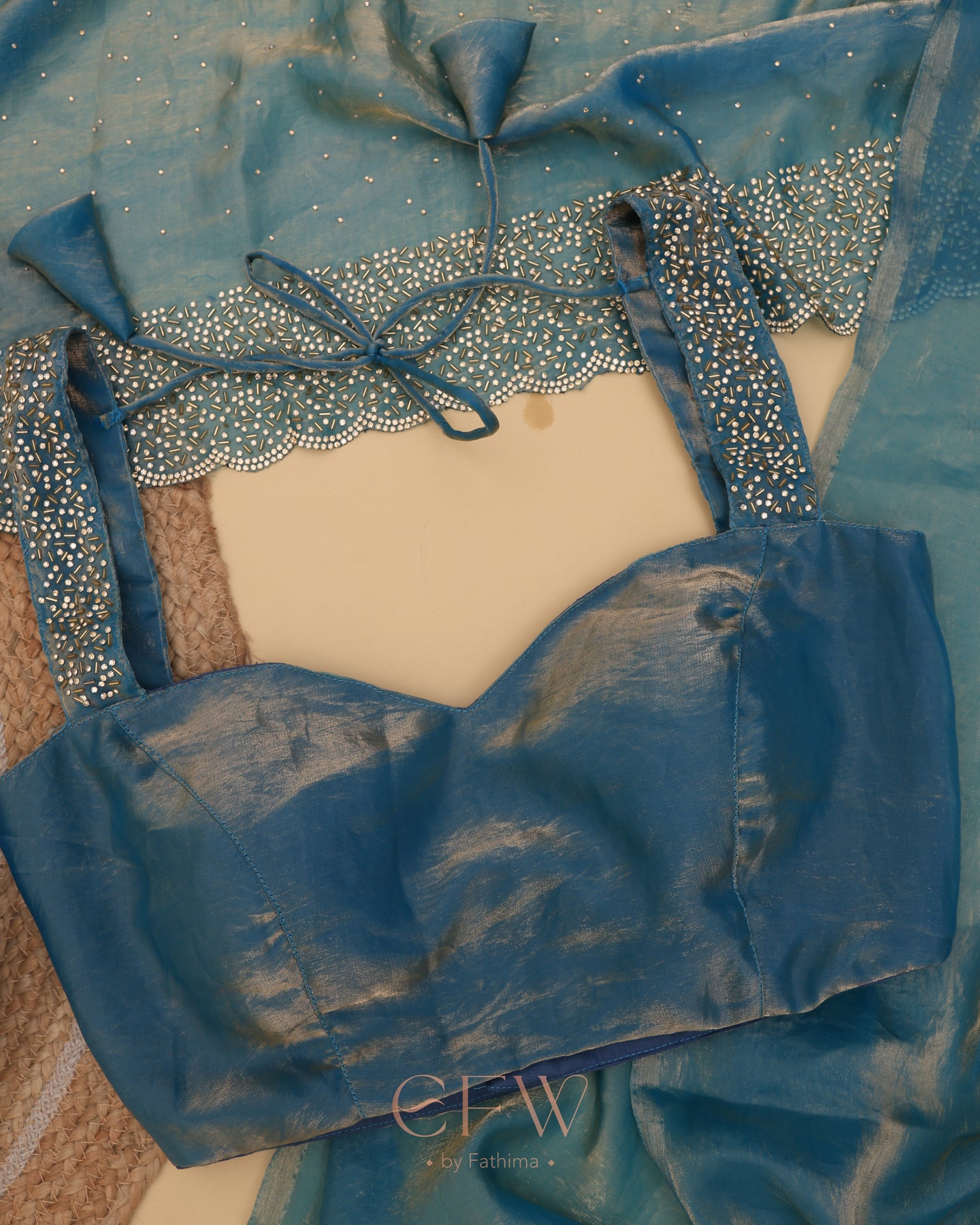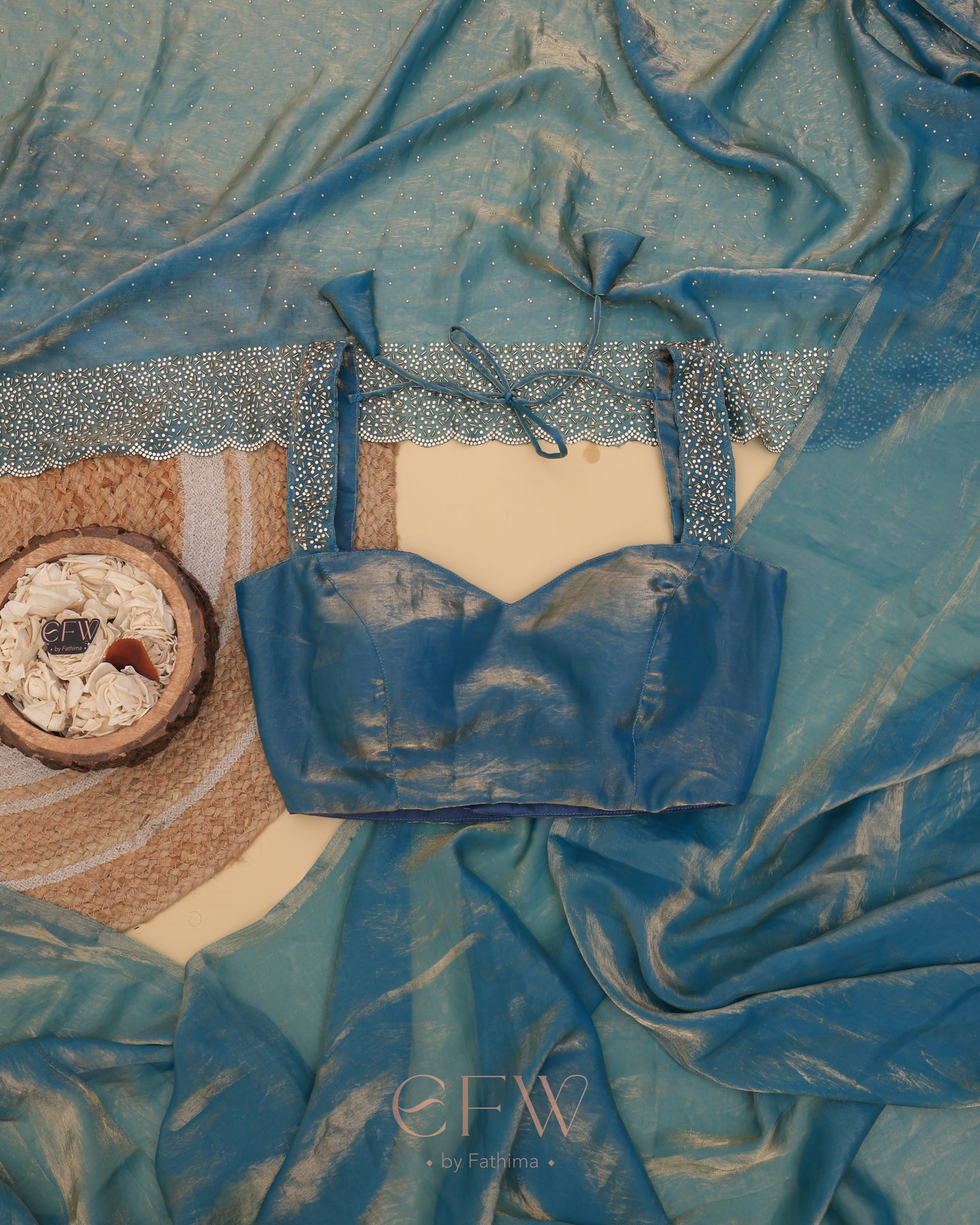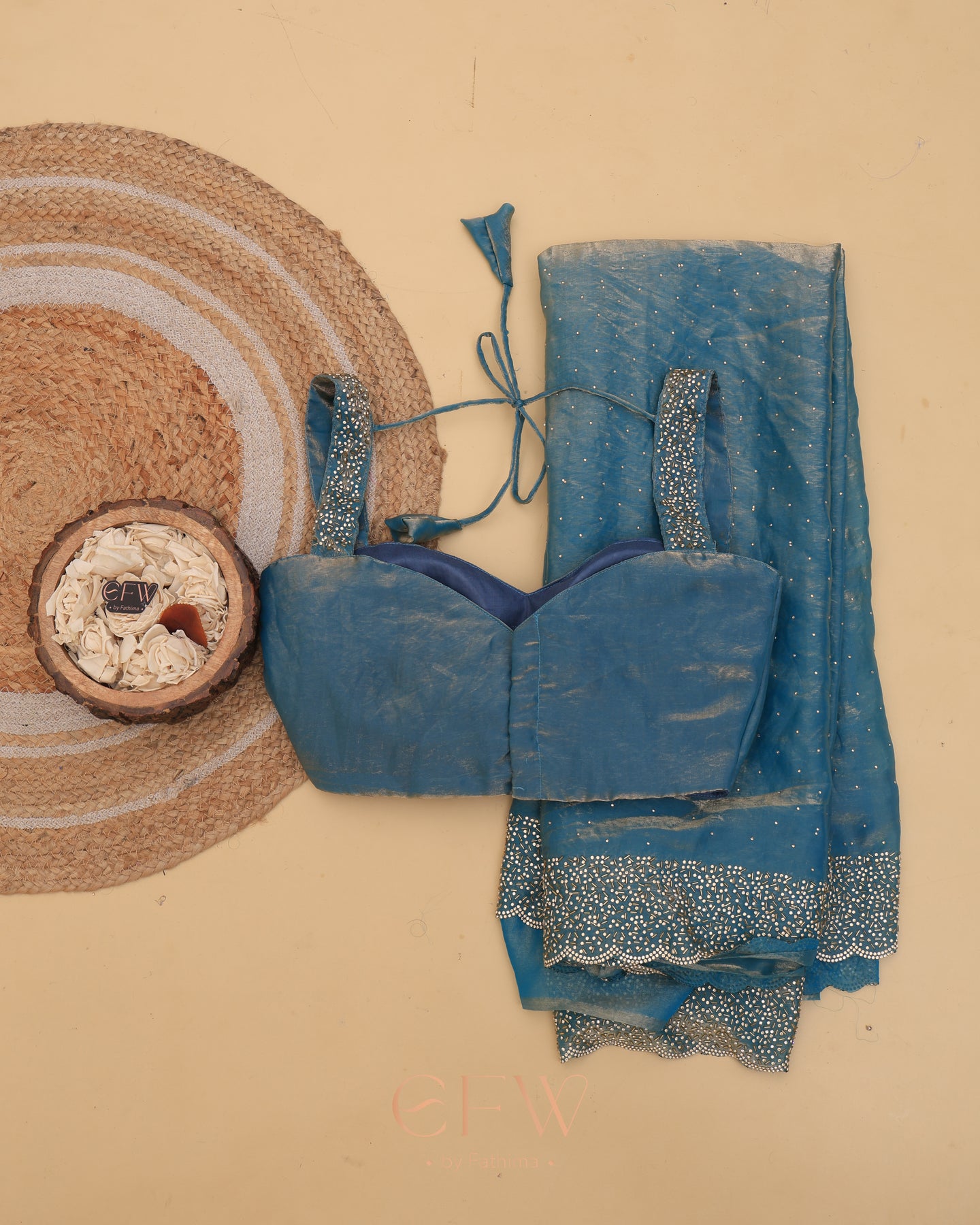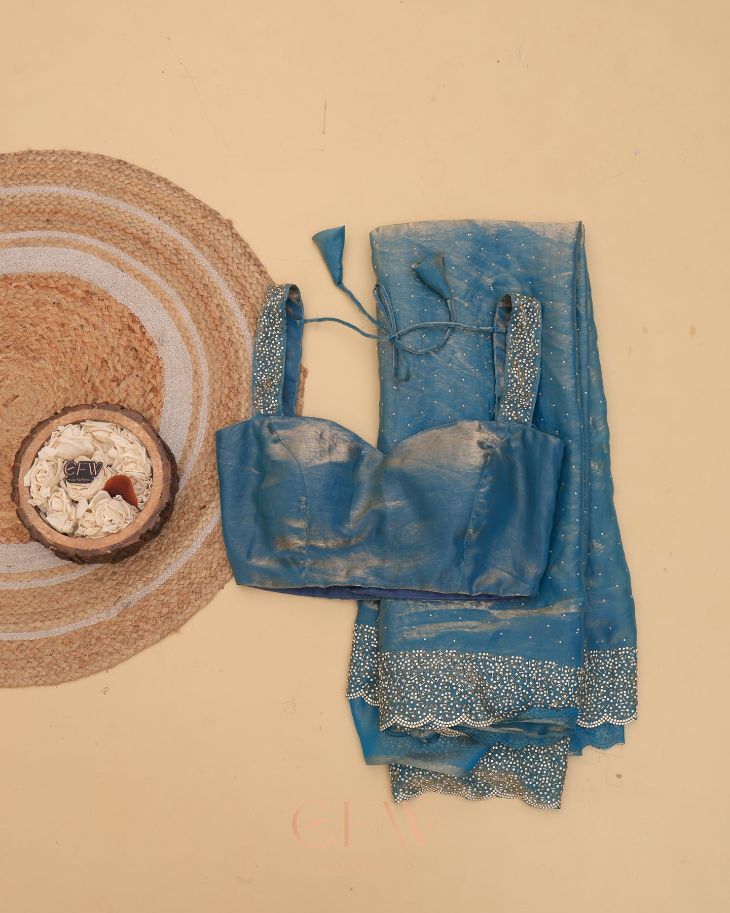 Adorned with intricate stonework throughout, this semi tissue silk saree flows effortlessly and features a beautifully detailed border that adds just the right touch of grace. Available in a range of stunning shades, it’s perfect for parties, weddings, and all your special events.
