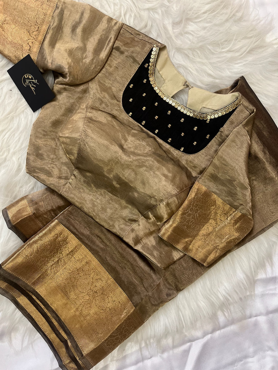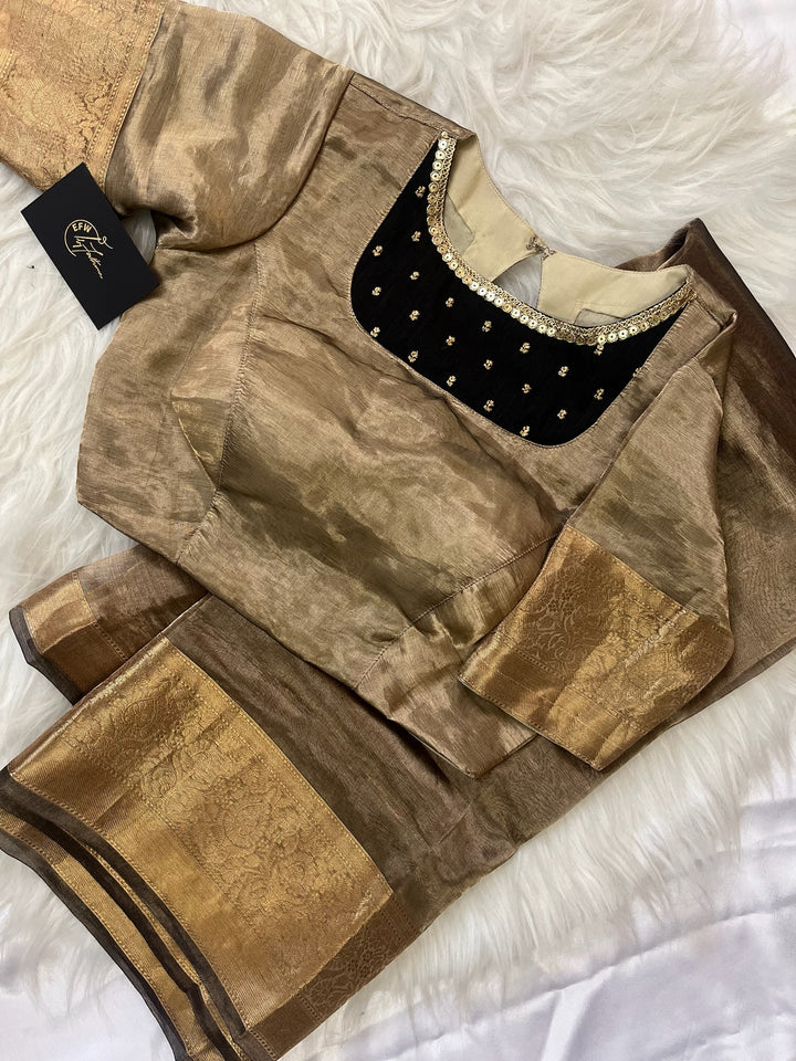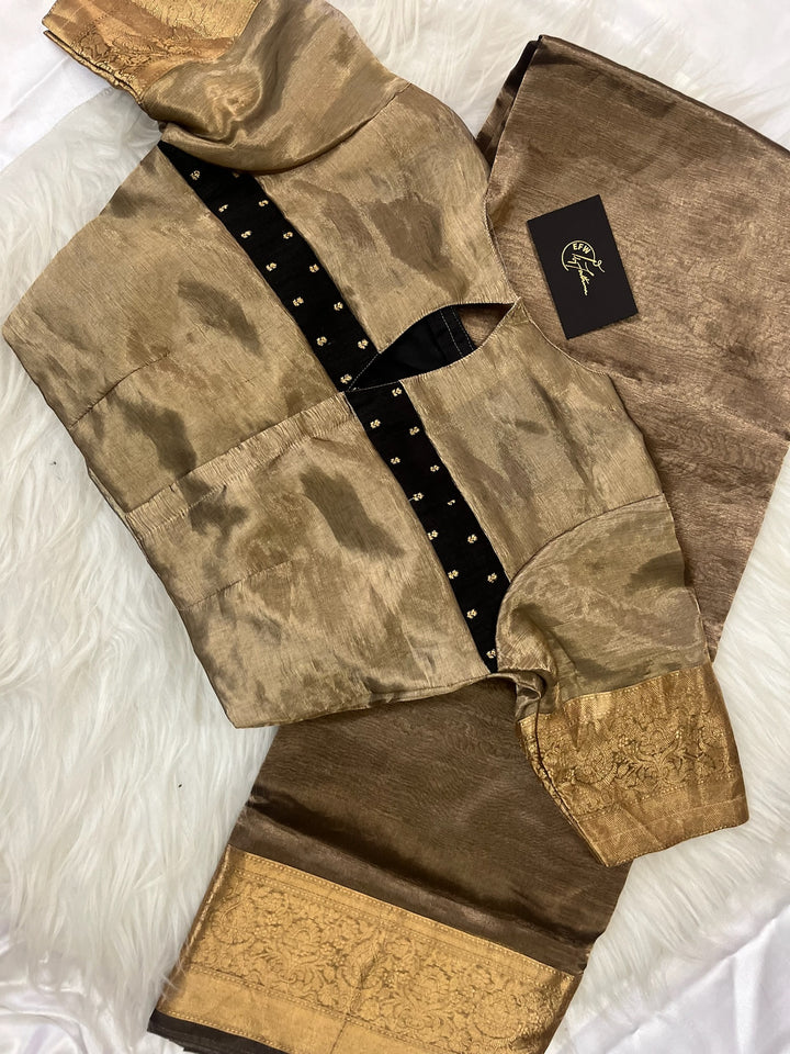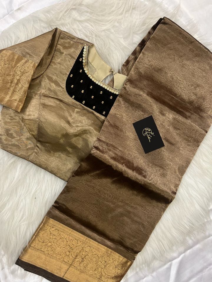 As many have been asking us to launch pure tissue organza silk sarees and the wait is over! Metallic pure tissue saree with golden zari woven border. This is a pure tissue silk saree that is lightweight and just feels regal attire when worn. The WOW factor of the saree is that it can be customised in any color.