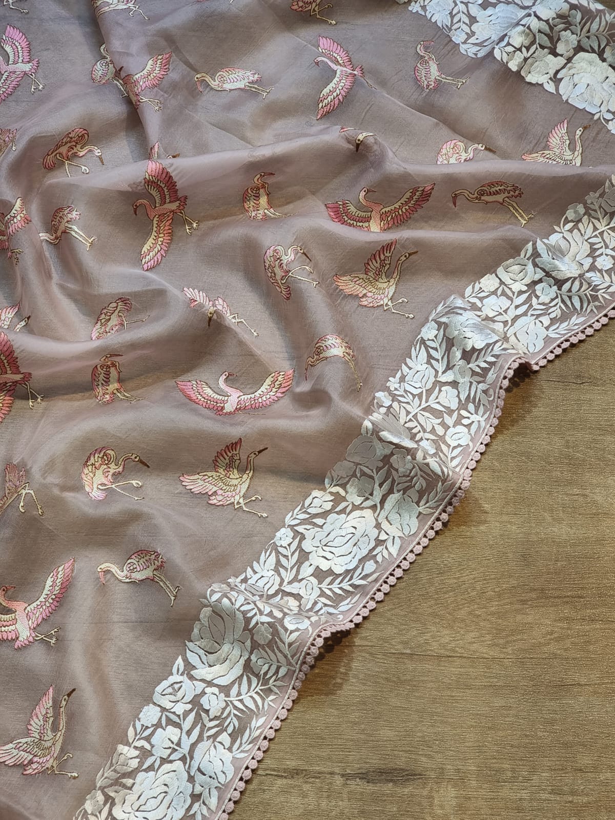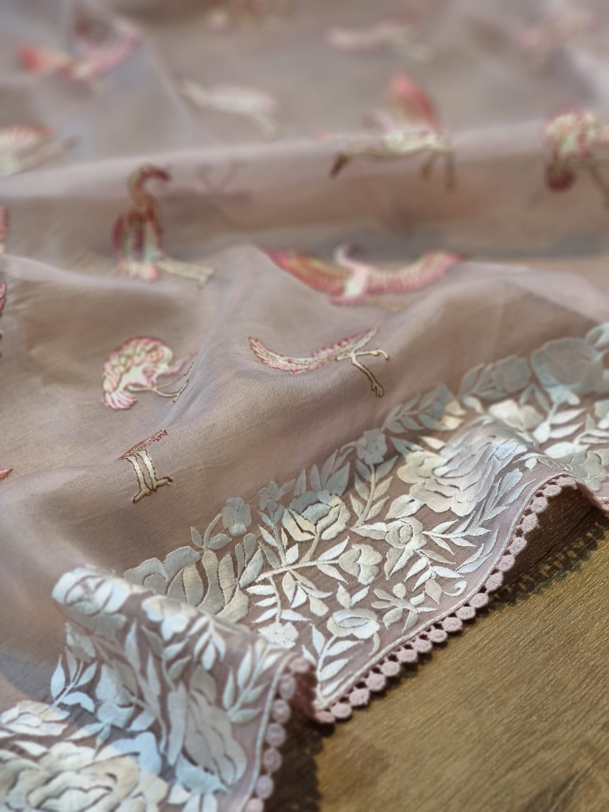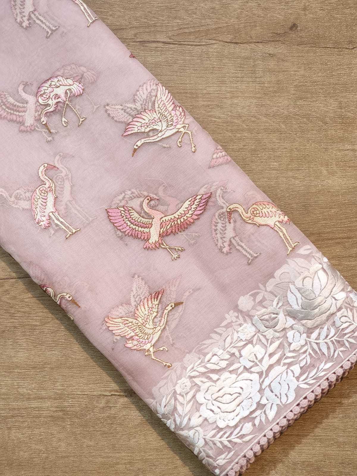 POONARAI is a must-have for any fashion-forward individual. Made from pure organza silk, the intricate embroidery, and parsi border showcase stunning craftsmanship. With a unique design featuring flamingo birds and crochet lace, this piece is truly one of a kind. Elevate your style and stand out from the crowd with POONARAI.