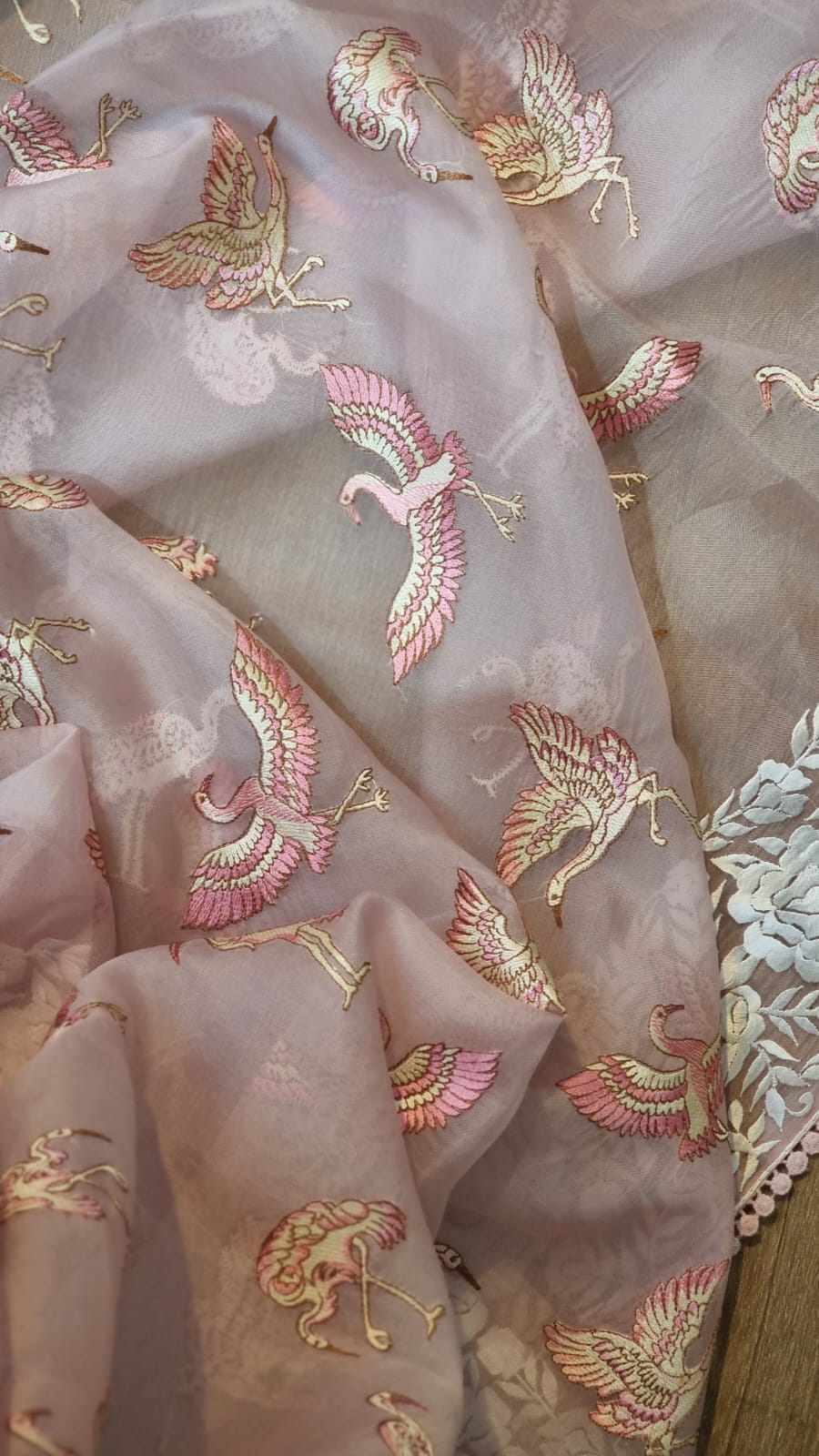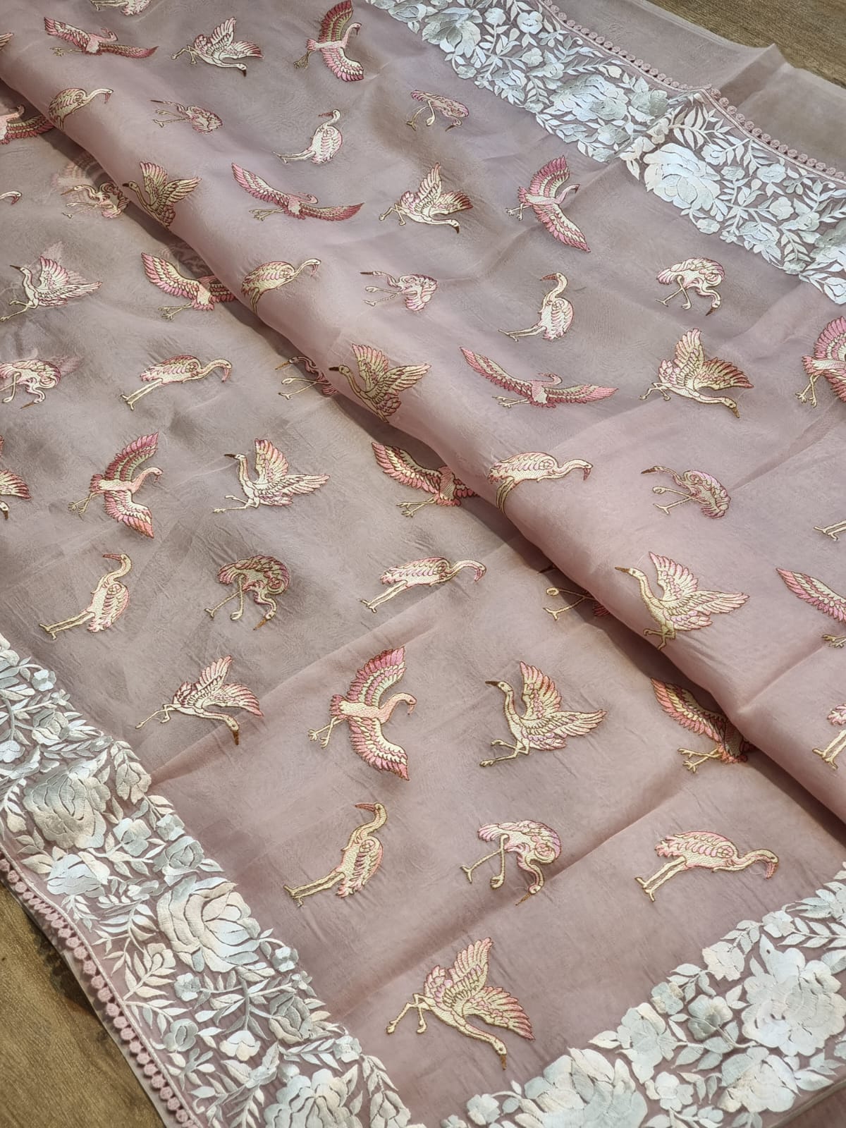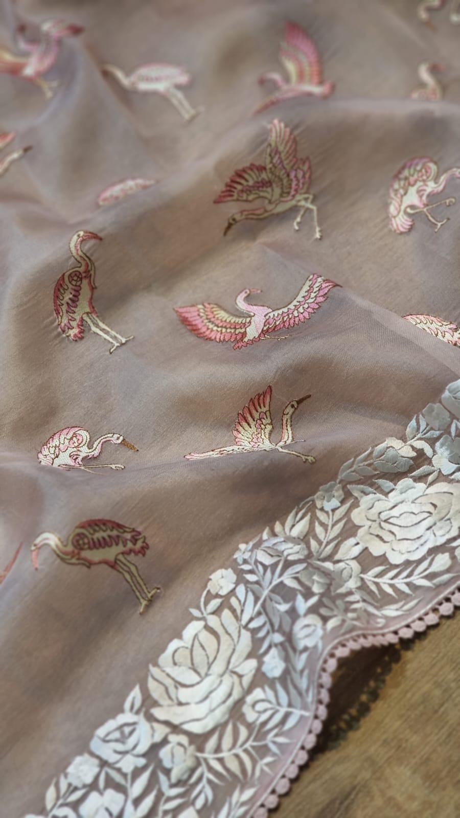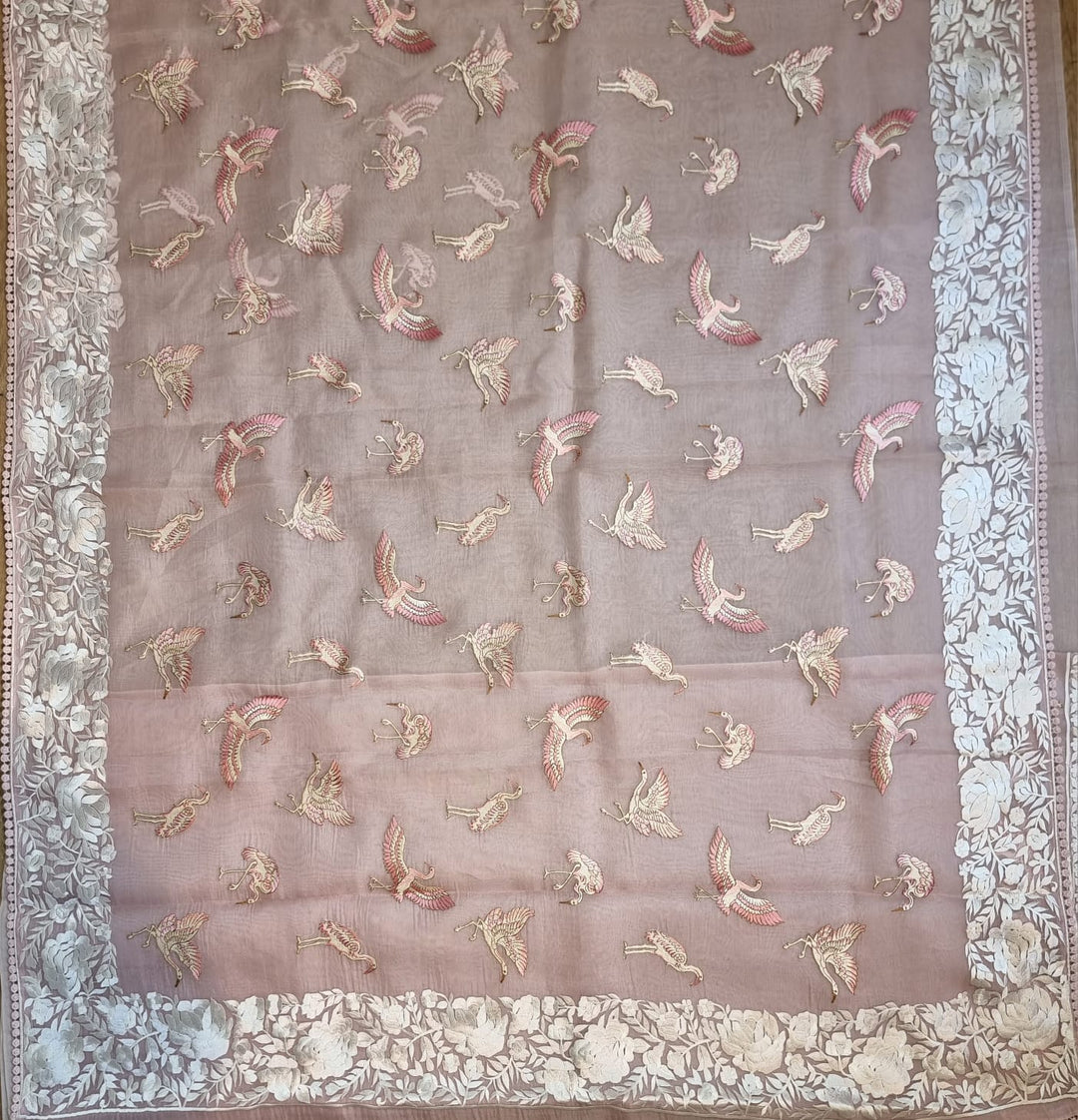 POONARAI is a must-have for any fashion-forward individual. Made from pure organza silk, the intricate embroidery, and parsi border showcase stunning craftsmanship. With a unique design featuring flamingo birds and crochet lace, this piece is truly one of a kind. Elevate your style and stand out from the crowd with POONARAI.