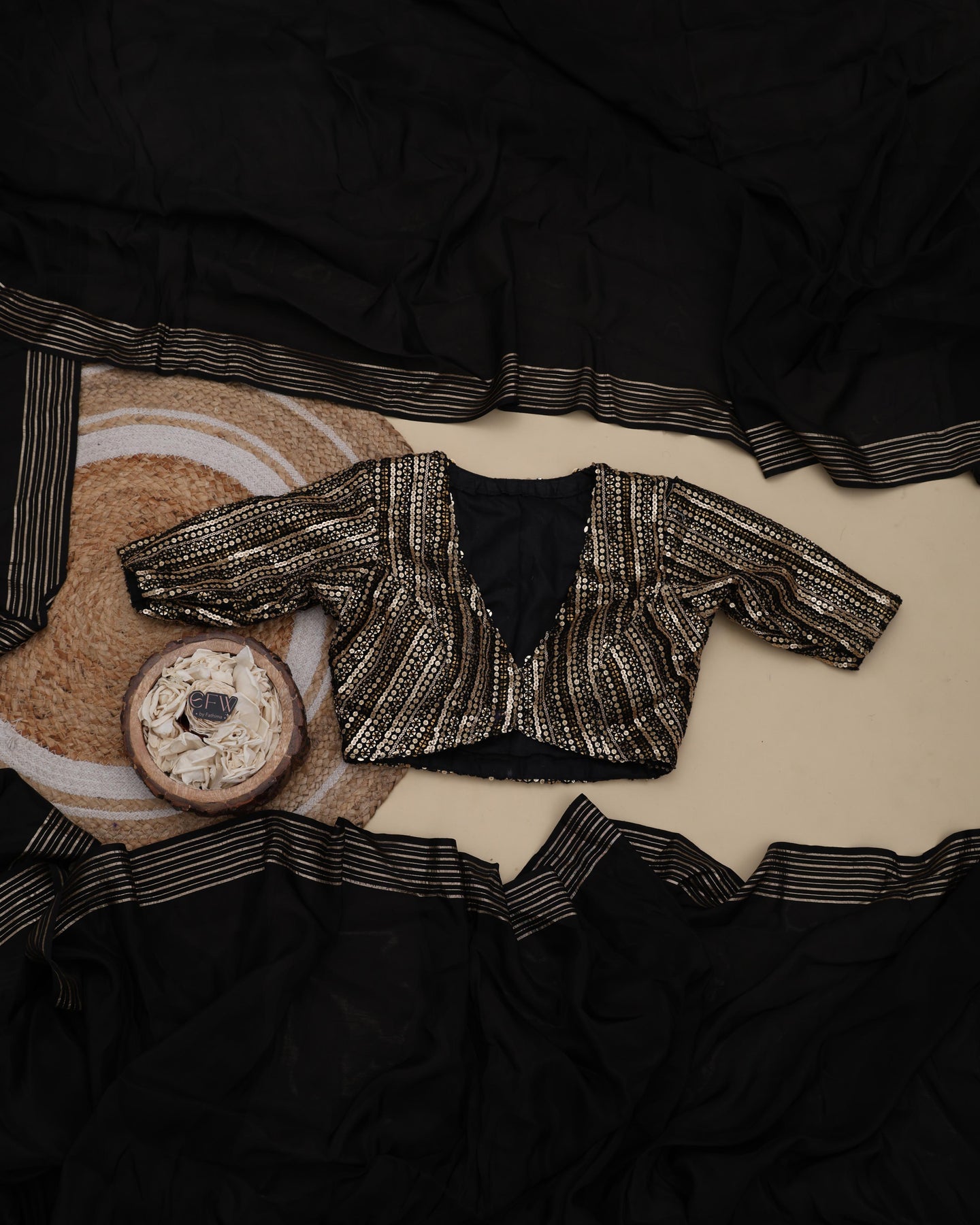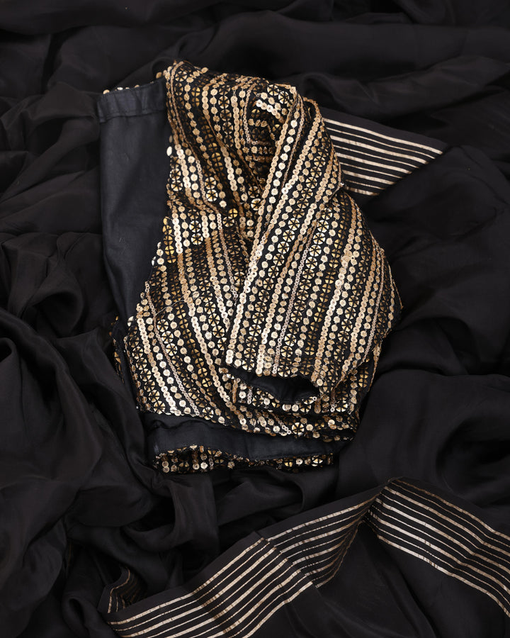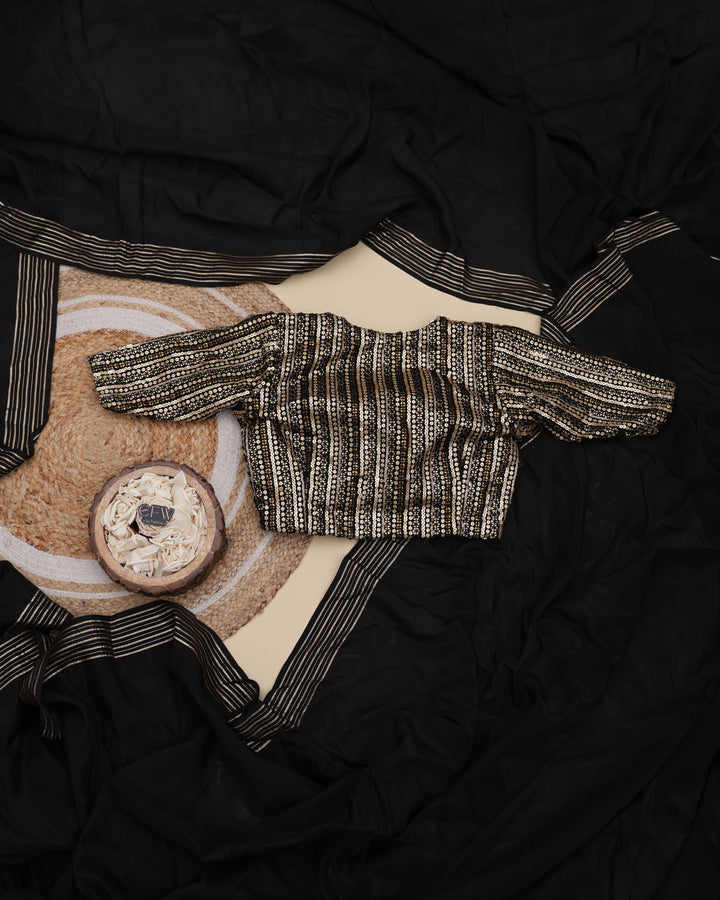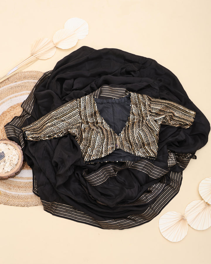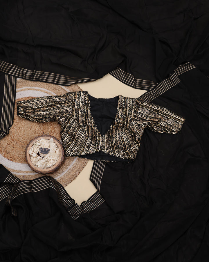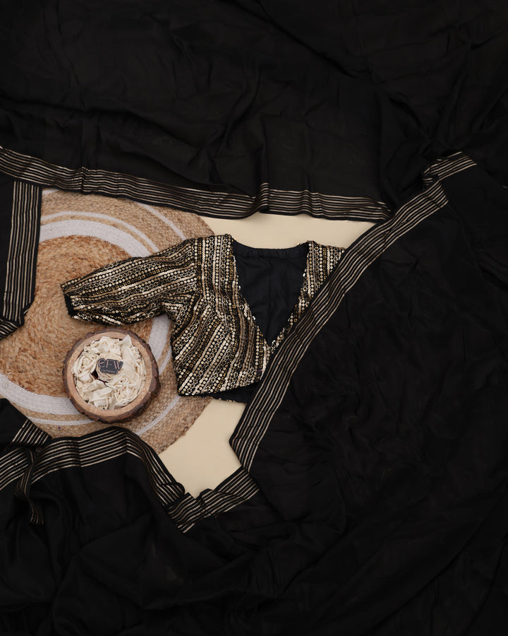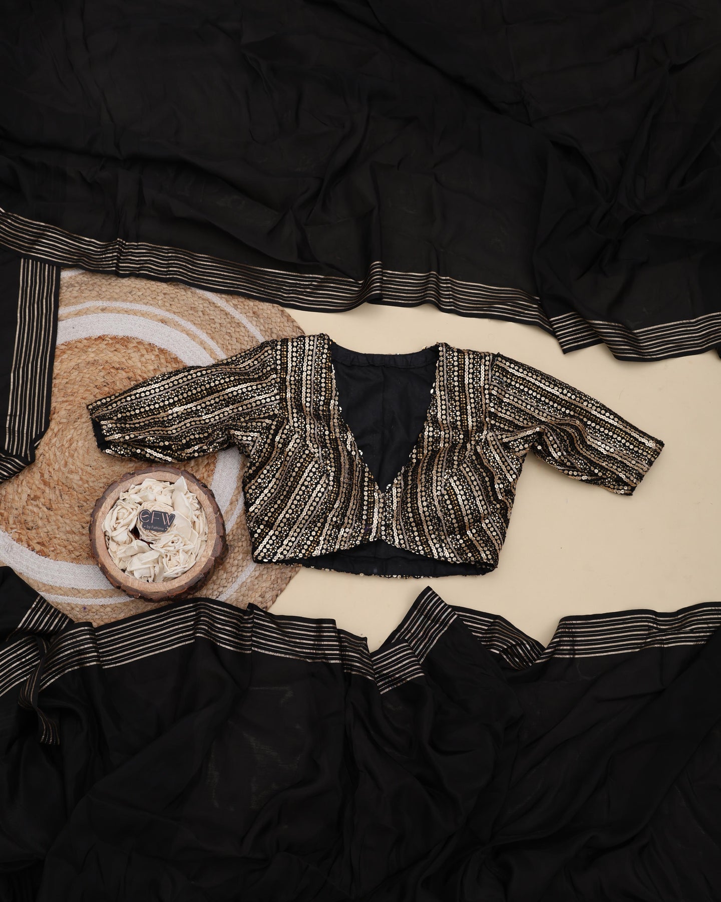 Warning: Prepare for endless stares and compliments in this dreamy dark black saree! Soft chinon silk that feels like a whisper and drapes like a dream, complete with a gorgeous border and a Banarasi silk blouse for that extra touch of elegance.