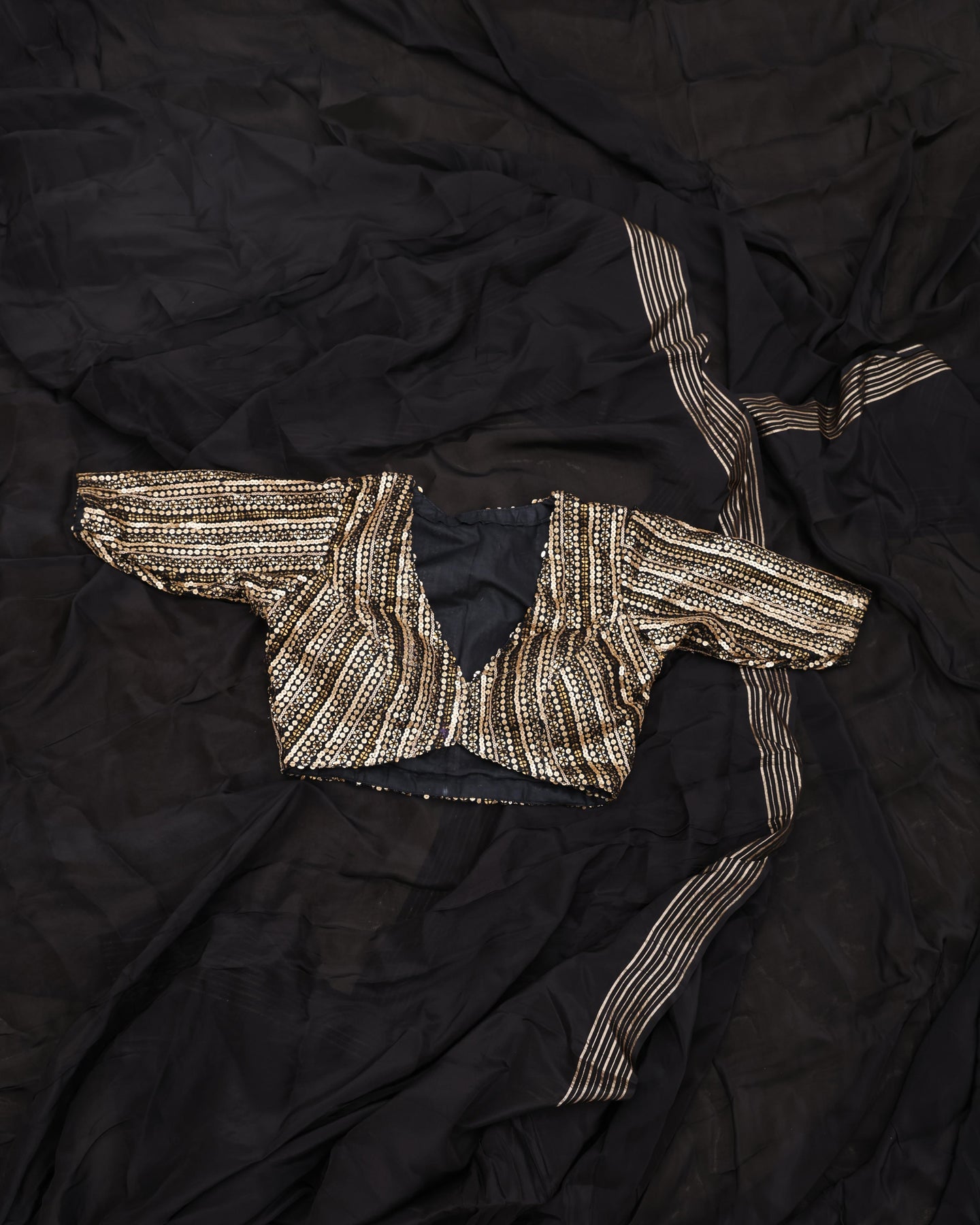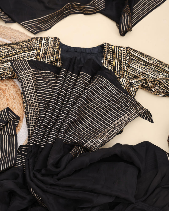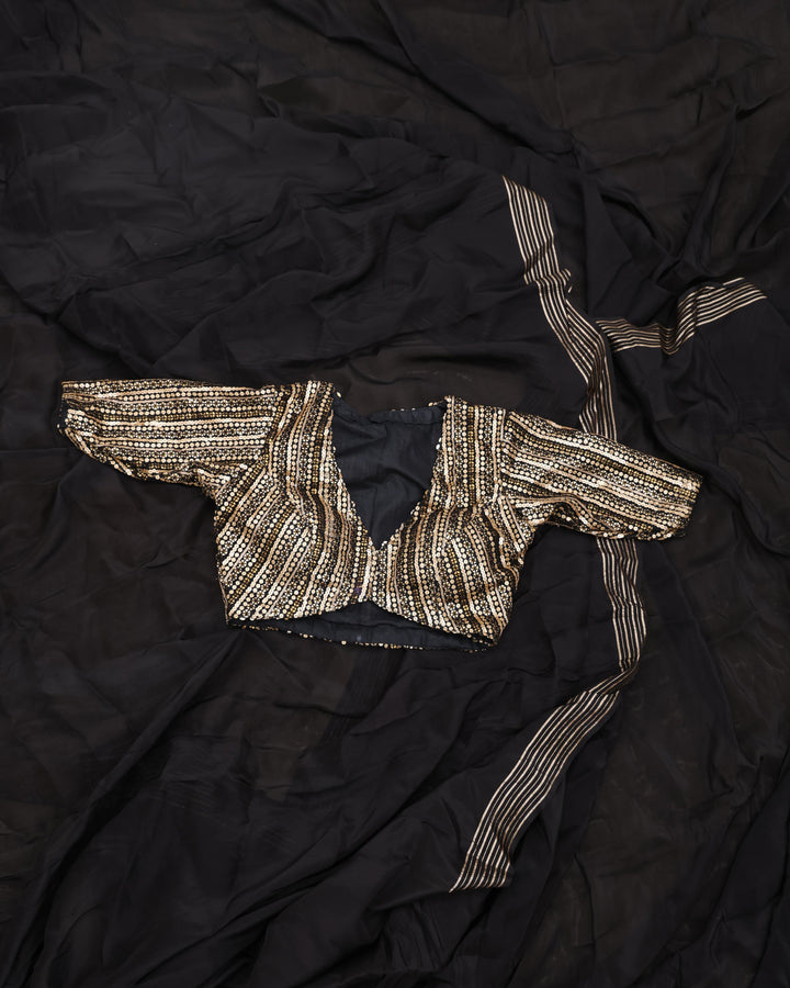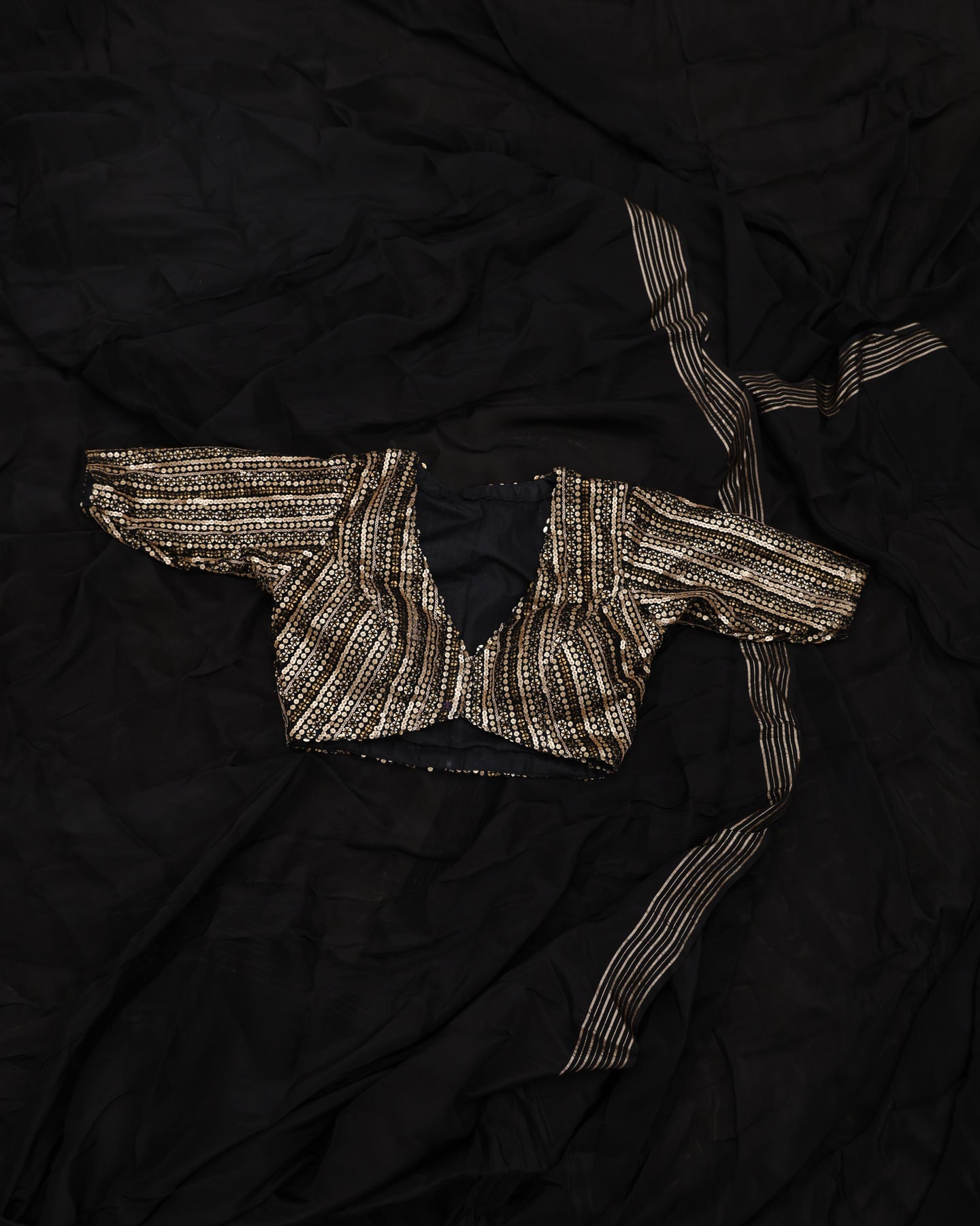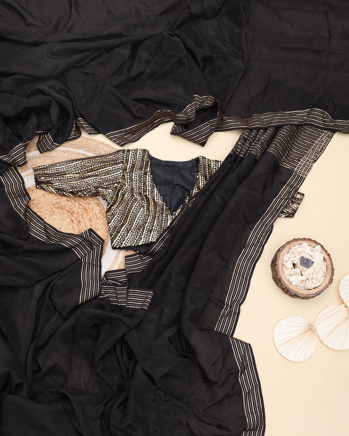 Warning: Prepare for endless stares and compliments in this dreamy dark black saree! Soft chinon silk that feels like a whisper and drapes like a dream, complete with a gorgeous border and a Banarasi silk blouse for that extra touch of elegance.