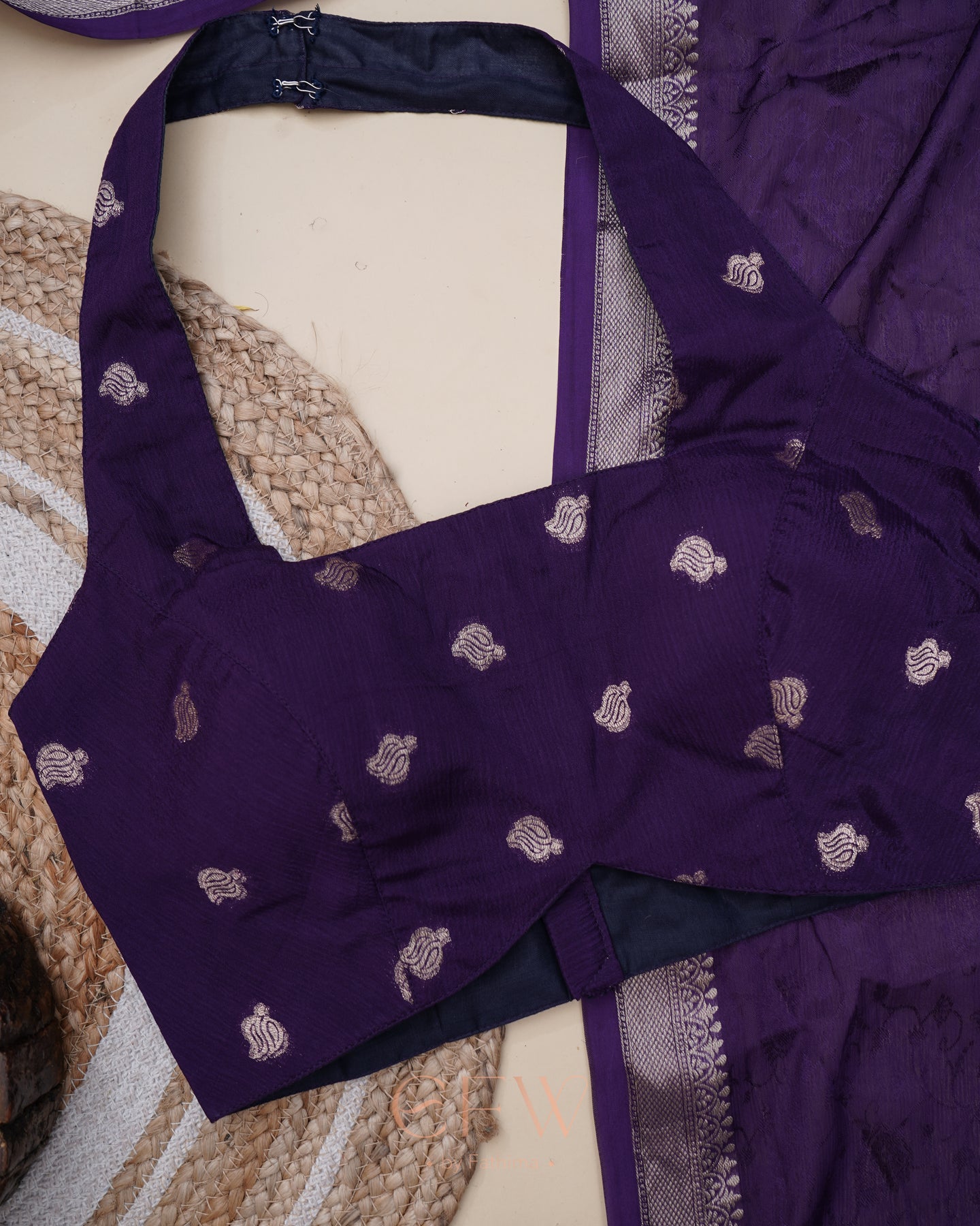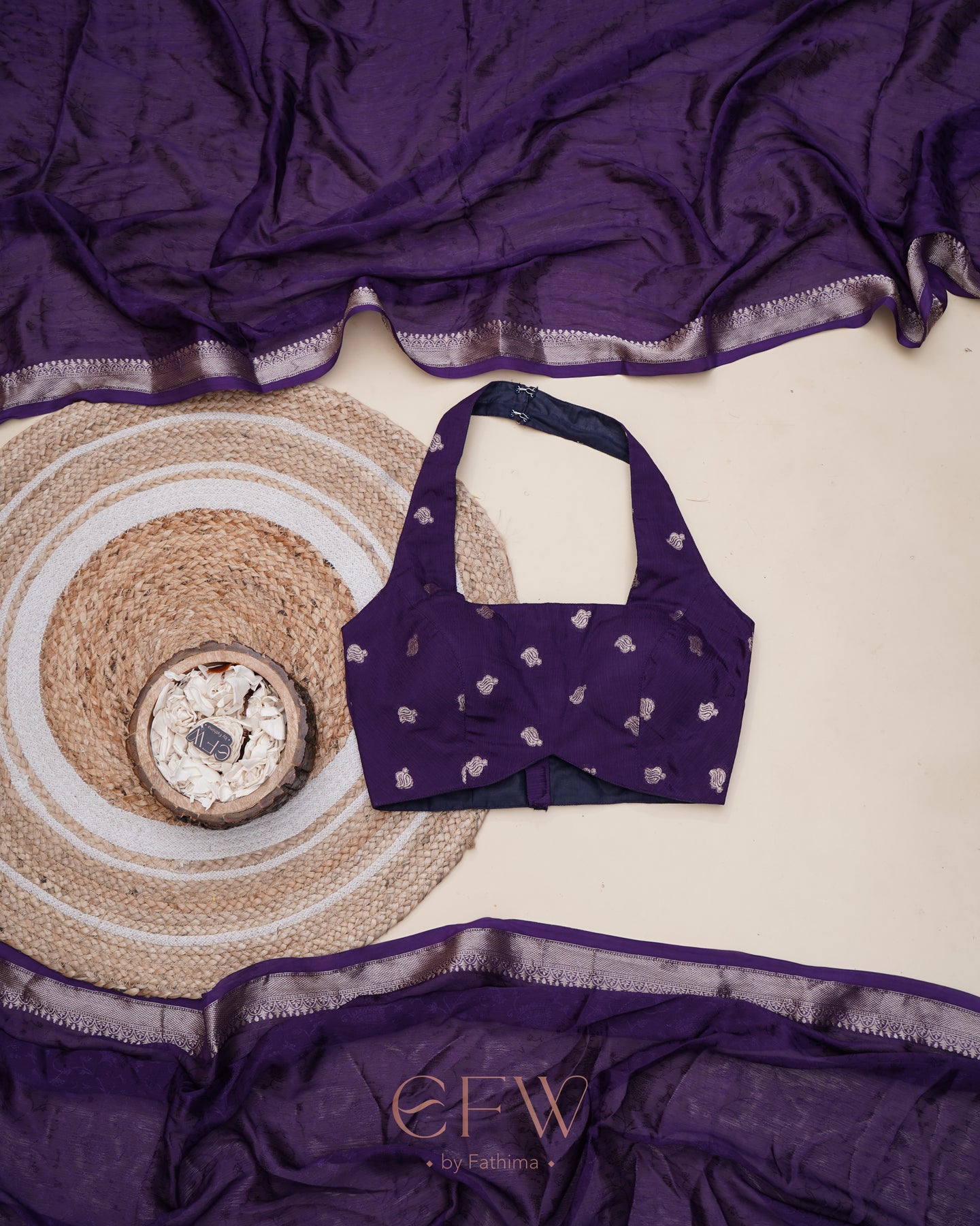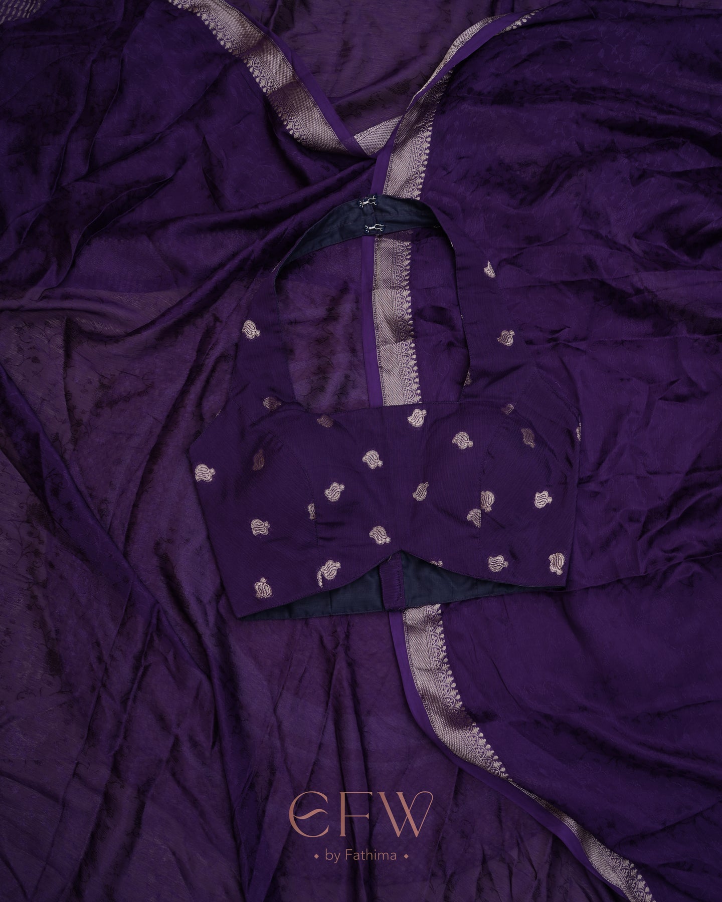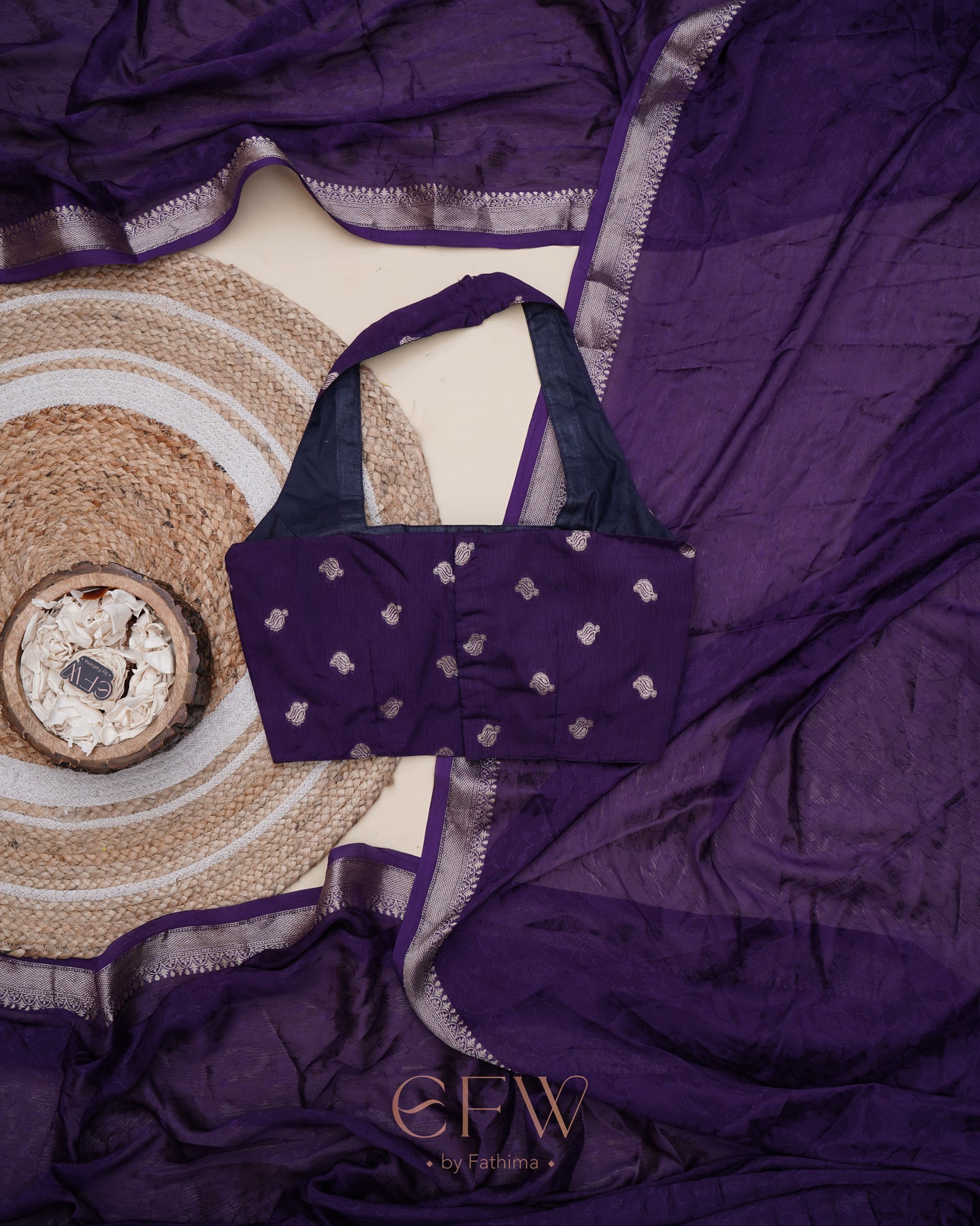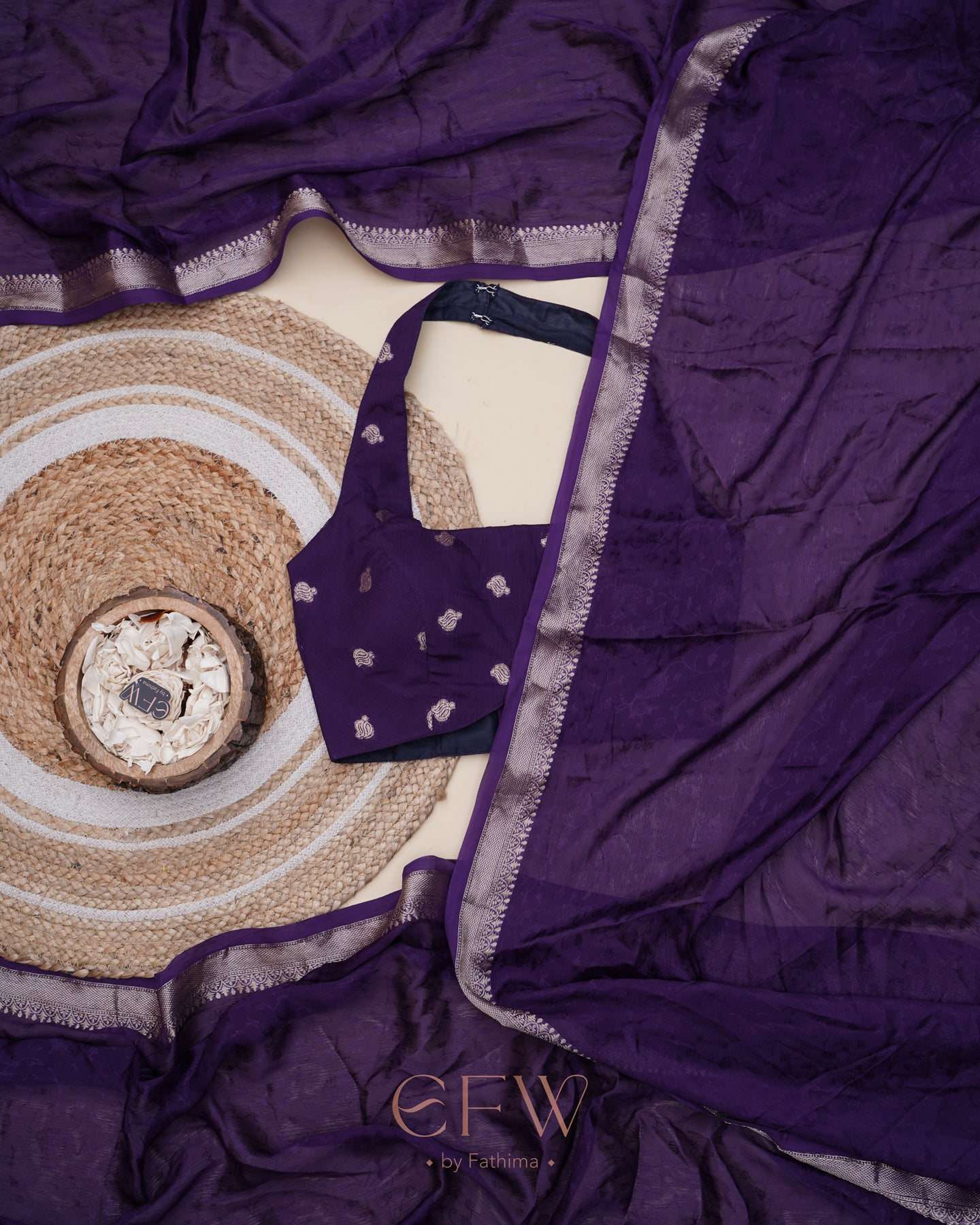Warning: Prepare for endless stares and compliments in this dreamy dark purple saree! Soft chinon silk that feels like a whisper and drapes like a dream, complete with a gorgeous border and a Banarasi silk blouse for that extra touch of elegance.