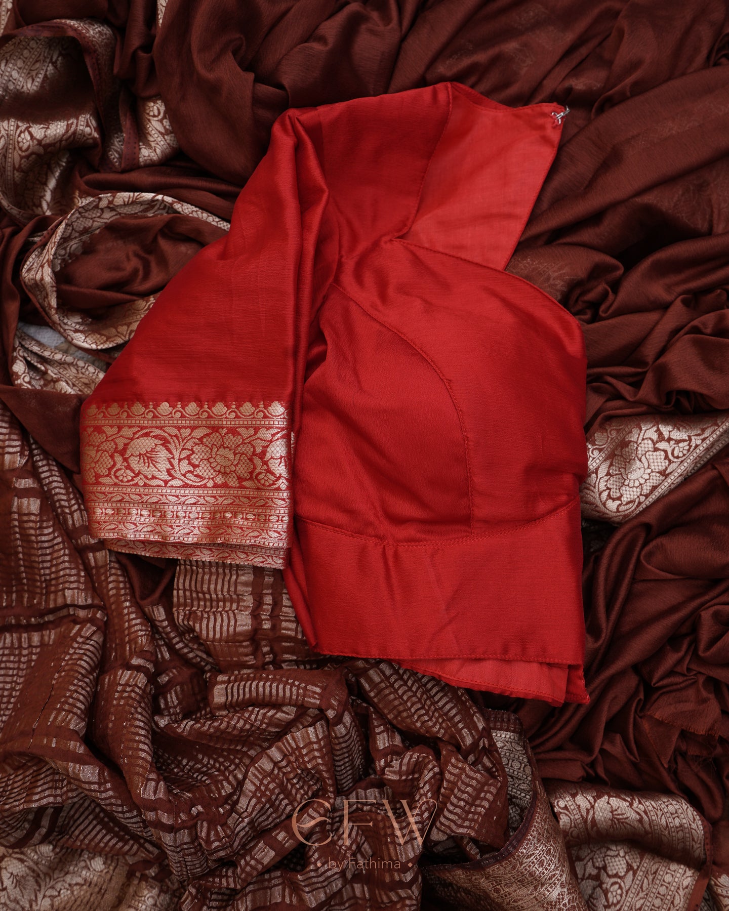 Warning: Prepare for endless stares and compliments in this dreamy brown saree! Soft chinon silk that feels like a whisper and drapes like a dream, complete with a gorgeous border and a Banarasi silk blouse for that extra touch of elegance.