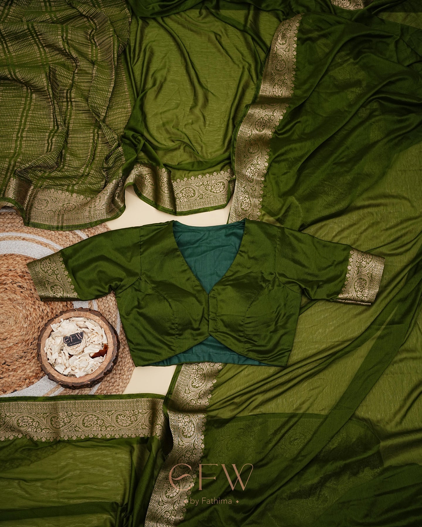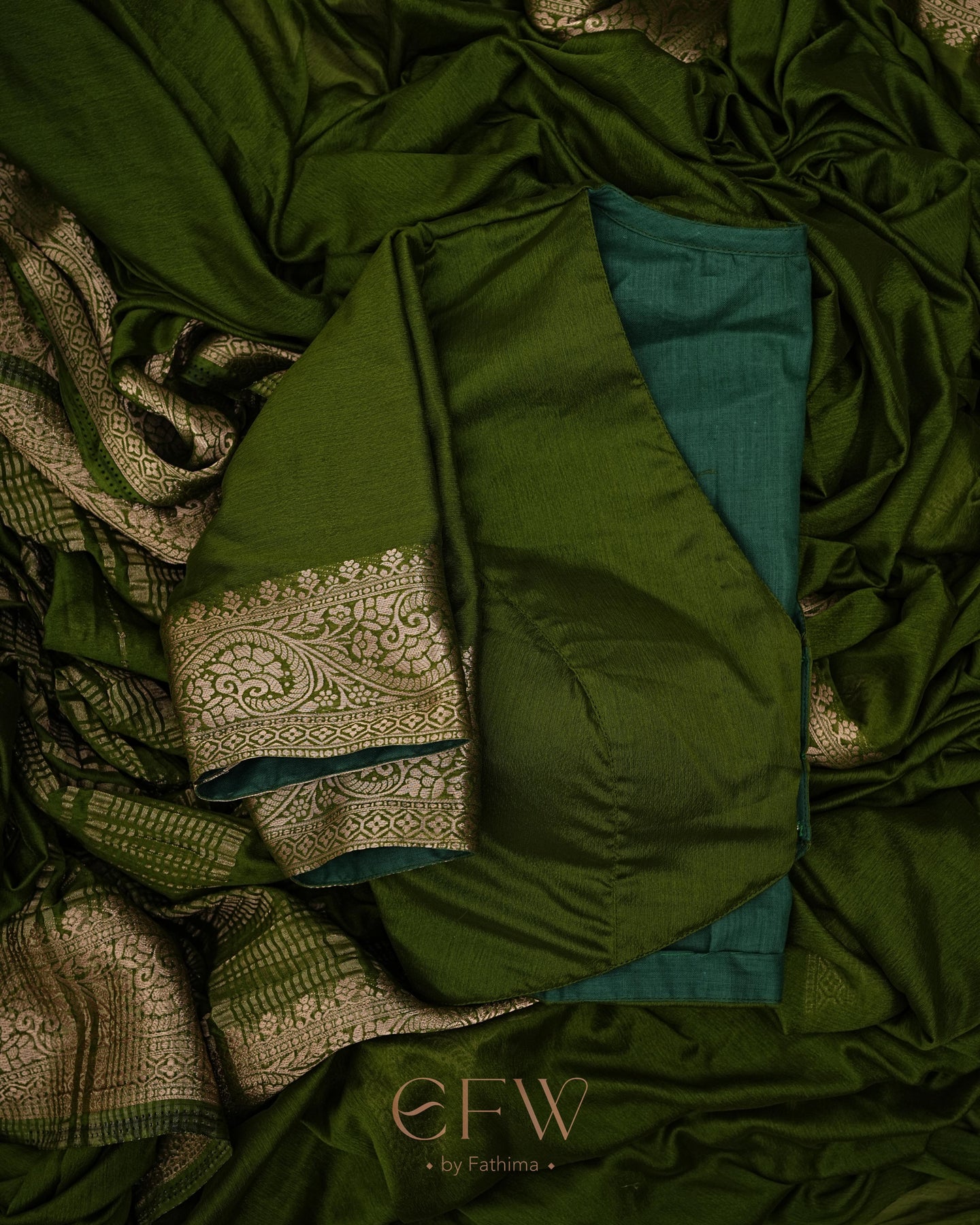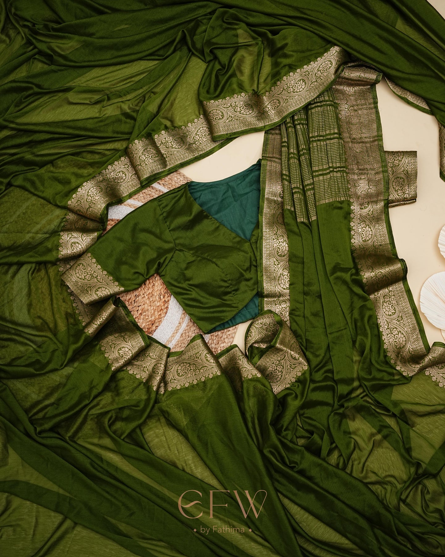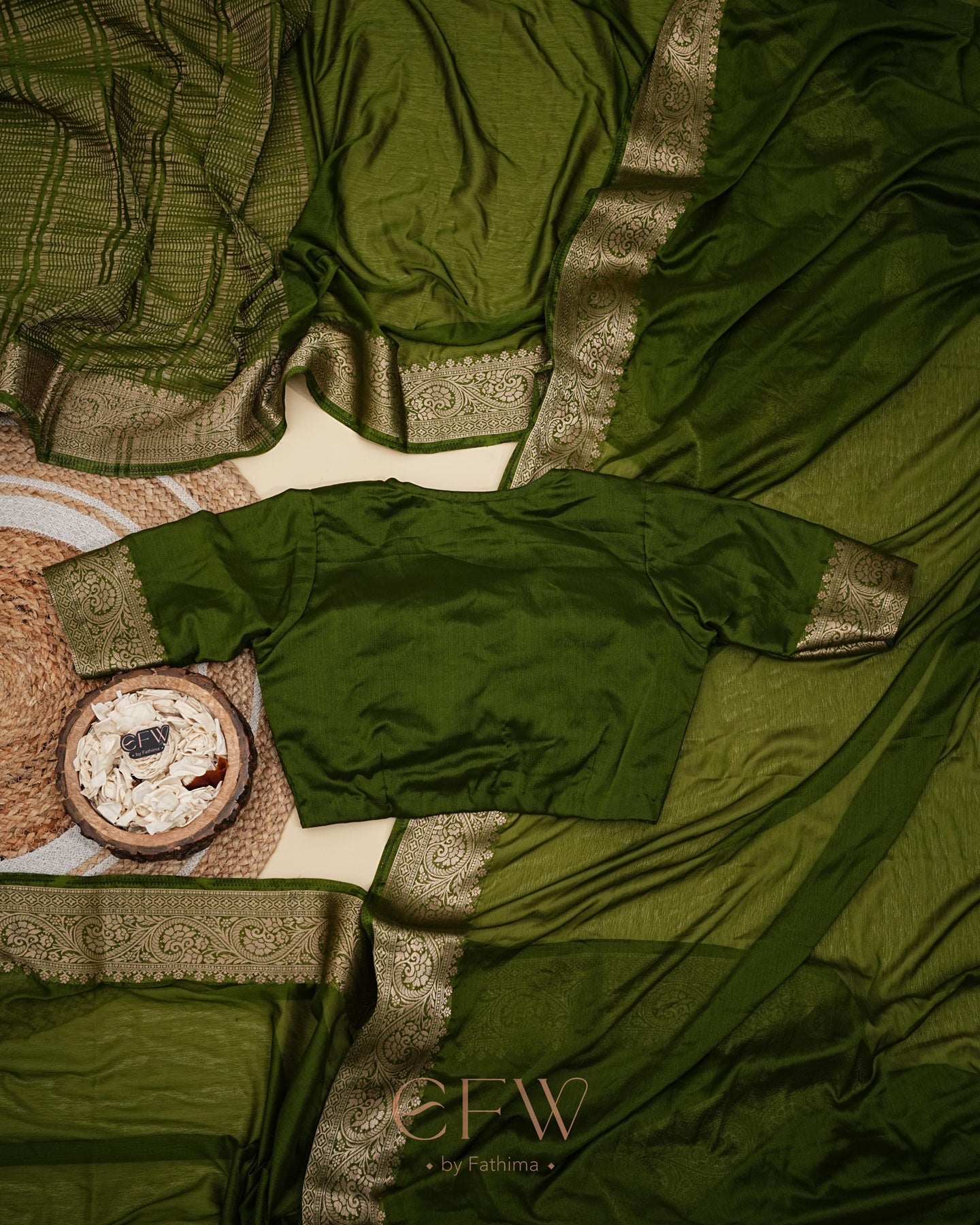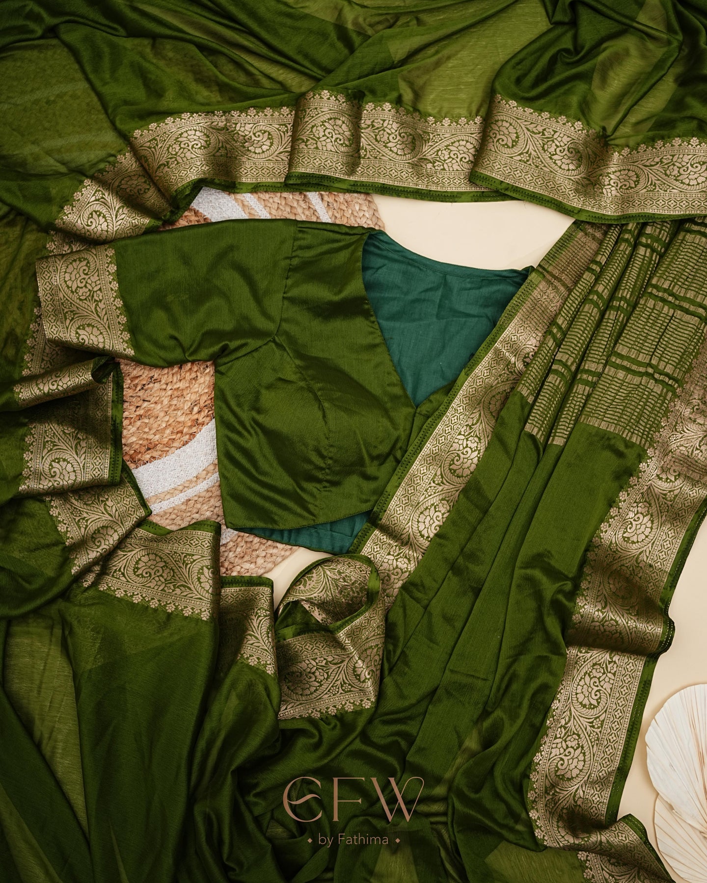 Warning: Prepare for endless stares and compliments in this dreamy brown saree! Soft chinon silk that feels like a whisper and drapes like a dream, complete with a gorgeous border and a Banarasi silk blouse for that extra touch of elegance.