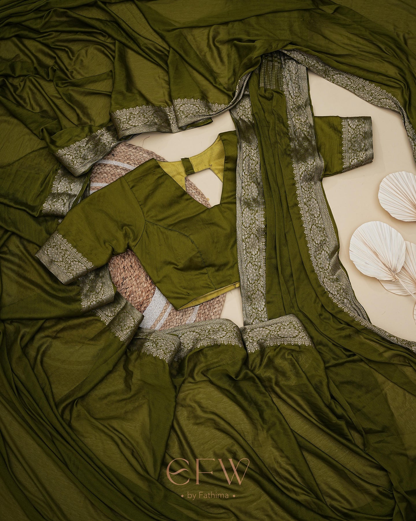 Warning: Prepare for endless stares and compliments in this dreamy brown saree! Soft chinon silk that feels like a whisper and drapes like a dream, complete with a gorgeous border and a Banarasi silk blouse for that extra touch of elegance.