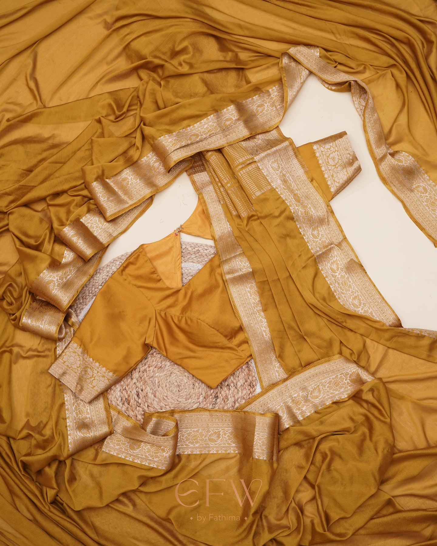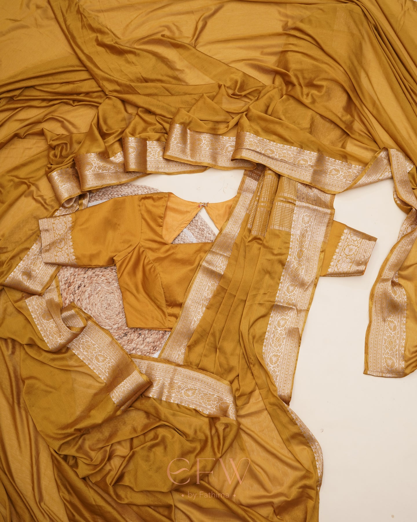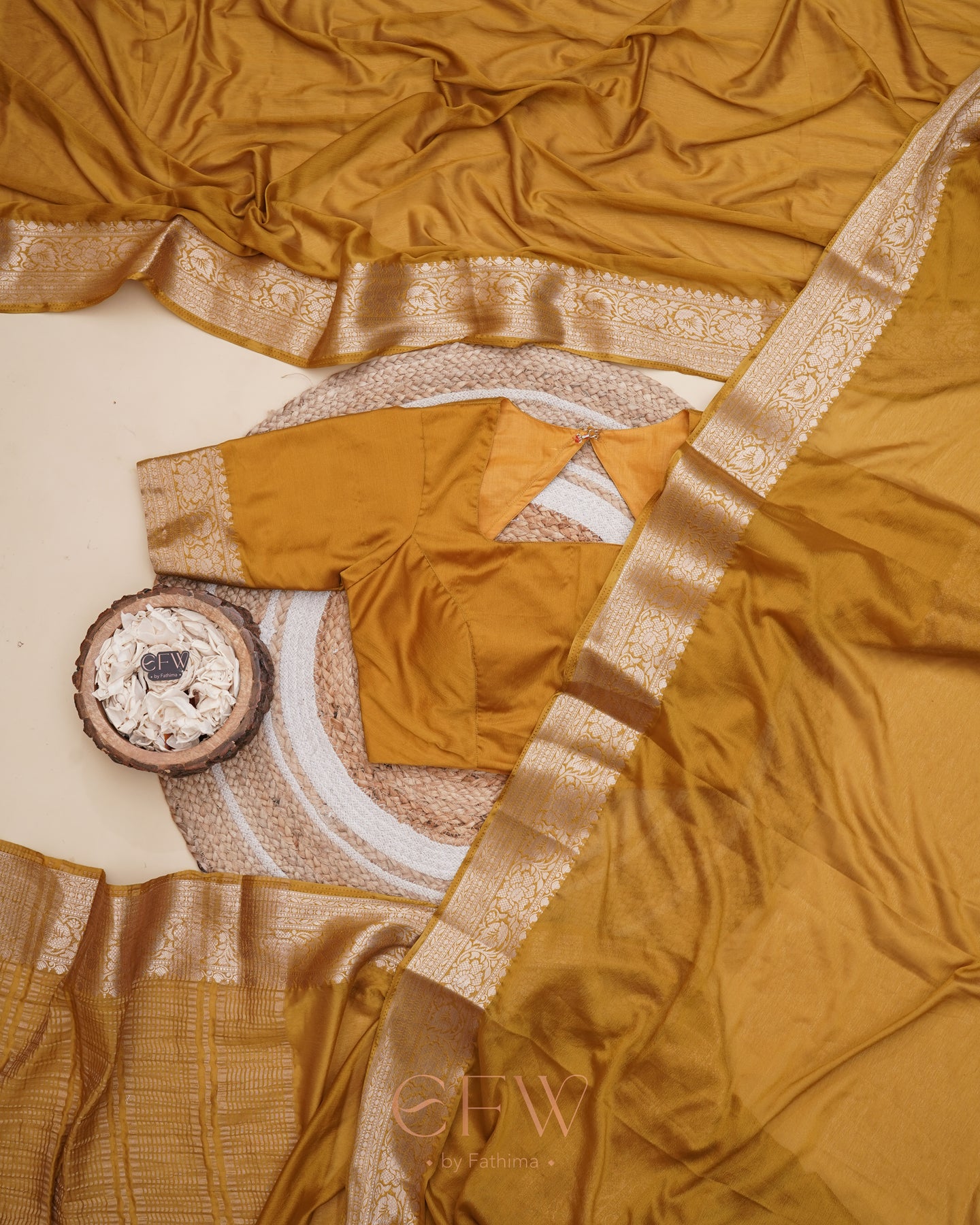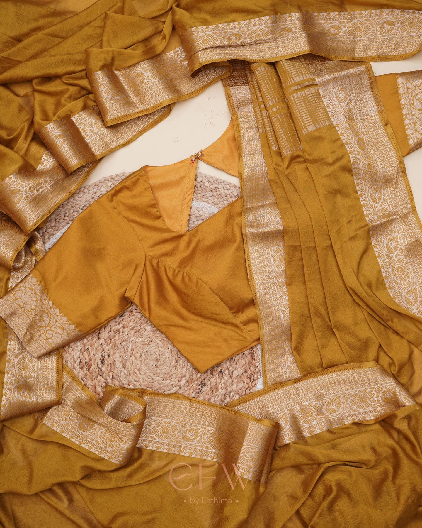 Warning: Prepare for endless stares and compliments in this dreamy brown saree! Soft chinon silk that feels like a whisper and drapes like a dream, complete with a gorgeous border and a Banarasi silk blouse for that extra touch of elegance.