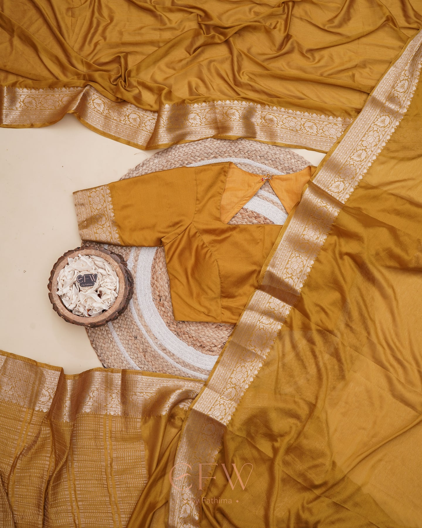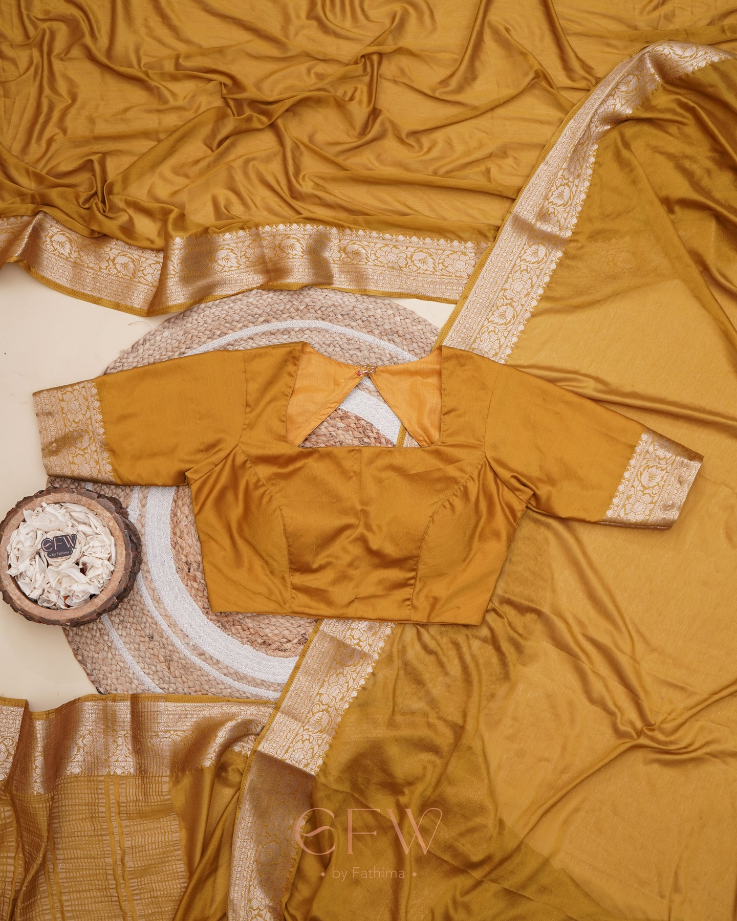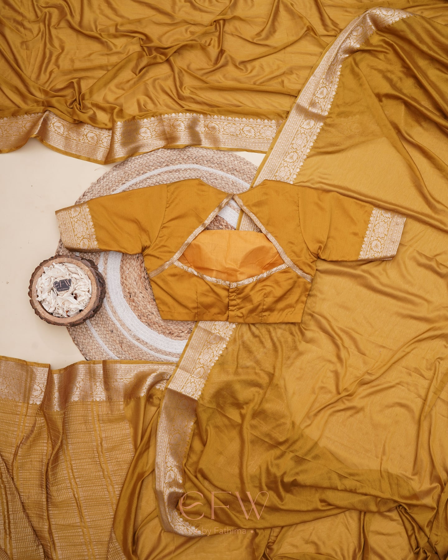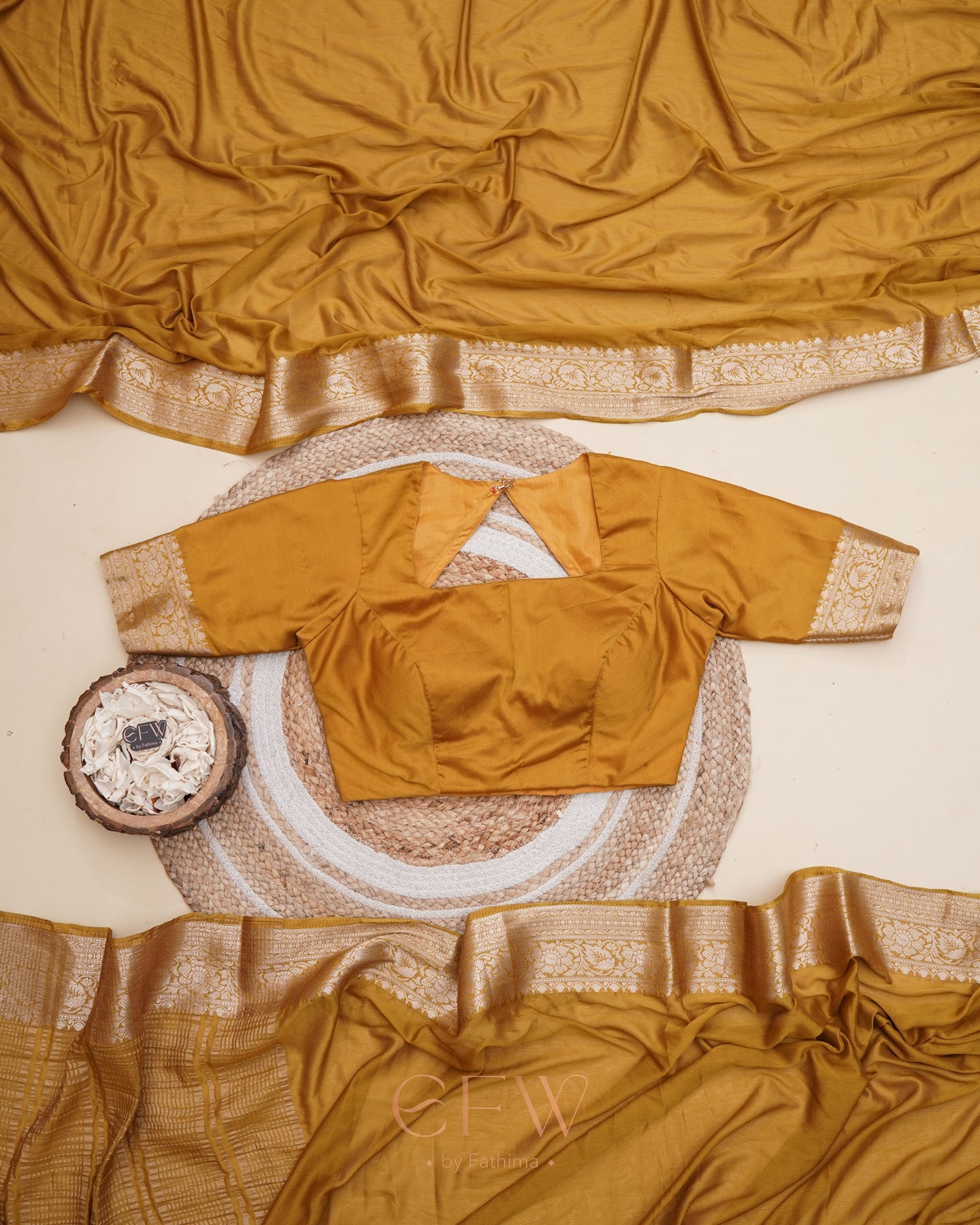 Warning: Prepare for endless stares and compliments in this dreamy brown saree! Soft chinon silk that feels like a whisper and drapes like a dream, complete with a gorgeous border and a Banarasi silk blouse for that extra touch of elegance.