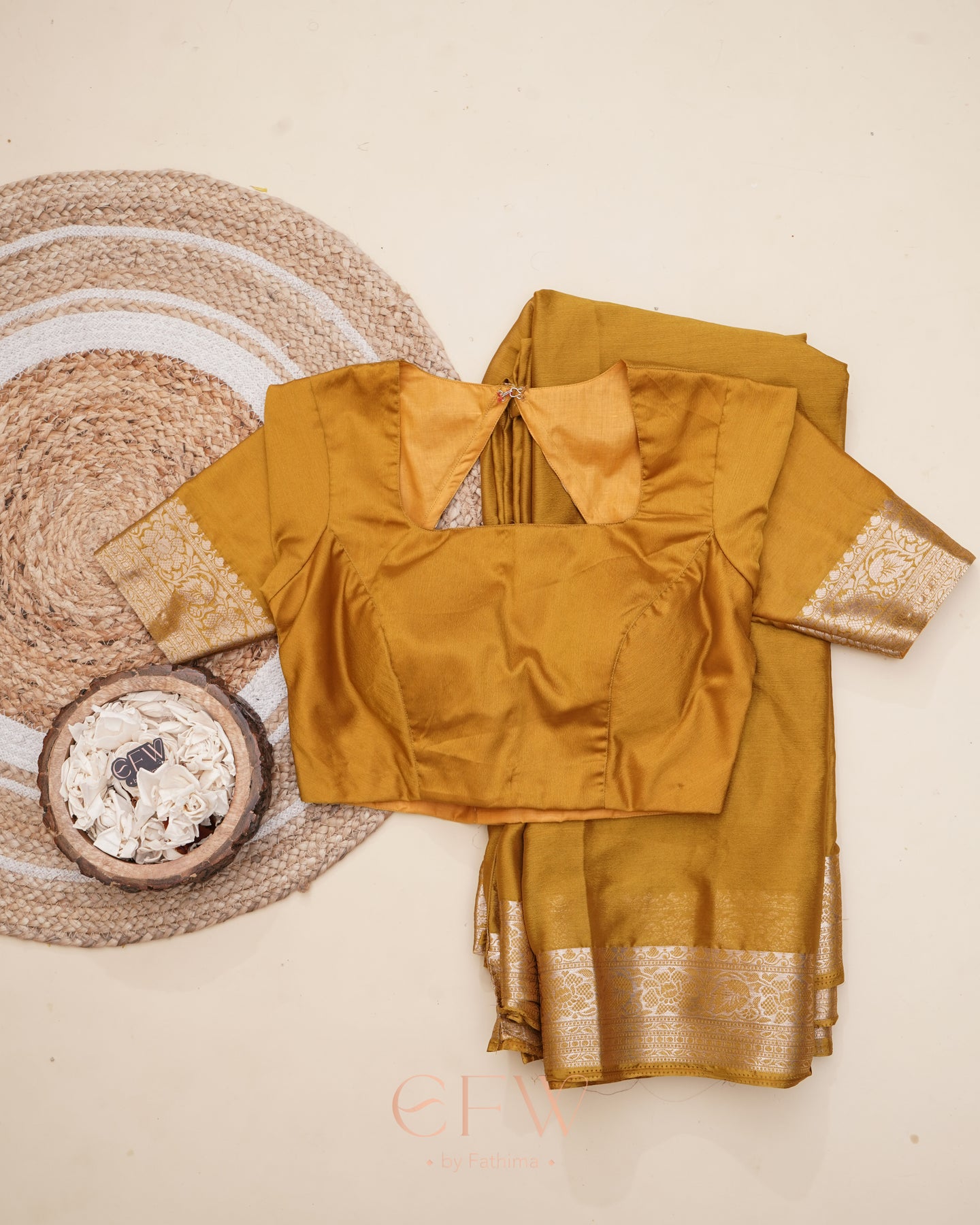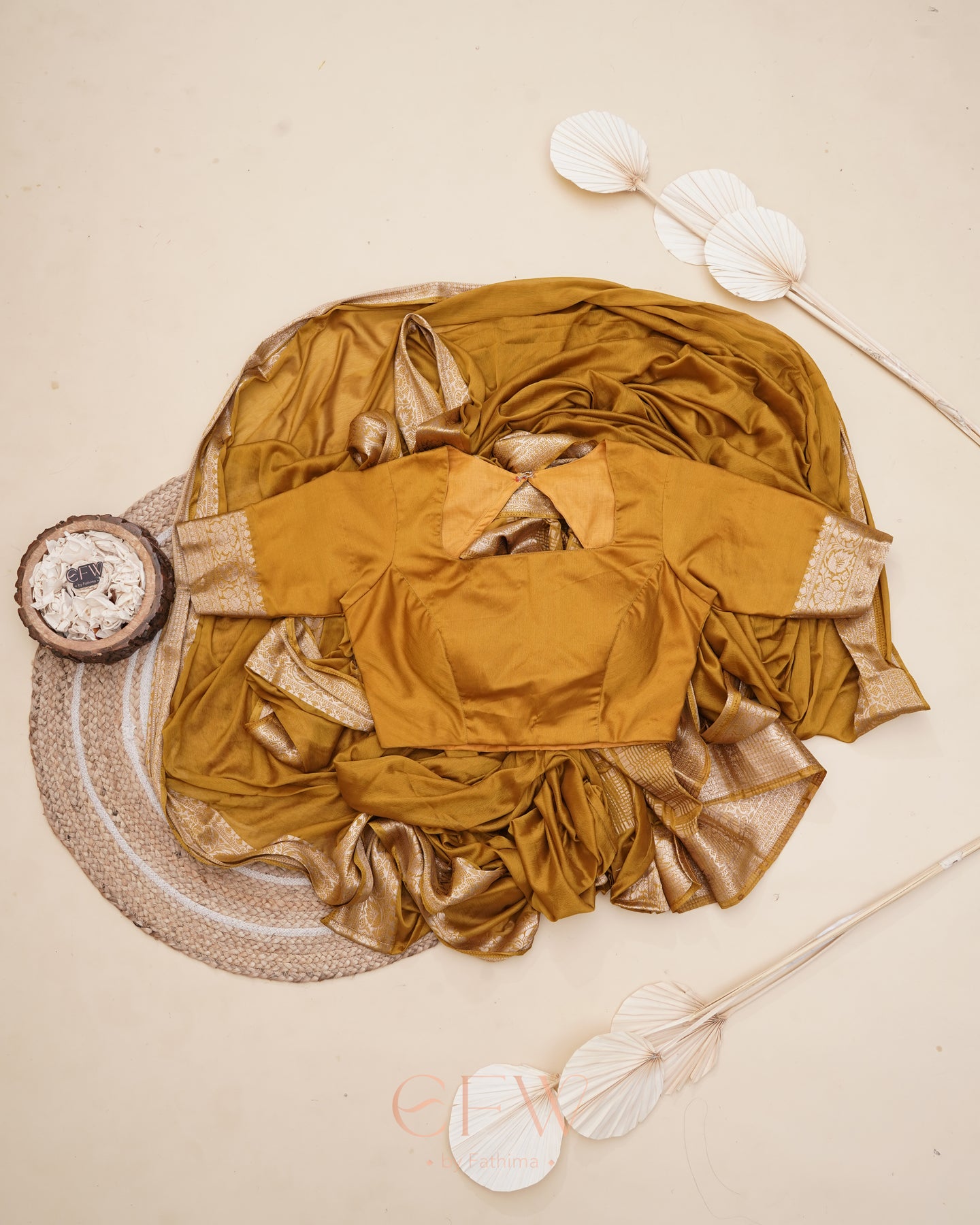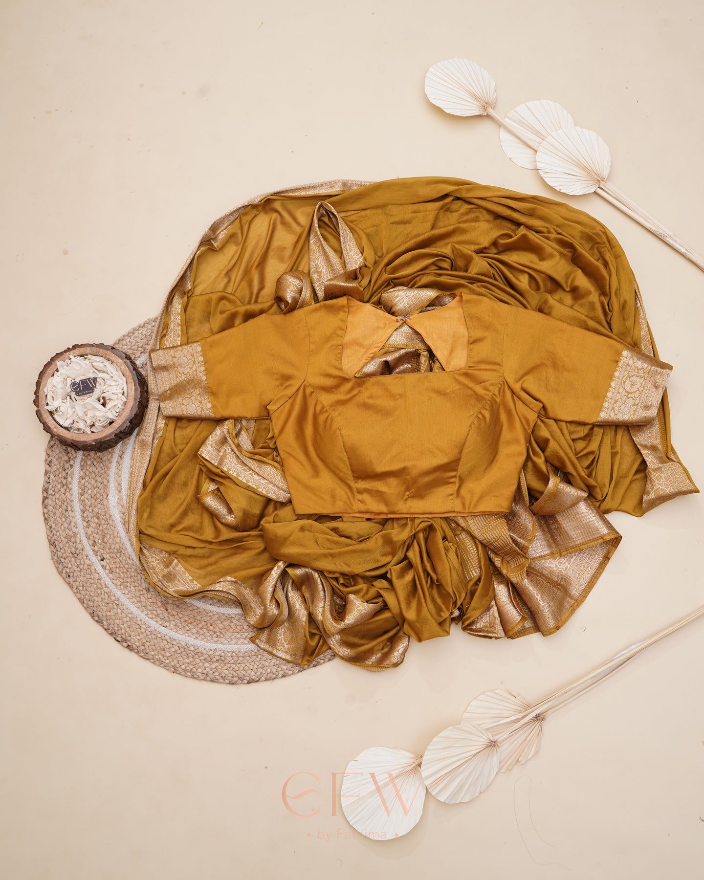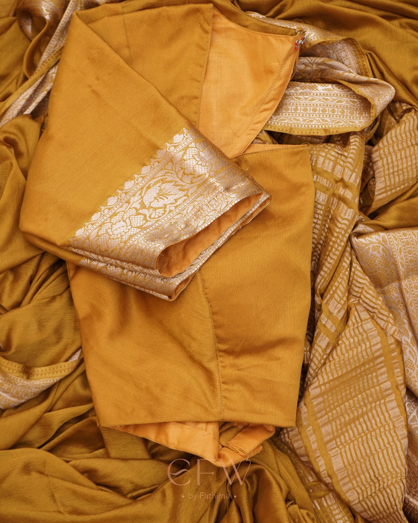 Warning: Prepare for endless stares and compliments in this dreamy brown saree! Soft chinon silk that feels like a whisper and drapes like a dream, complete with a gorgeous border and a Banarasi silk blouse for that extra touch of elegance.
