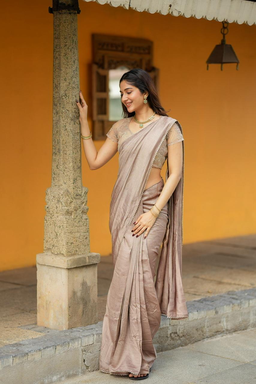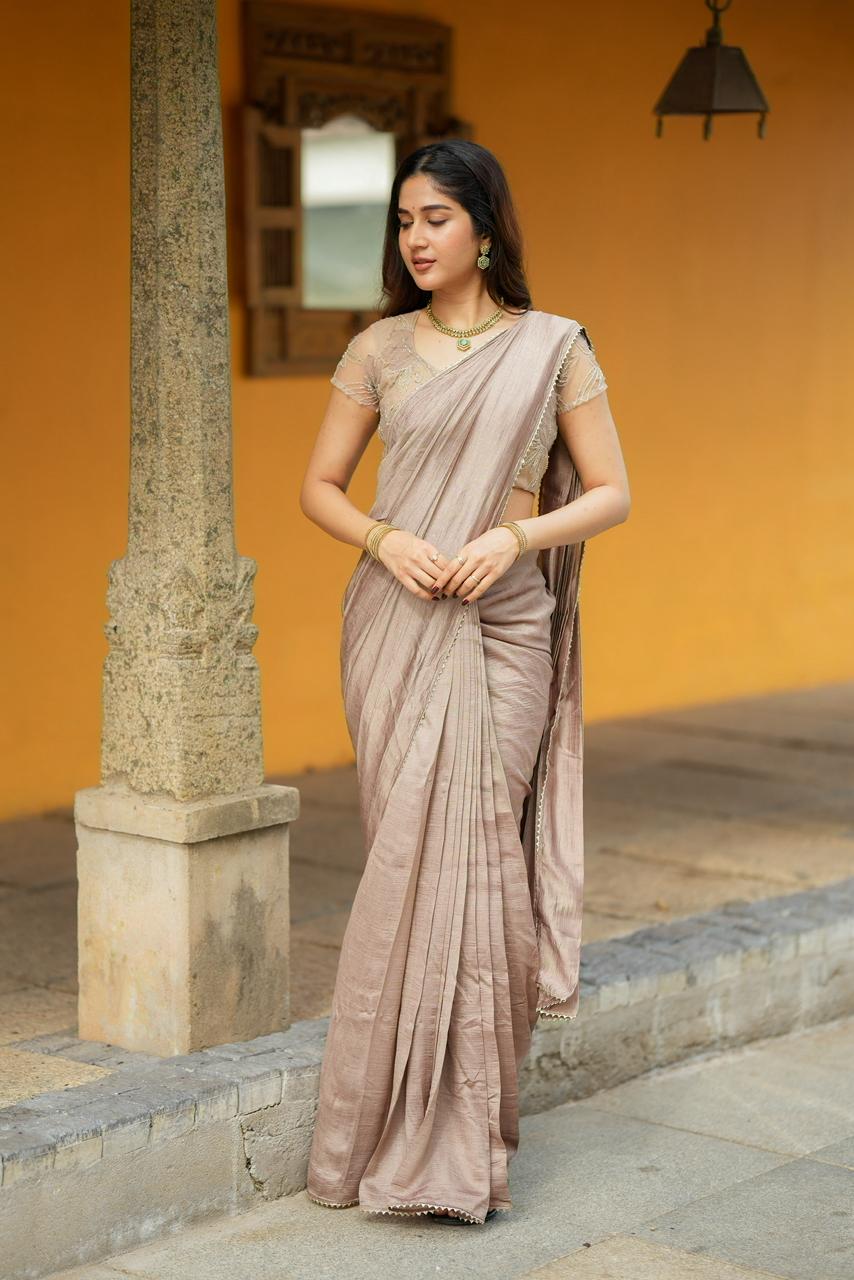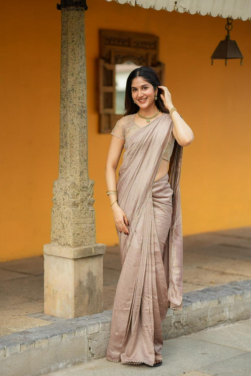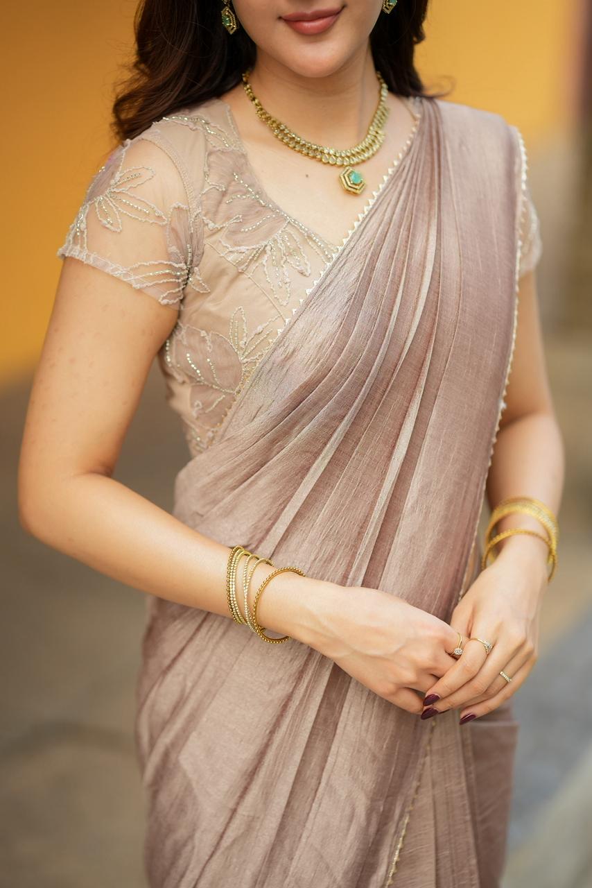 Rich, elegant, and effortlessly refined, Cocoa Mocha Luxe is a celebration of warm earthy tones and delicate craftsmanship. The saree features a luxurious mocha-brown drape with a soft textured sheen that flows gracefully, creating a sophisticated and timeless silhouette.