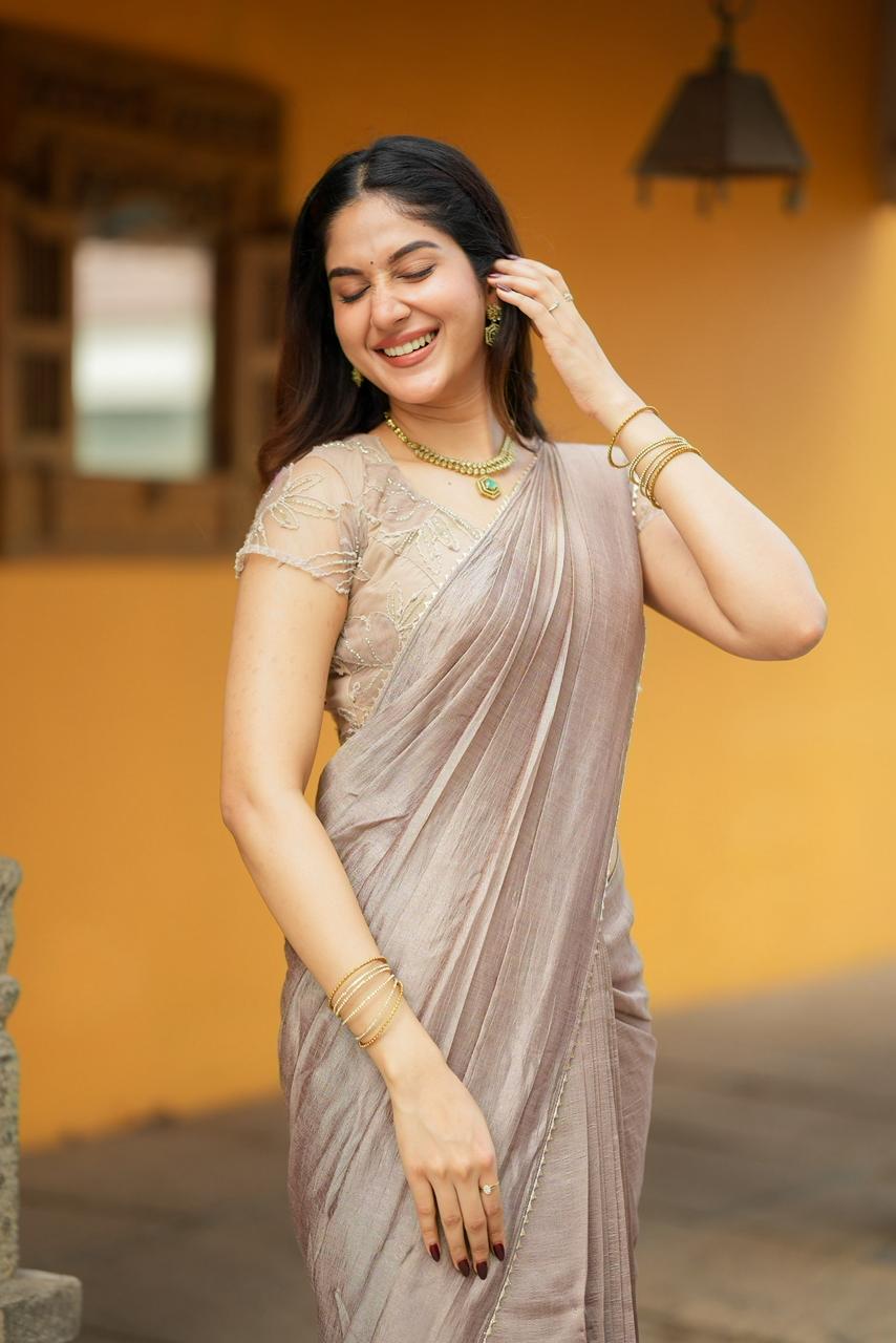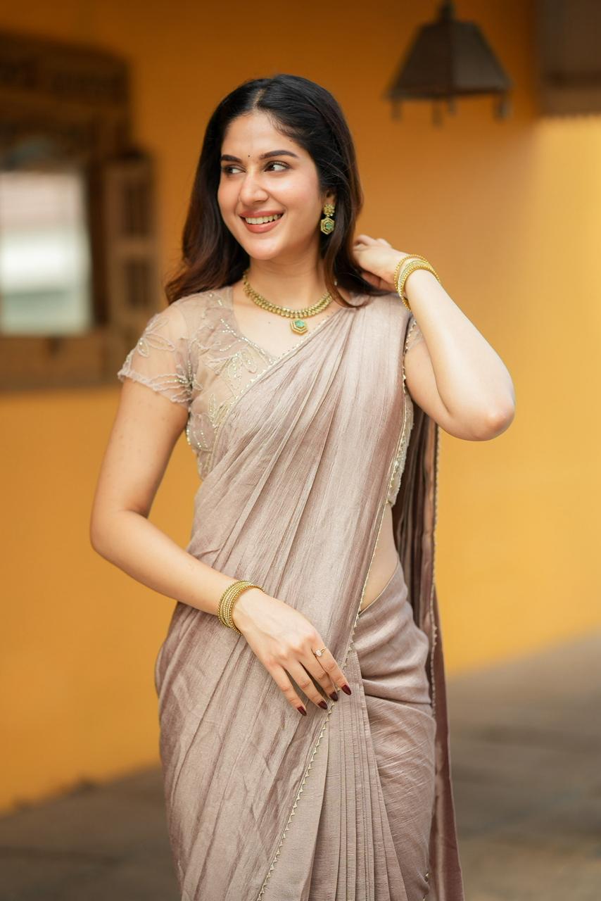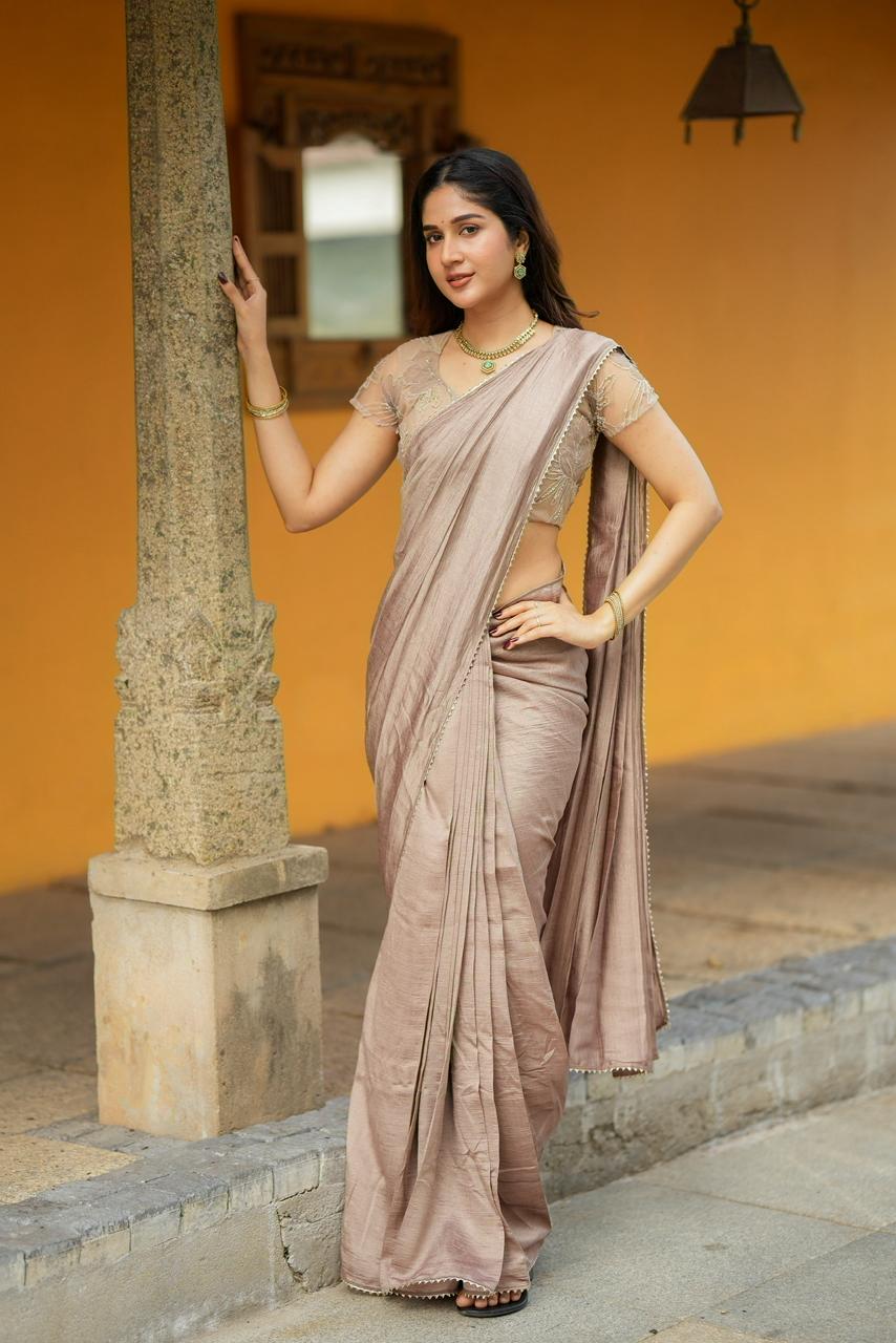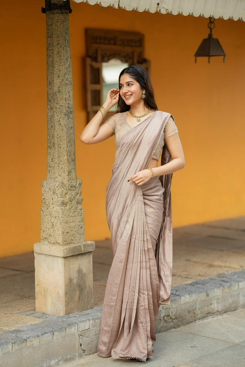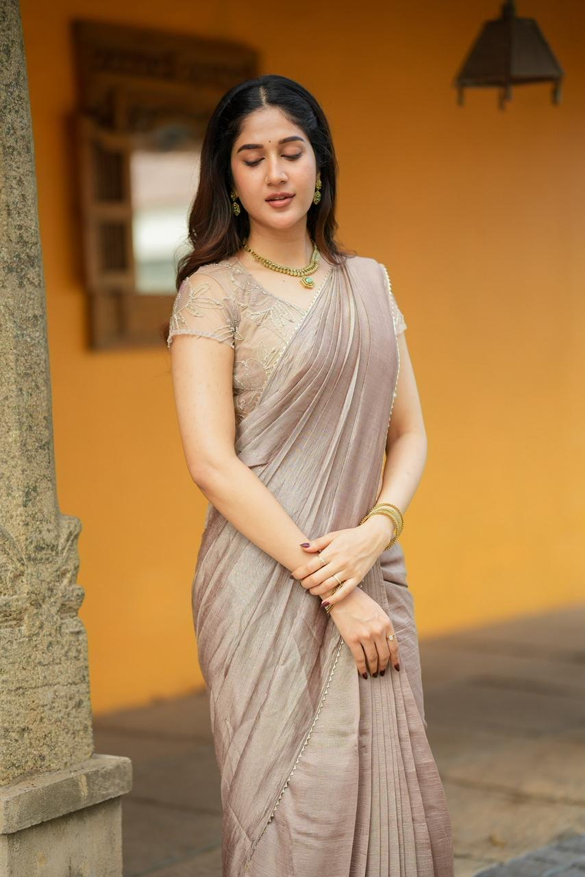 Rich, elegant, and effortlessly refined, Cocoa Mocha Luxe is a celebration of warm earthy tones and delicate craftsmanship. The saree features a luxurious mocha-brown drape with a soft textured sheen that flows gracefully, creating a sophisticated and timeless silhouette.