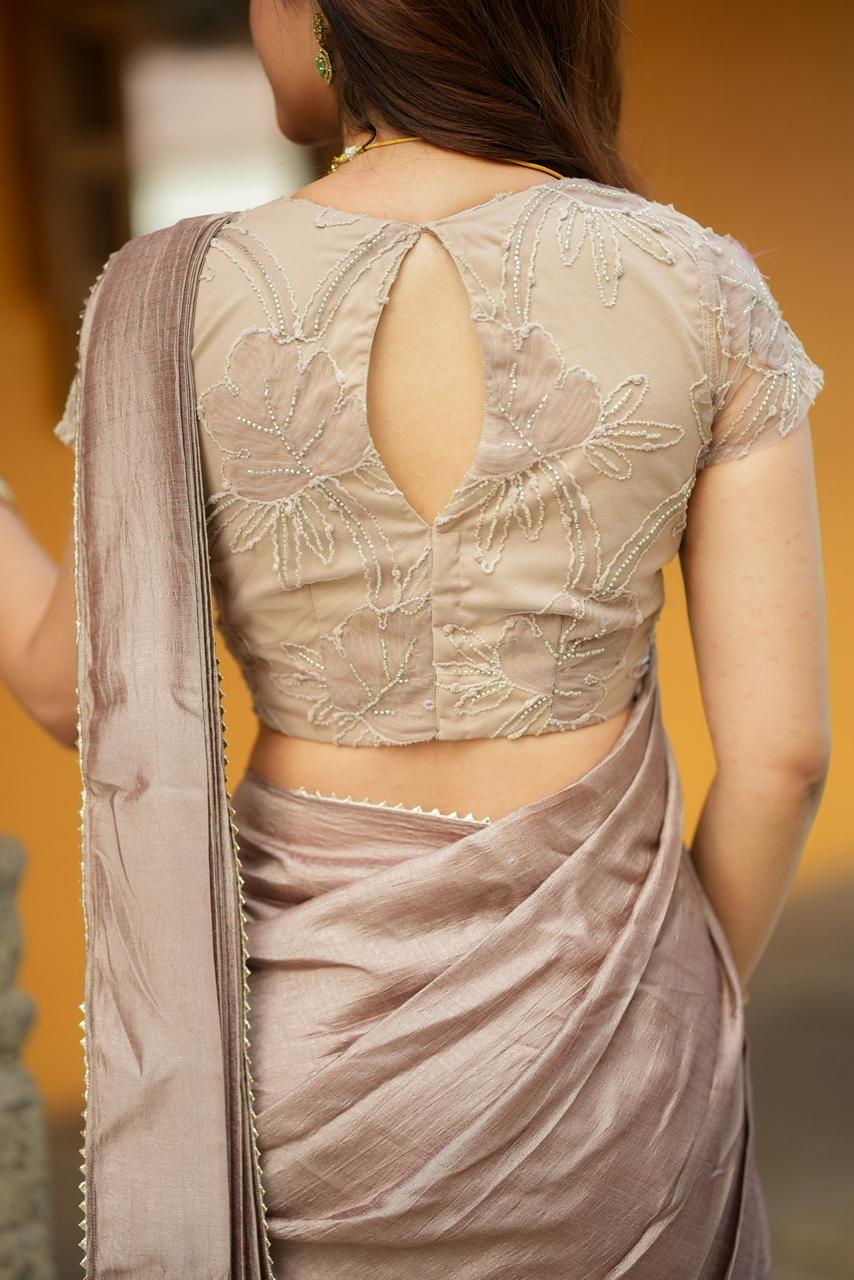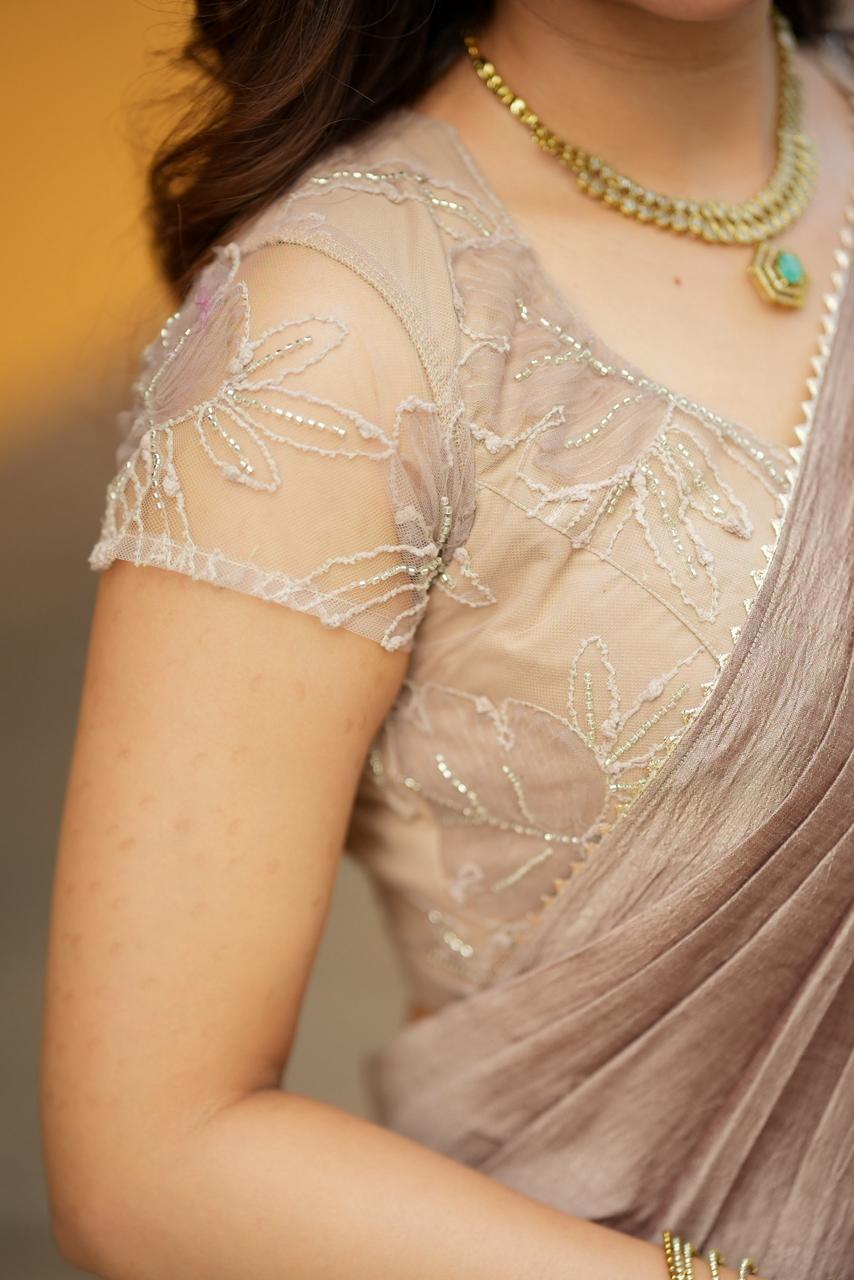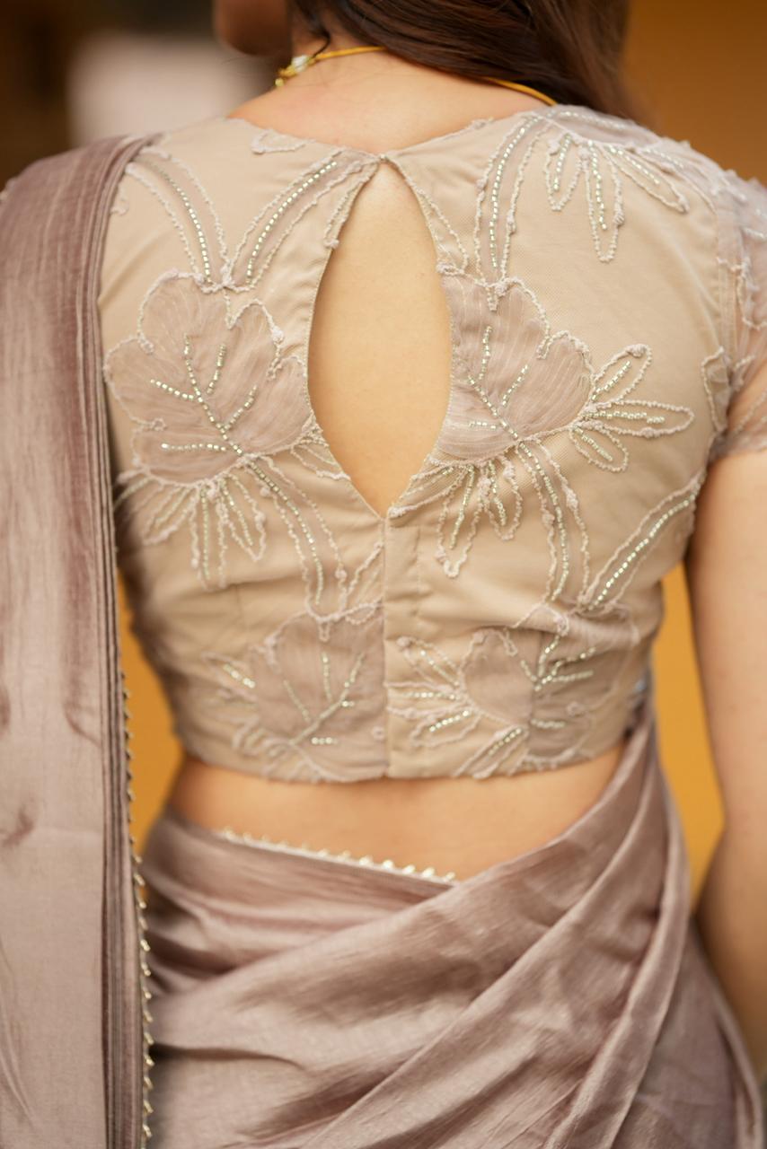 Complementing the saree is a beautifully embroidered blouse in warm cocoa tones, adorned with intricate floral threadwork and subtle bead detailing. The delicate embroidery adds depth and texture, while the soft neutral palette brings an understated yet luxurious charm to the ensemble.