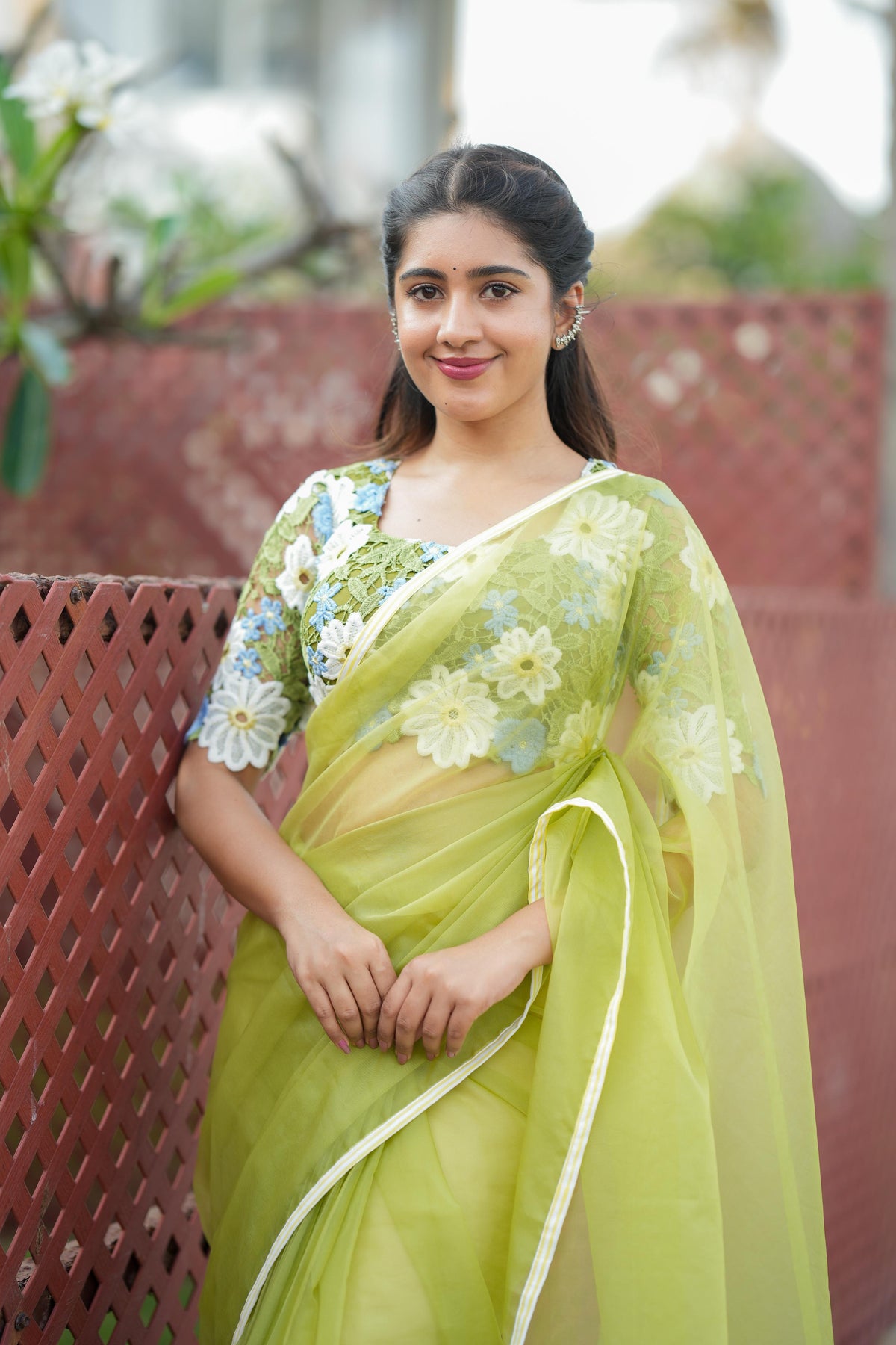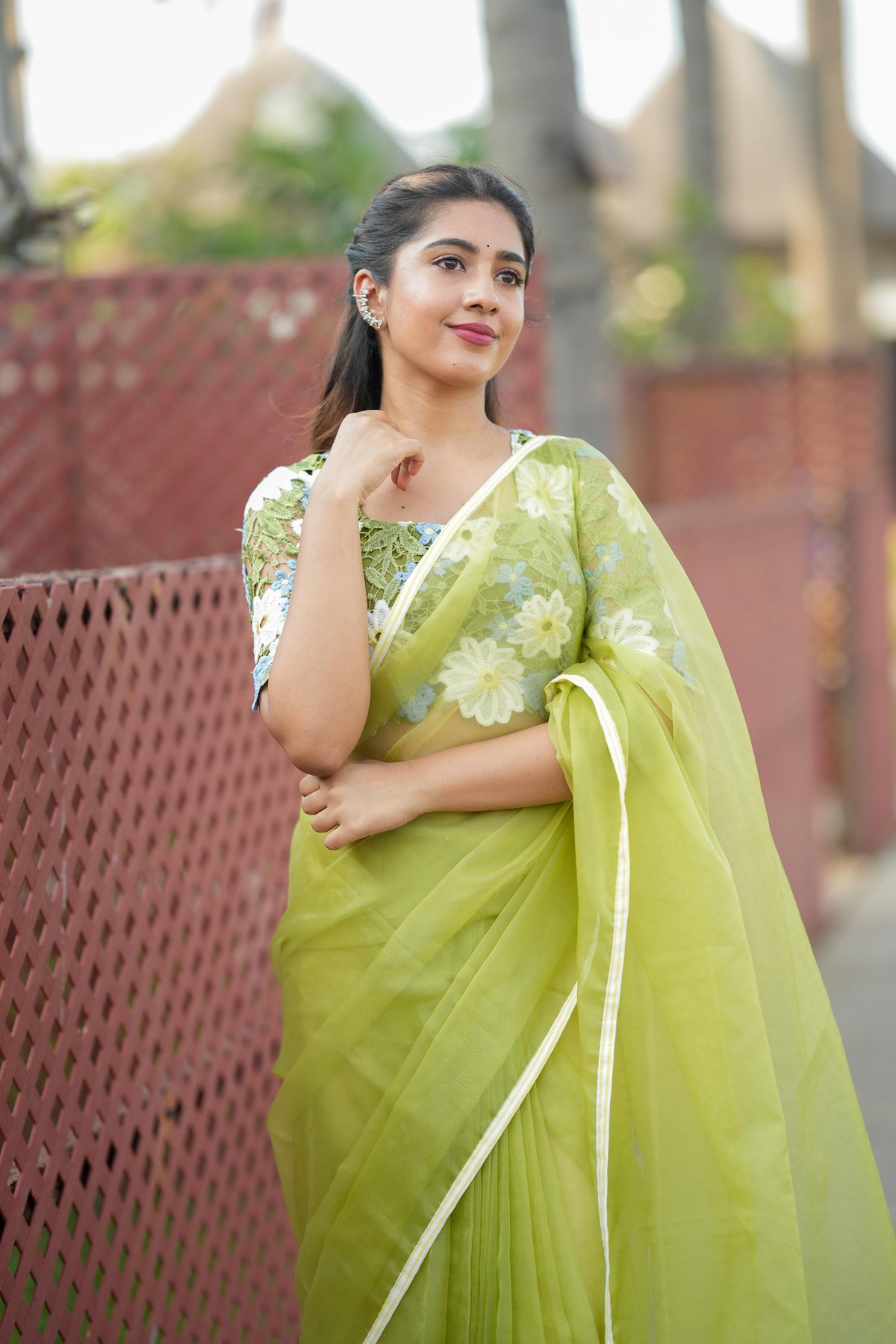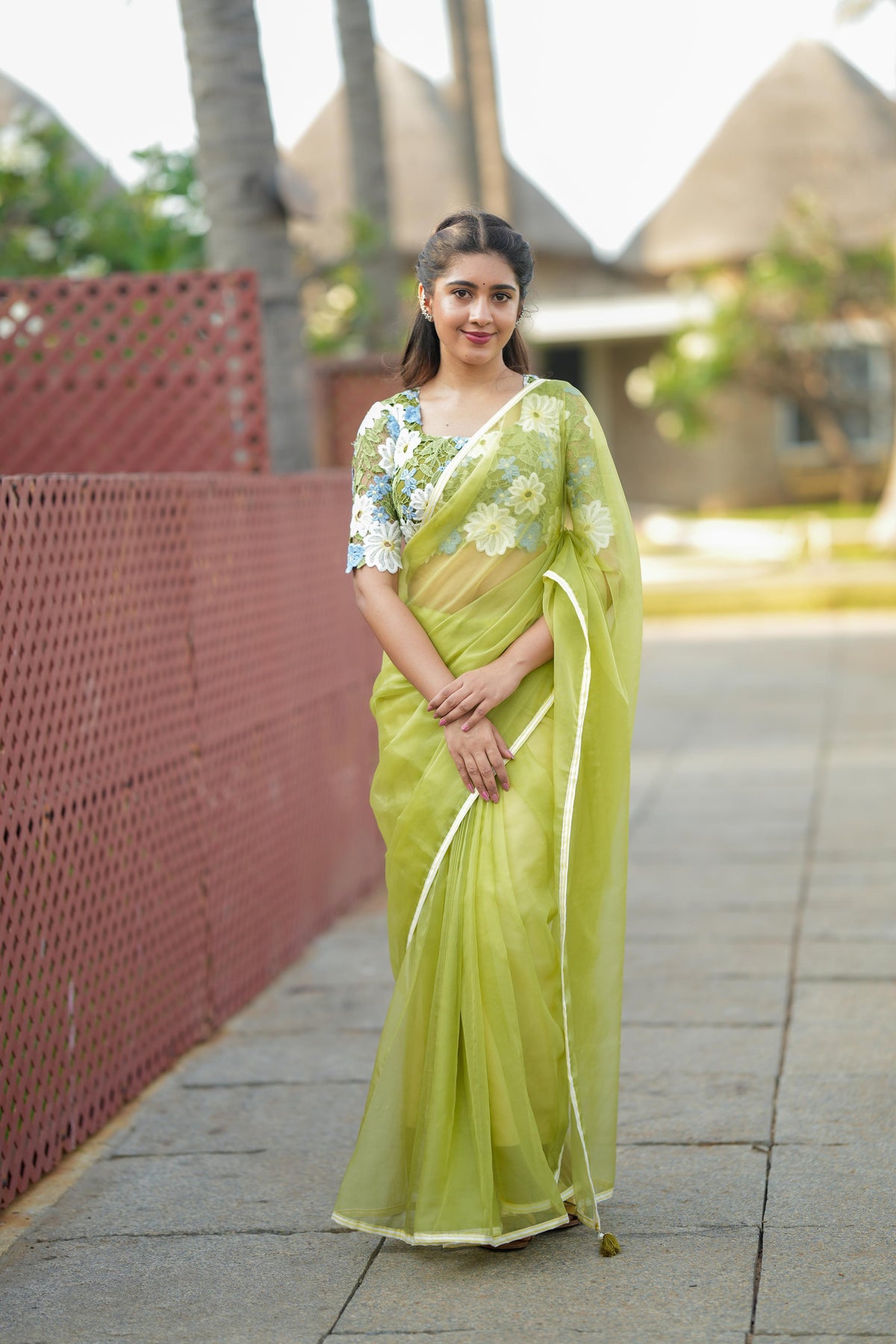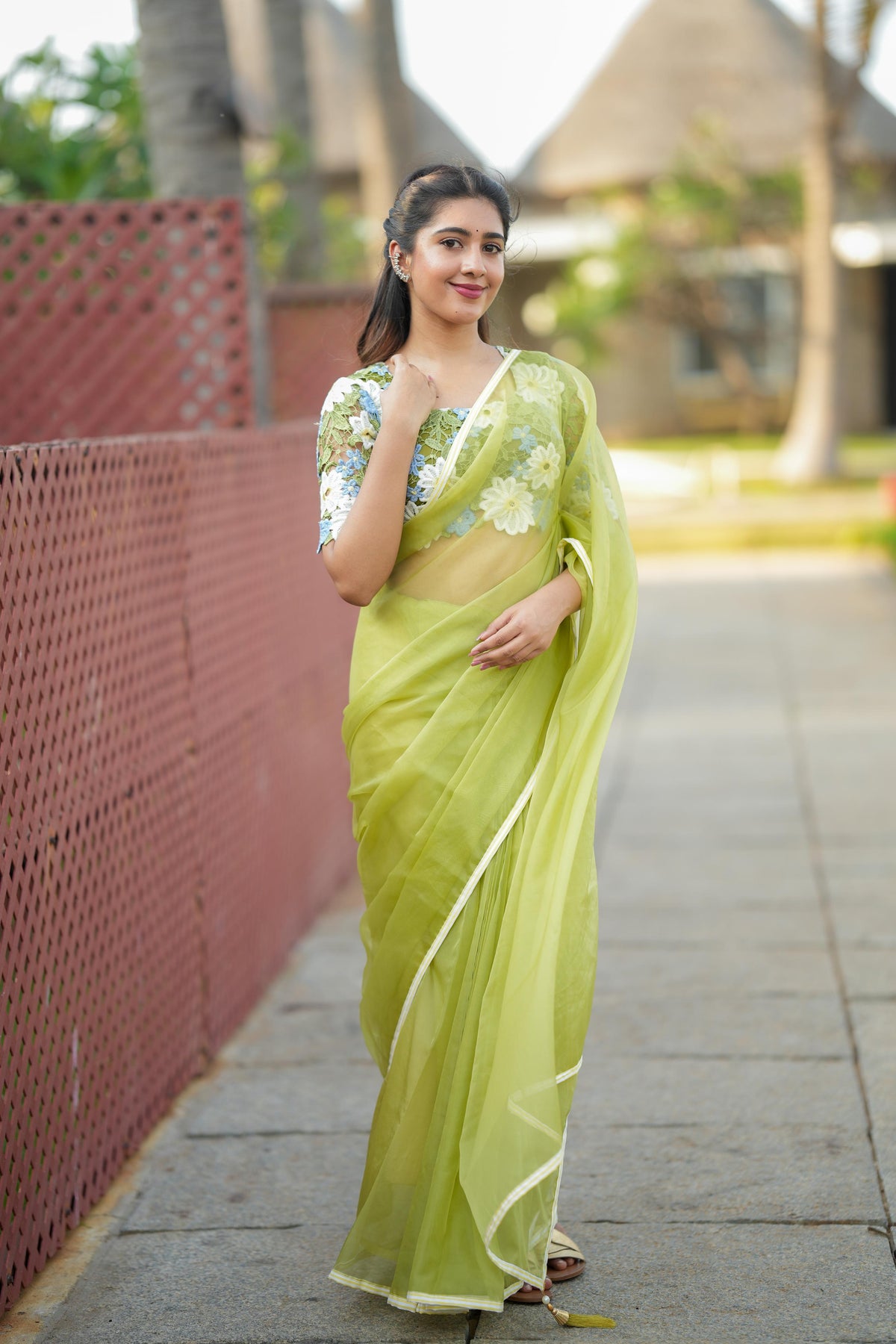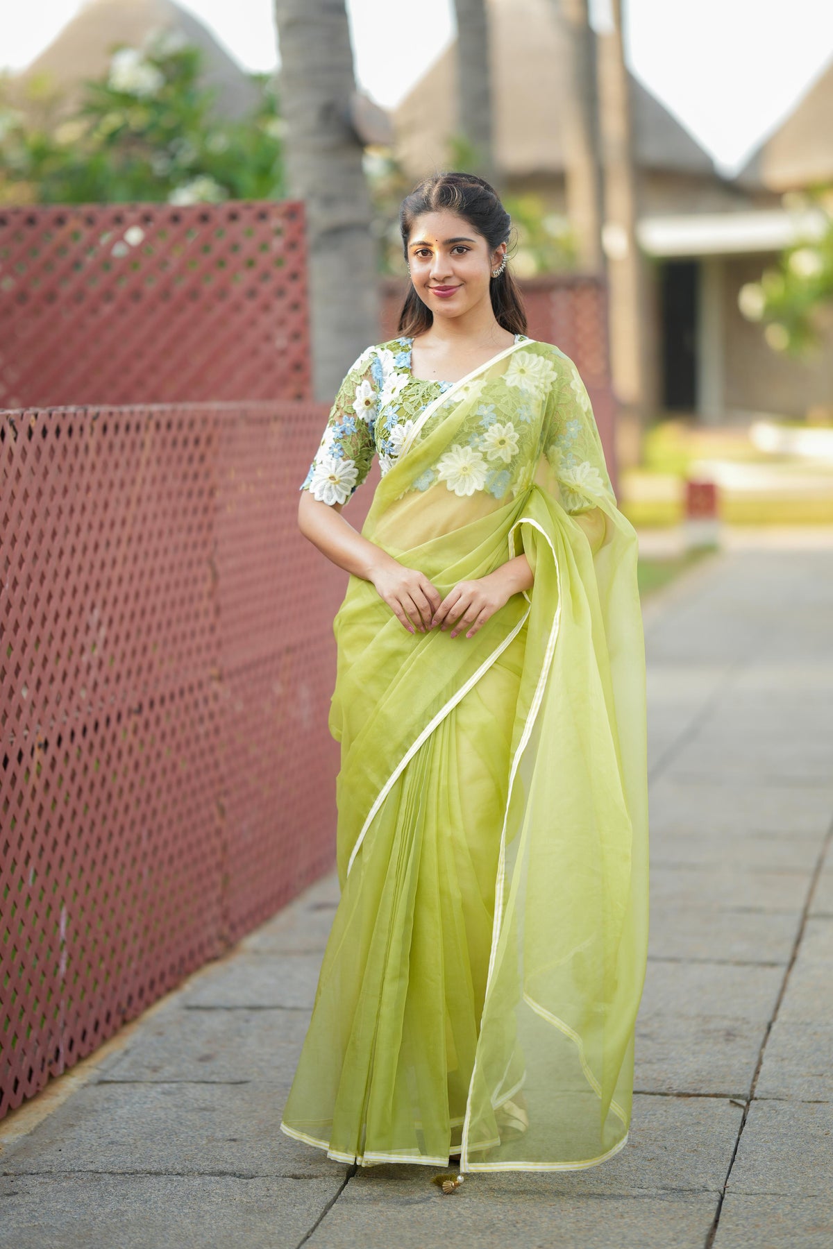Fresh, playful, and full of main character energy, Elowen Daisy Drip brings a dreamy garden aesthetic to life. The saree features a rich olive-green drape with a clean, minimal finish—perfect for that effortless, “clean girl” vibe.