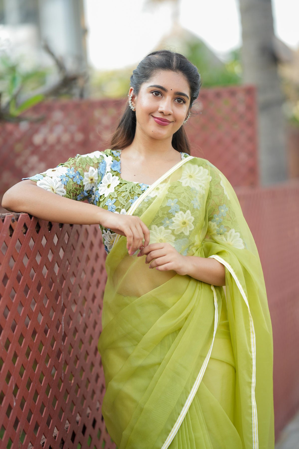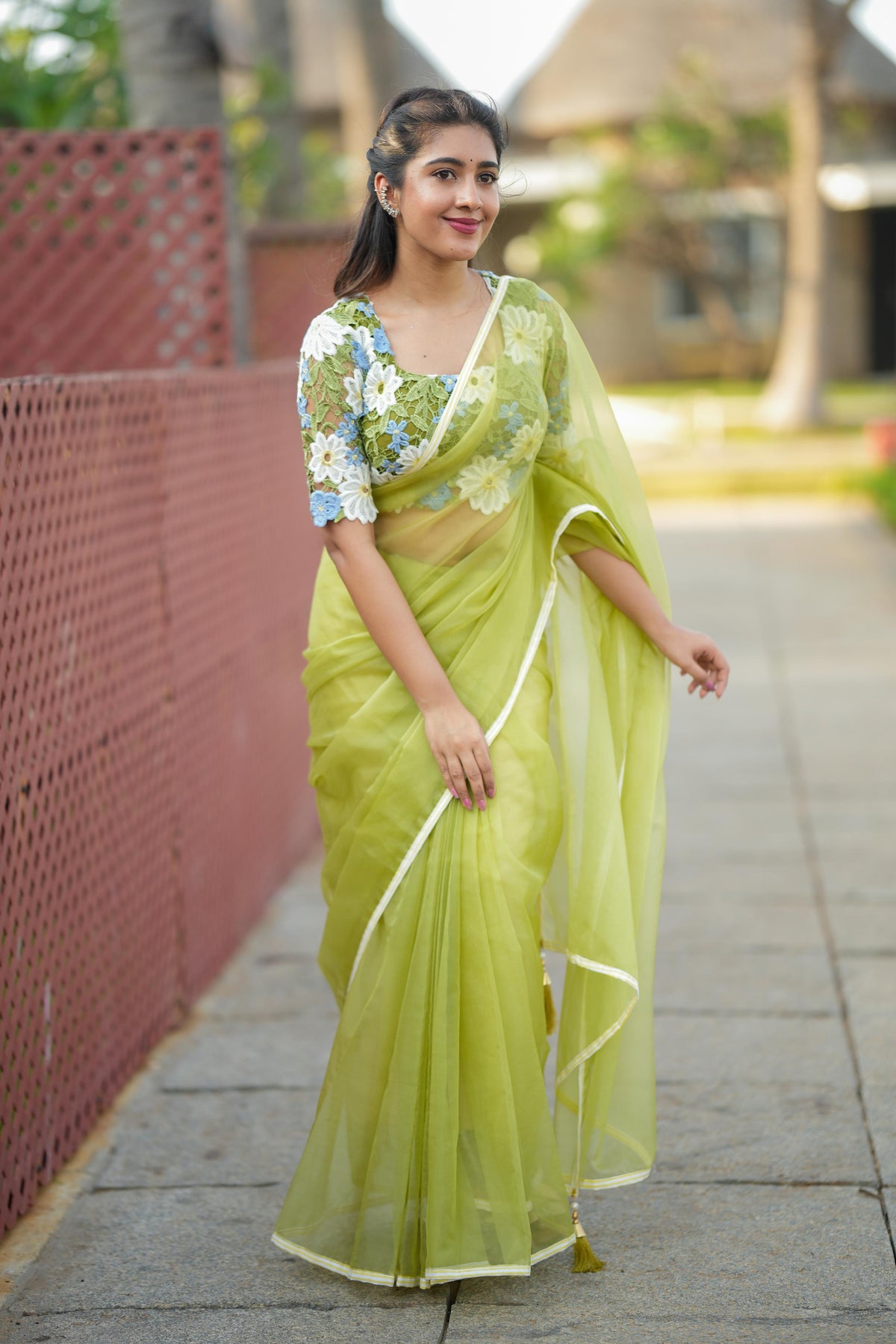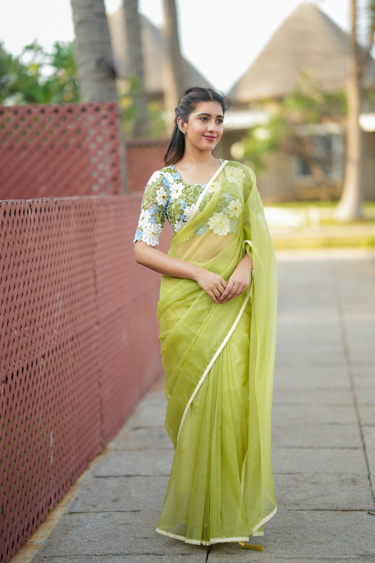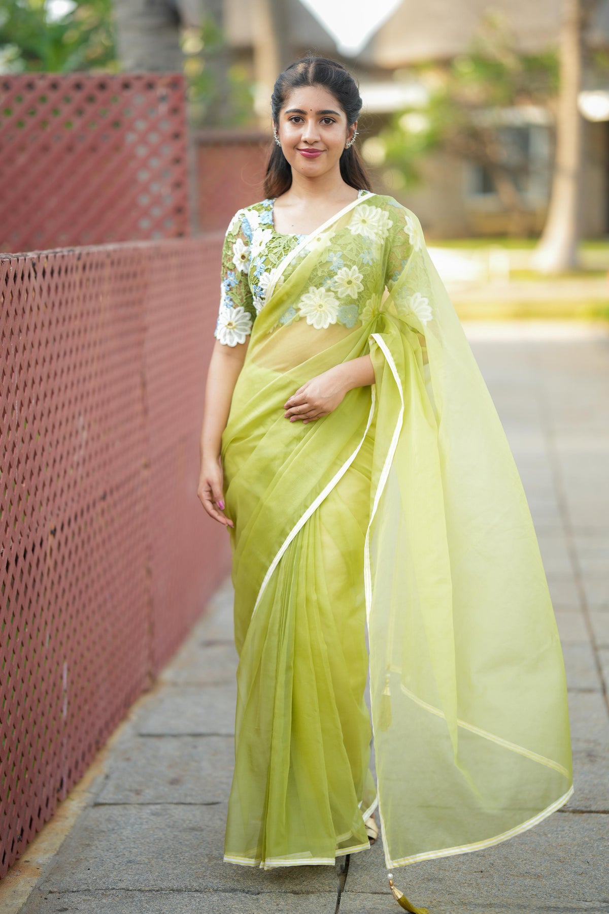 Fresh, playful, and full of main character energy, Elowen Daisy Drip brings a dreamy garden aesthetic to life. The saree features a rich olive-green drape with a clean, minimal finish—perfect for that effortless, “clean girl” vibe.