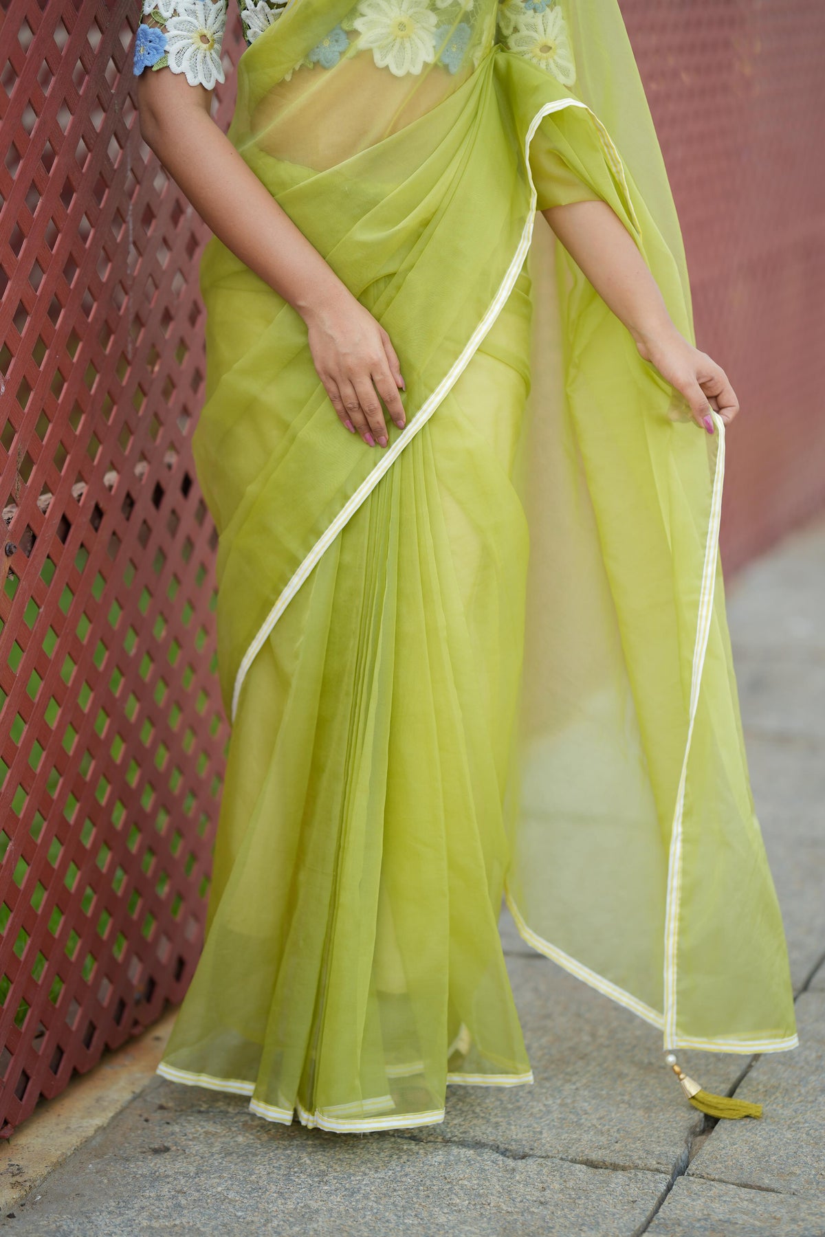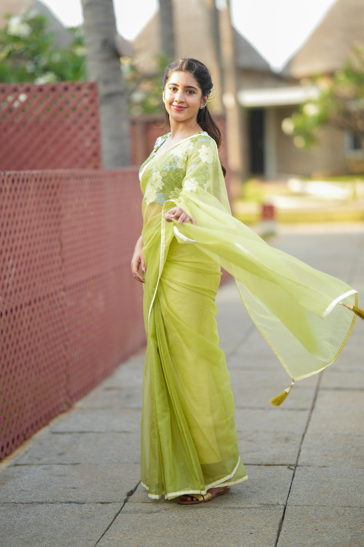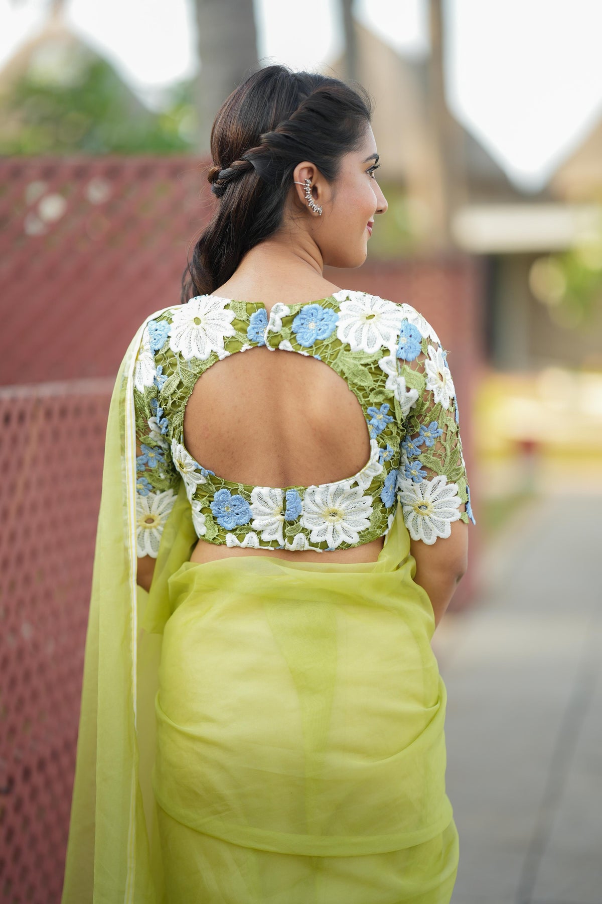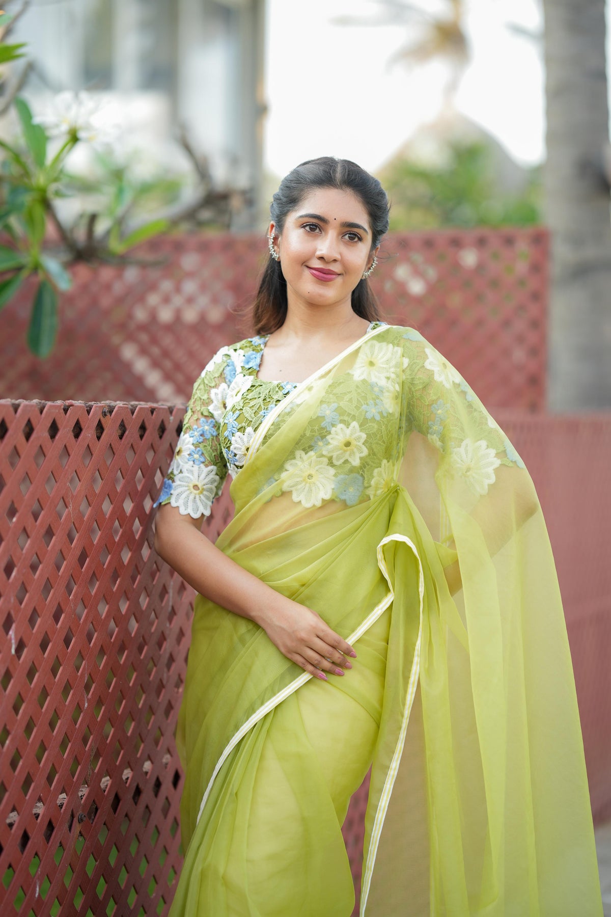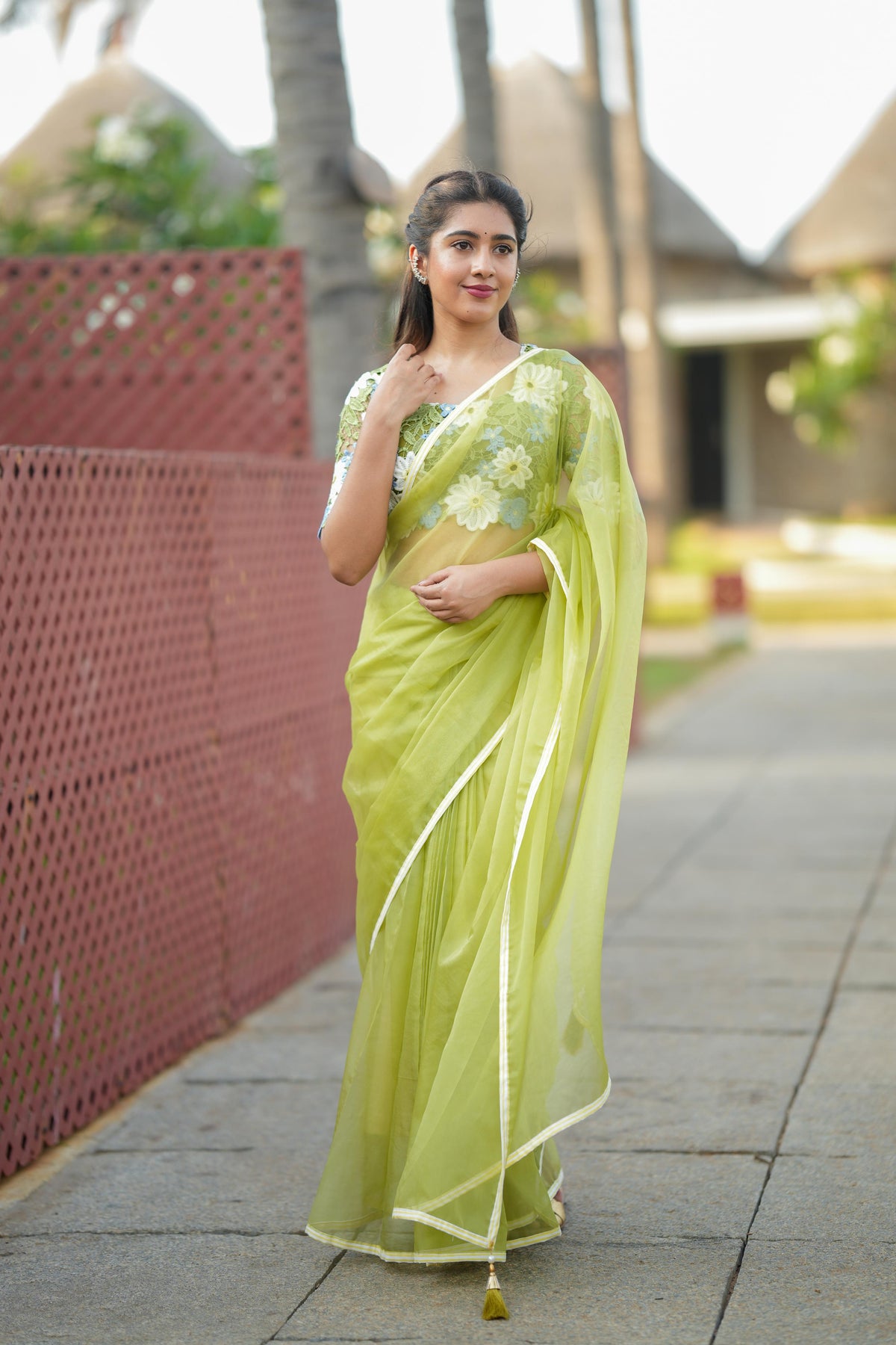 Fresh, playful, and full of main character energy, Elowen Daisy Drip brings a dreamy garden aesthetic to life. The saree features a rich olive-green drape with a clean, minimal finish—perfect for that effortless, “clean girl” vibe.